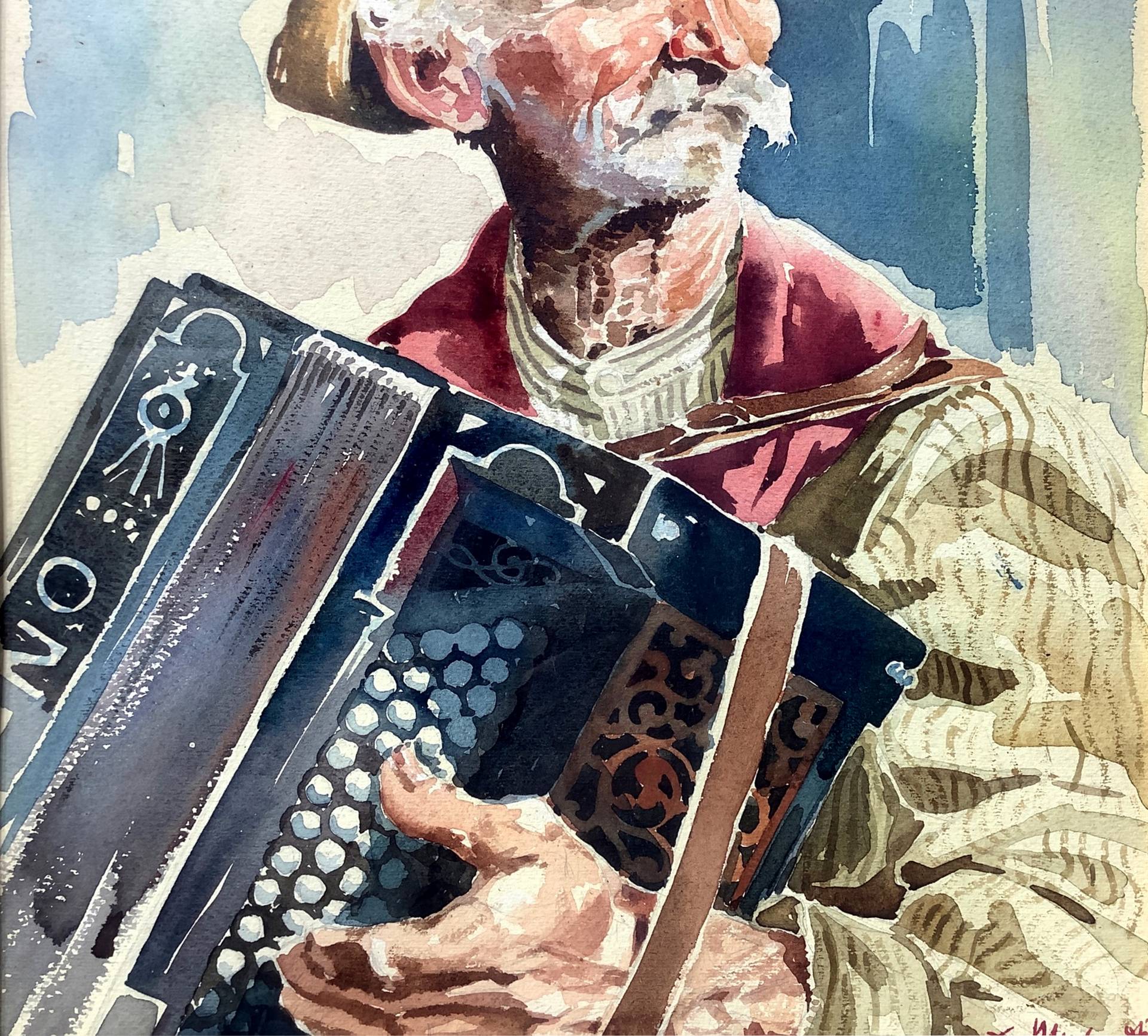 Suonatore di fisarmonica Mm 440x335in cornice cm 61x50 acquarello su carta Firmato in basso a destra e datato ‘48.