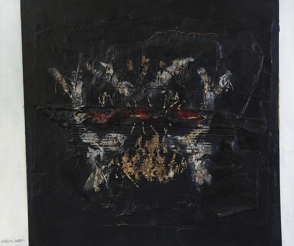 olio, tecnica mista e collage su faesite cm. 80x95, firma in basso a sinistra, dichiarazione d'autenticità dell'artista su foto.