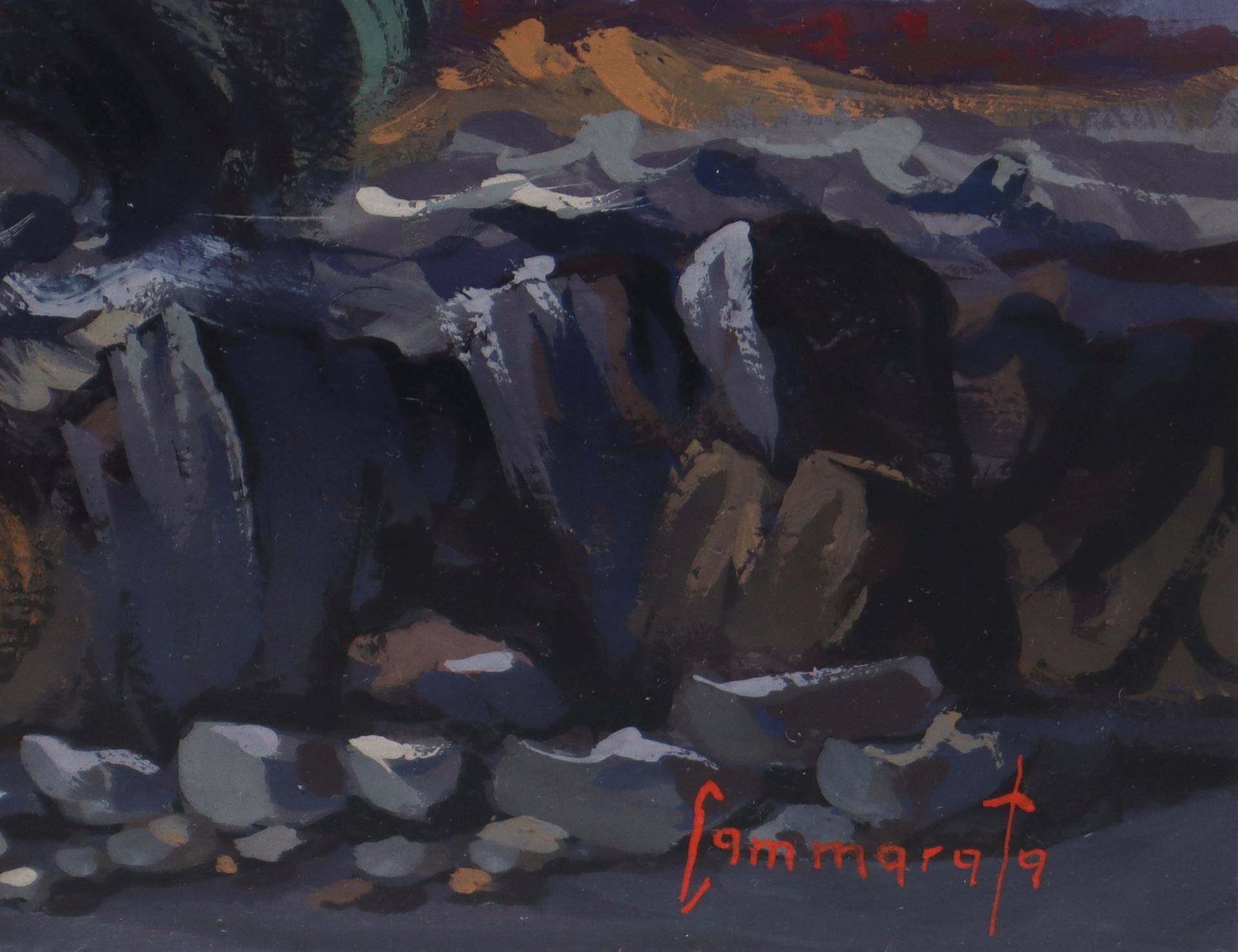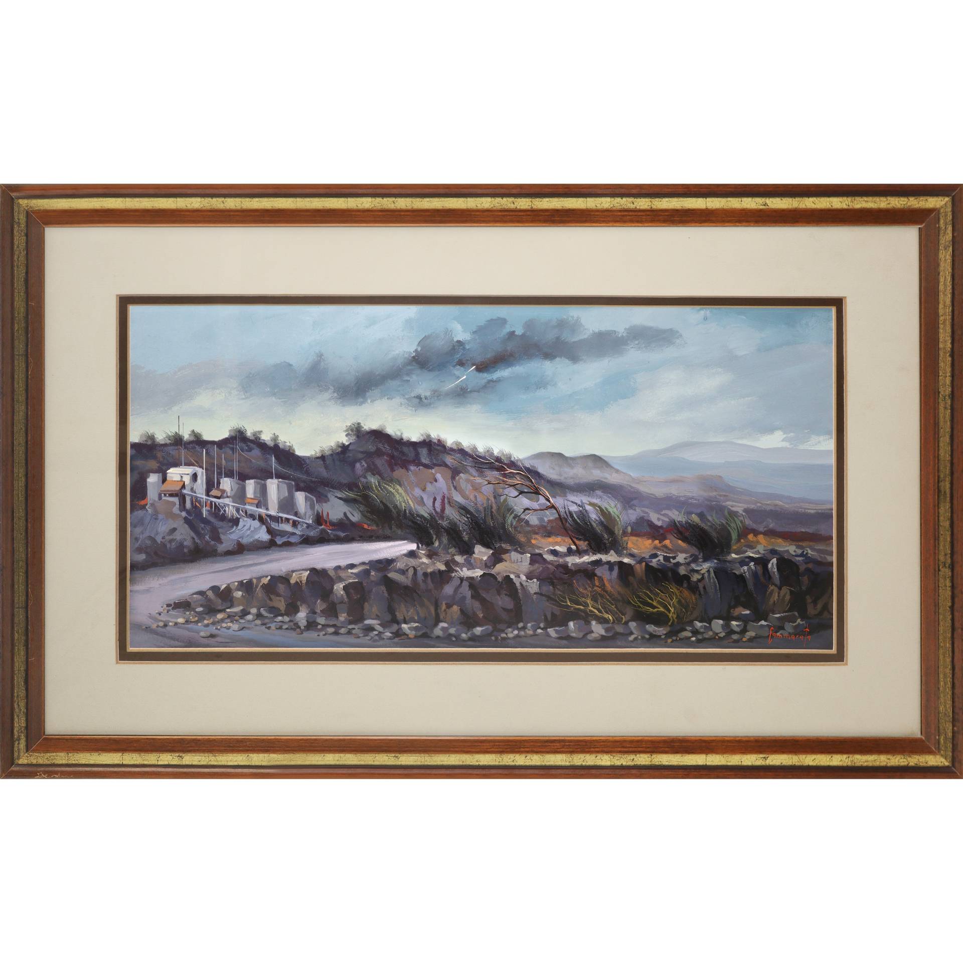 Lucio Cammarata (1935-1989) - Paesaggio etneo su strada H cm 50x70 - in cornice H cm 60x95 Olio su tavola Firmato in basso a destra.