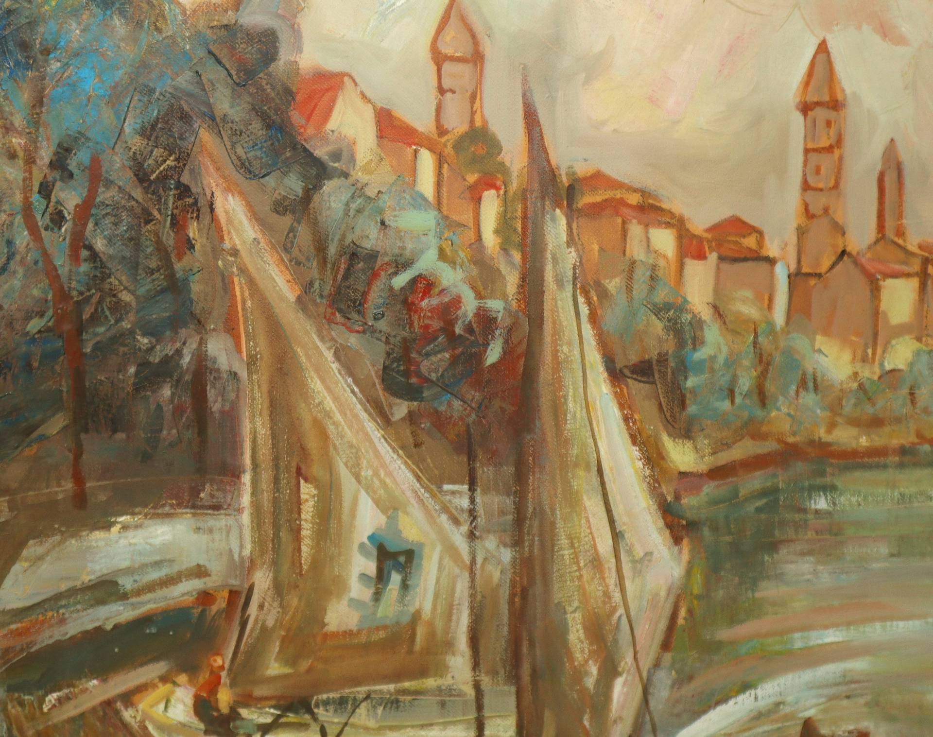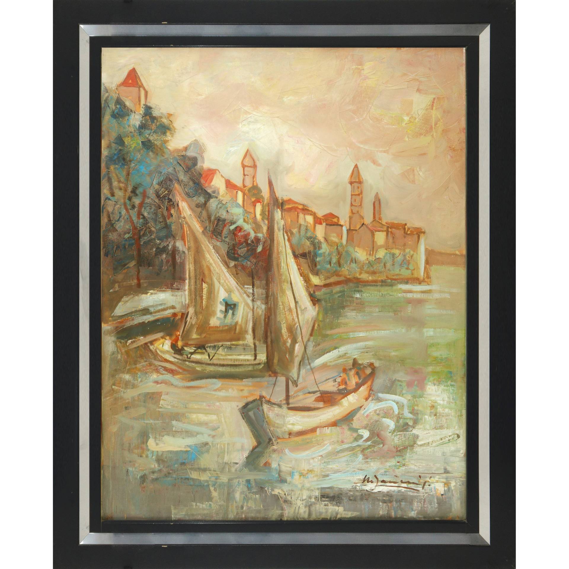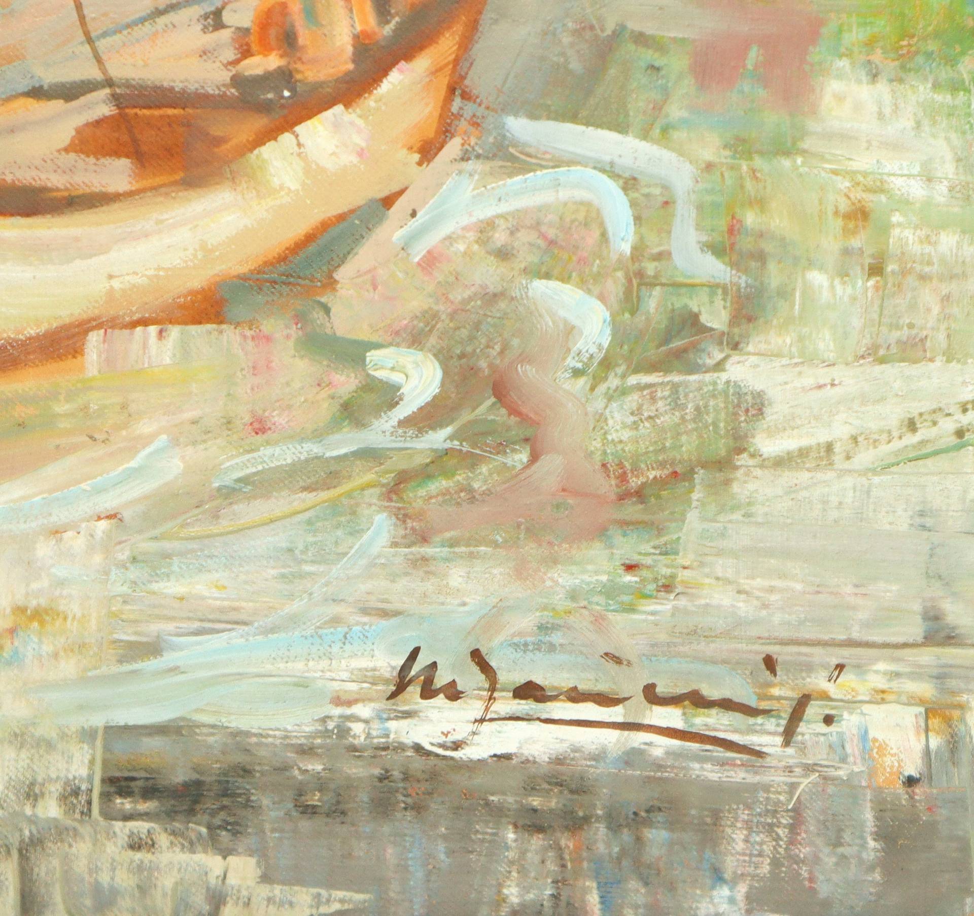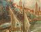 Marina con barca a vela H cm 70x50 - in cornice 82x62 Tecnica mista su tela applicata a masonite Firmato in basso a destra