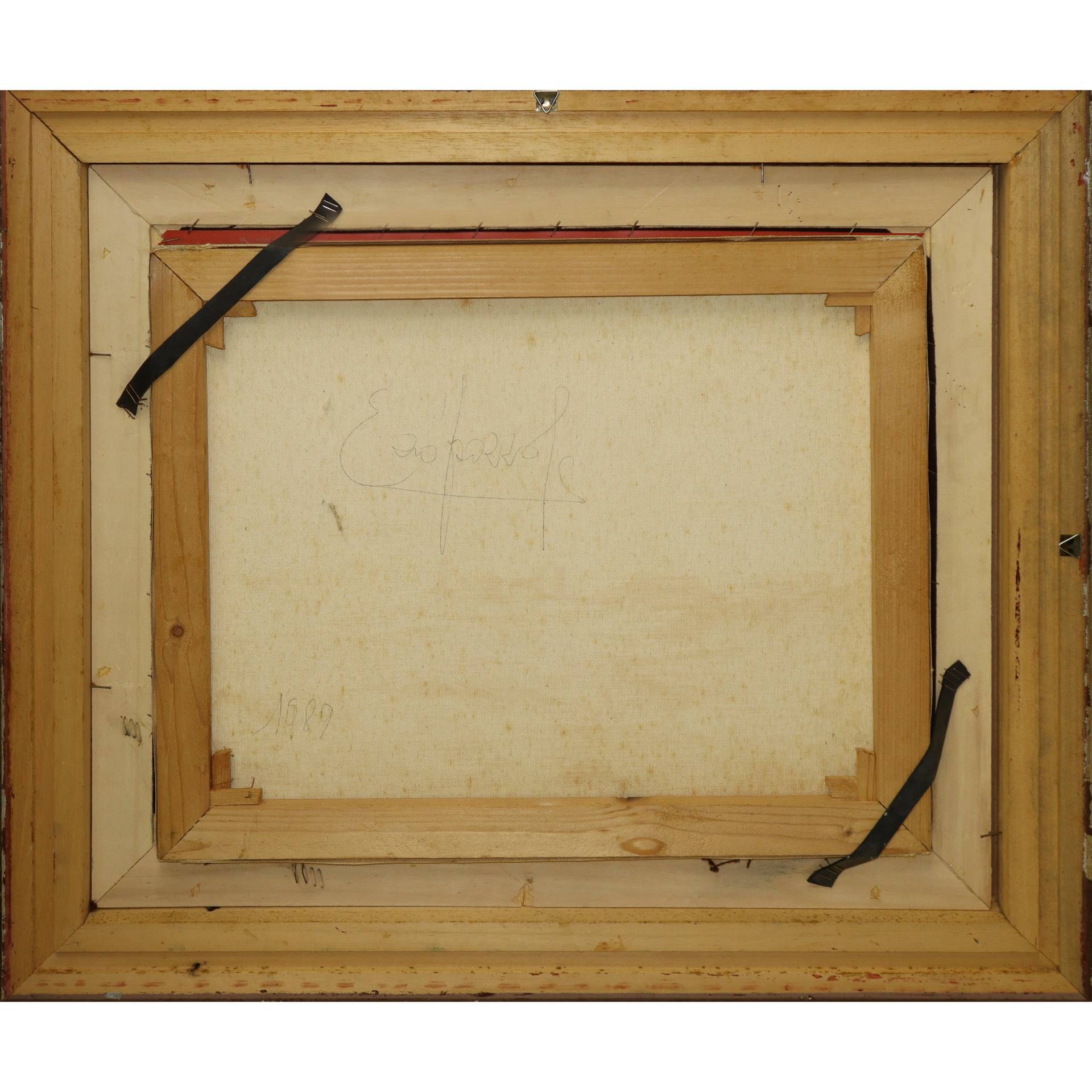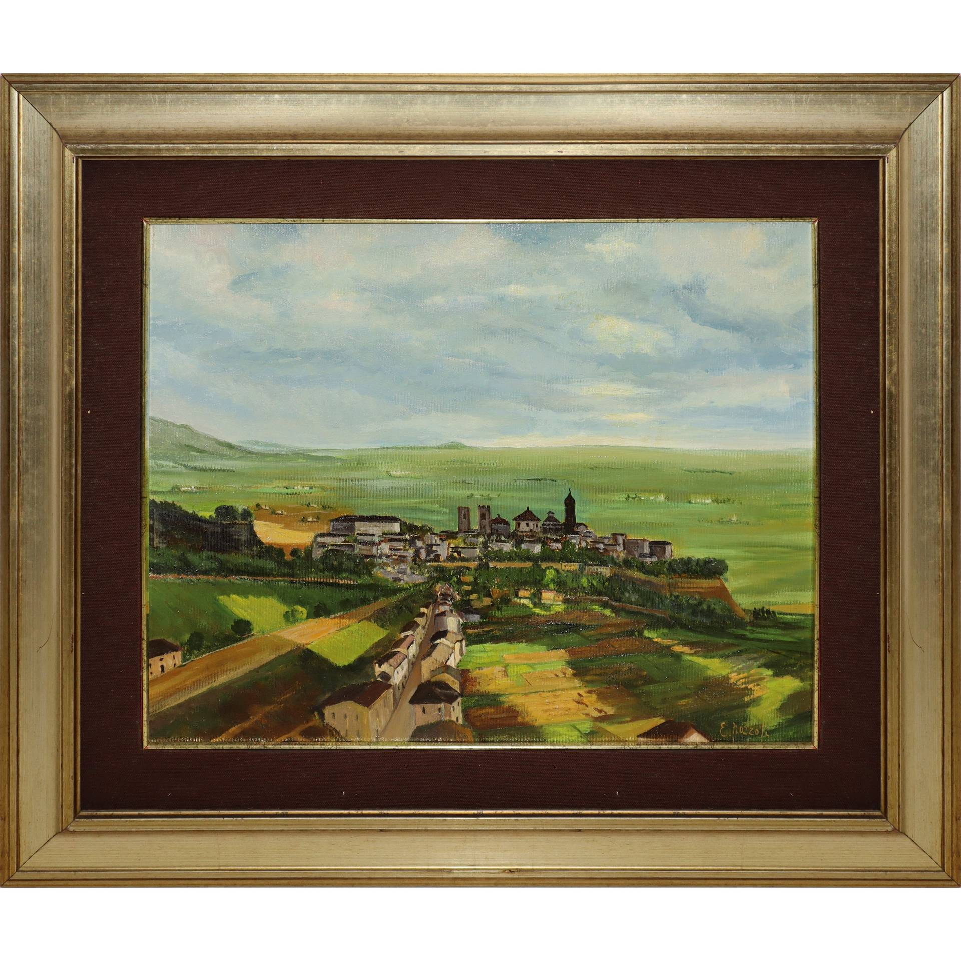 Clemente Pozzali - Paesaggio con paese in pianura, 1989 H cm 40x50 - in cornice H cm 60x70 Olio su tela Firmato in basso a destra. Al retro firmato e datato