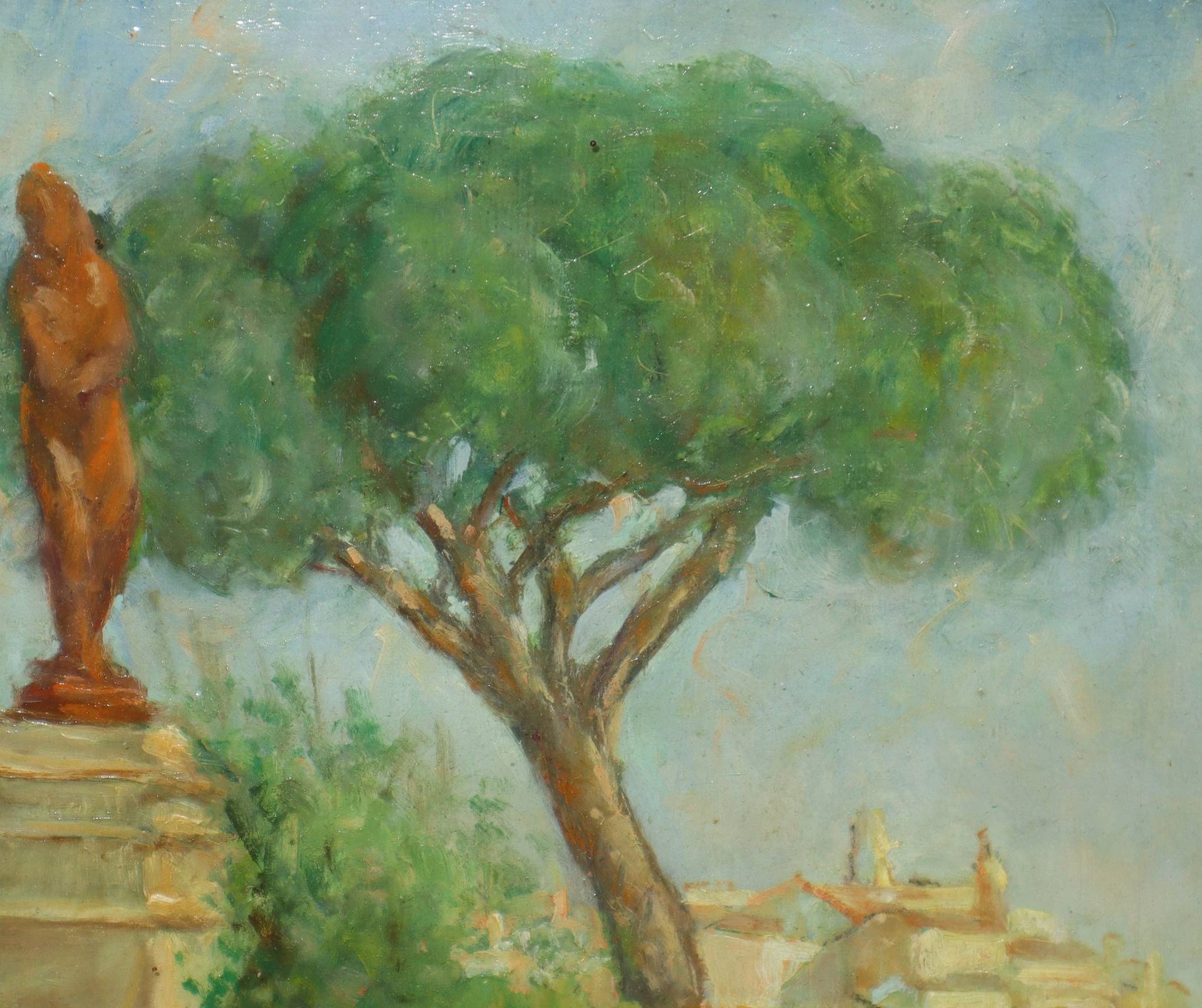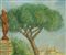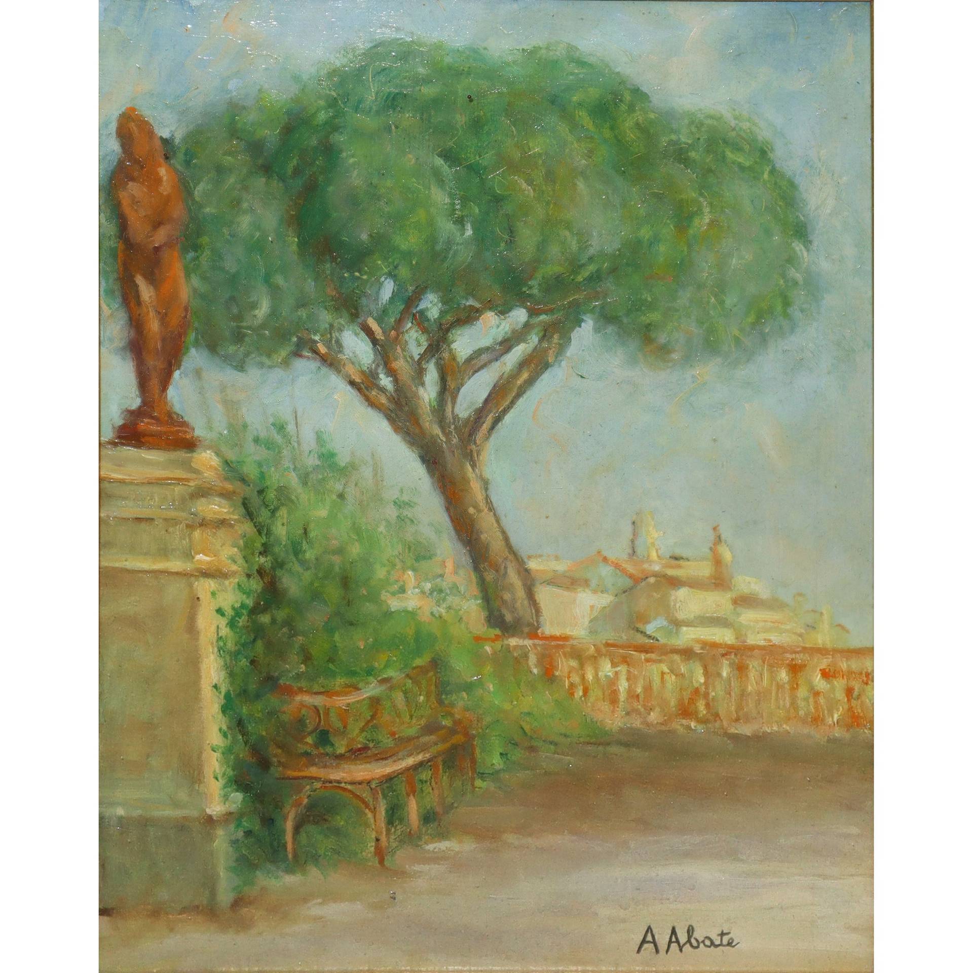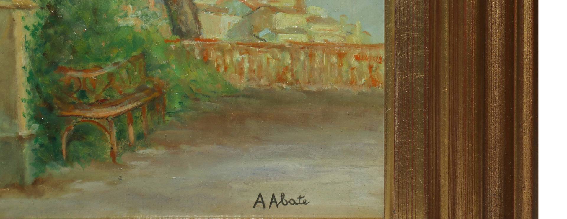 Alberto Abate (Roma 1946-Roma 2012) - Terrazzo con albero con vista di paesaggio H cm 25 x 19 / in cornice 40 x 35 Olio su tavoletta Firmato in basso a destra A.Abate.