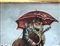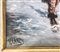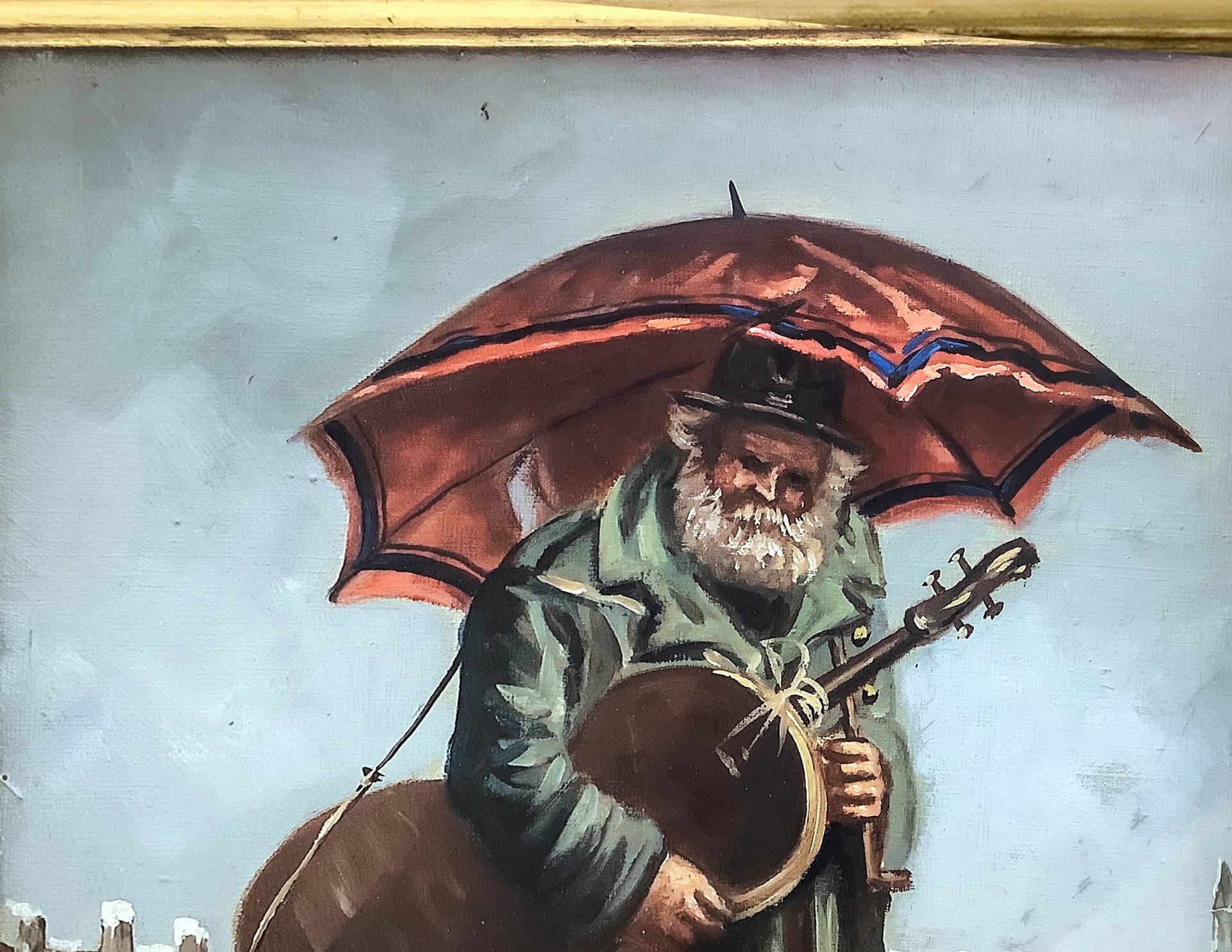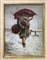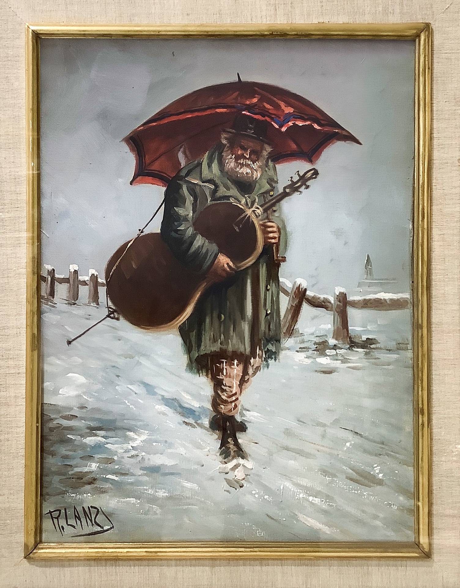 Uomo anziano con ombrello e violoncello su paesaggio innevato cm 40 x 30 in cornice cm. 57 x 47 Olio su tela