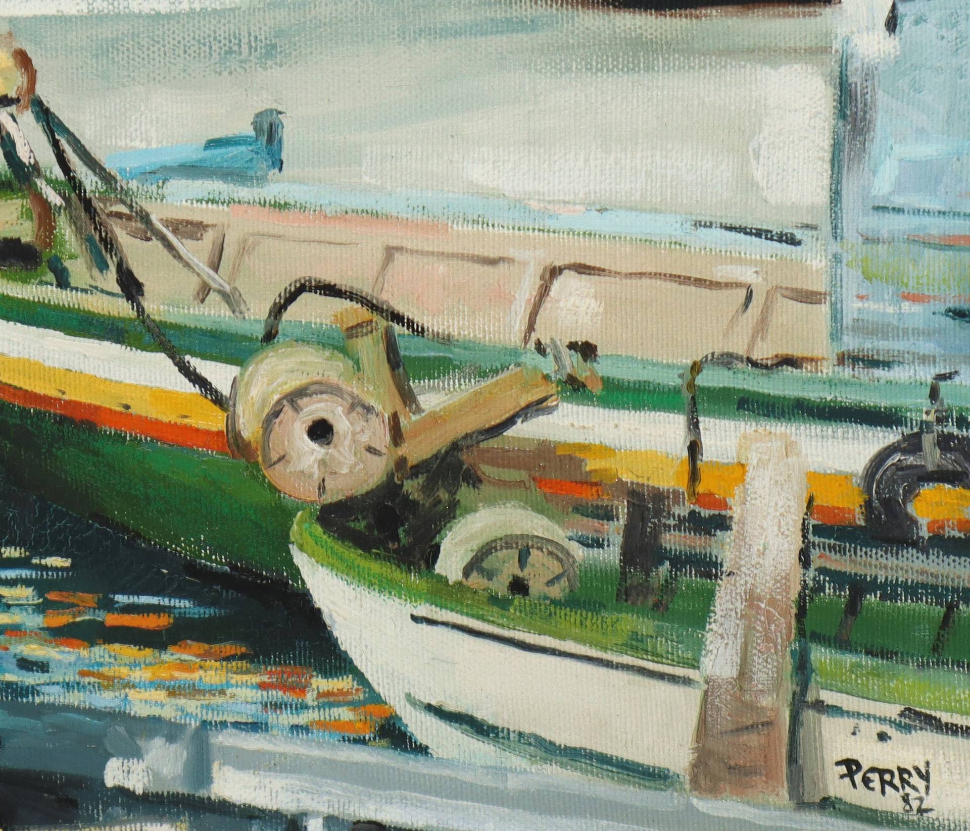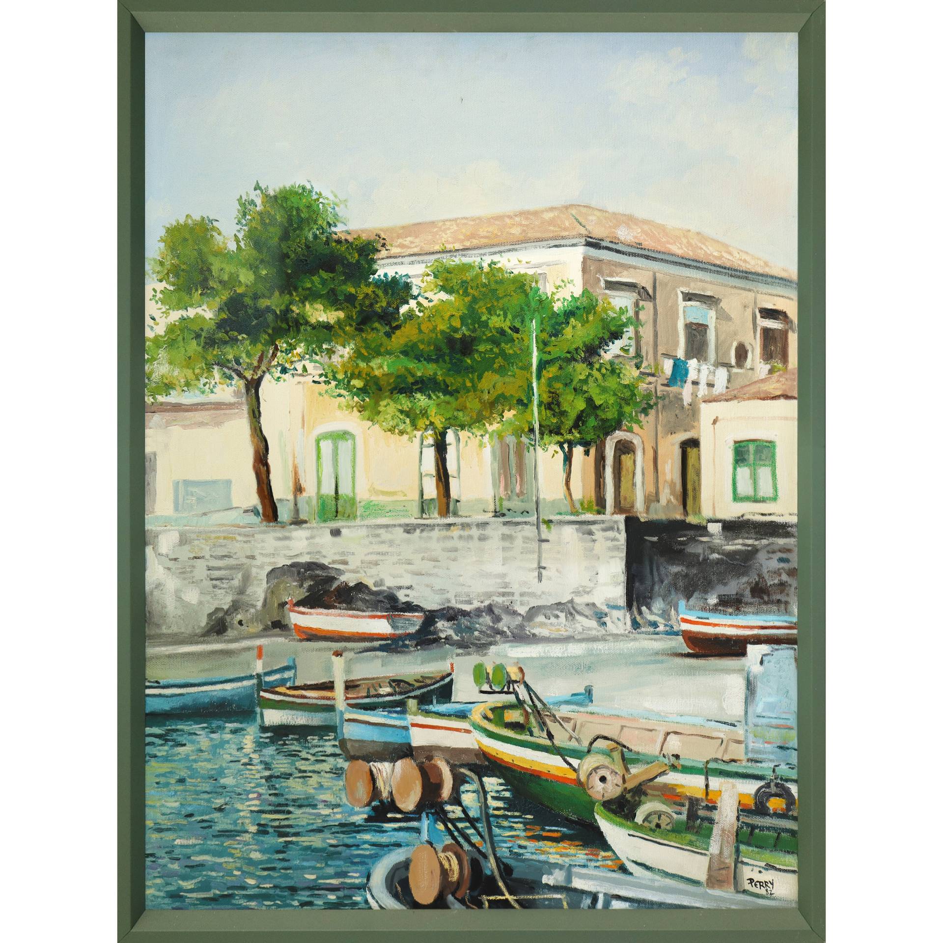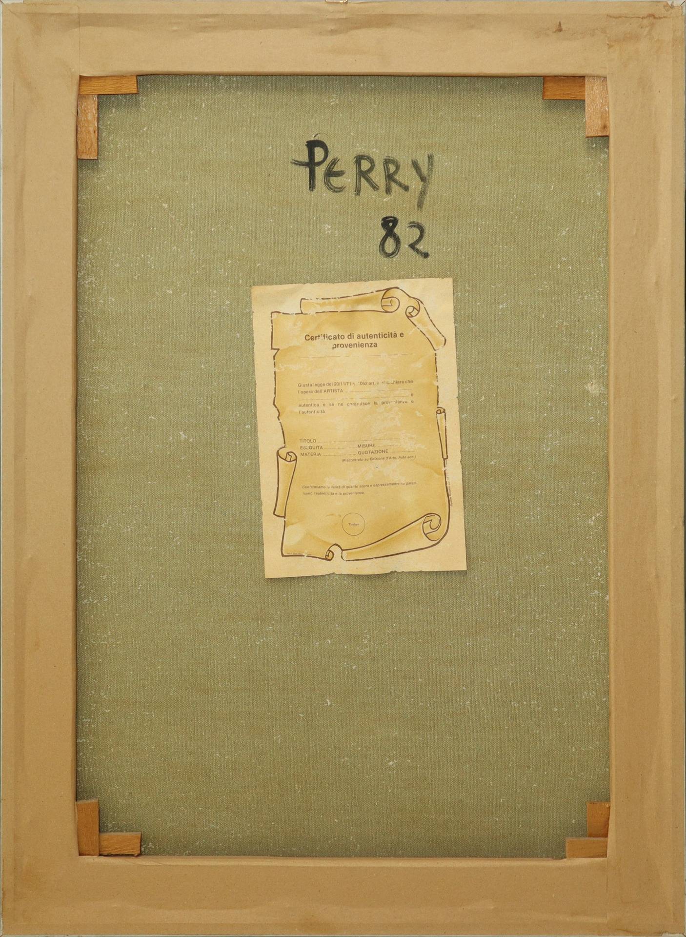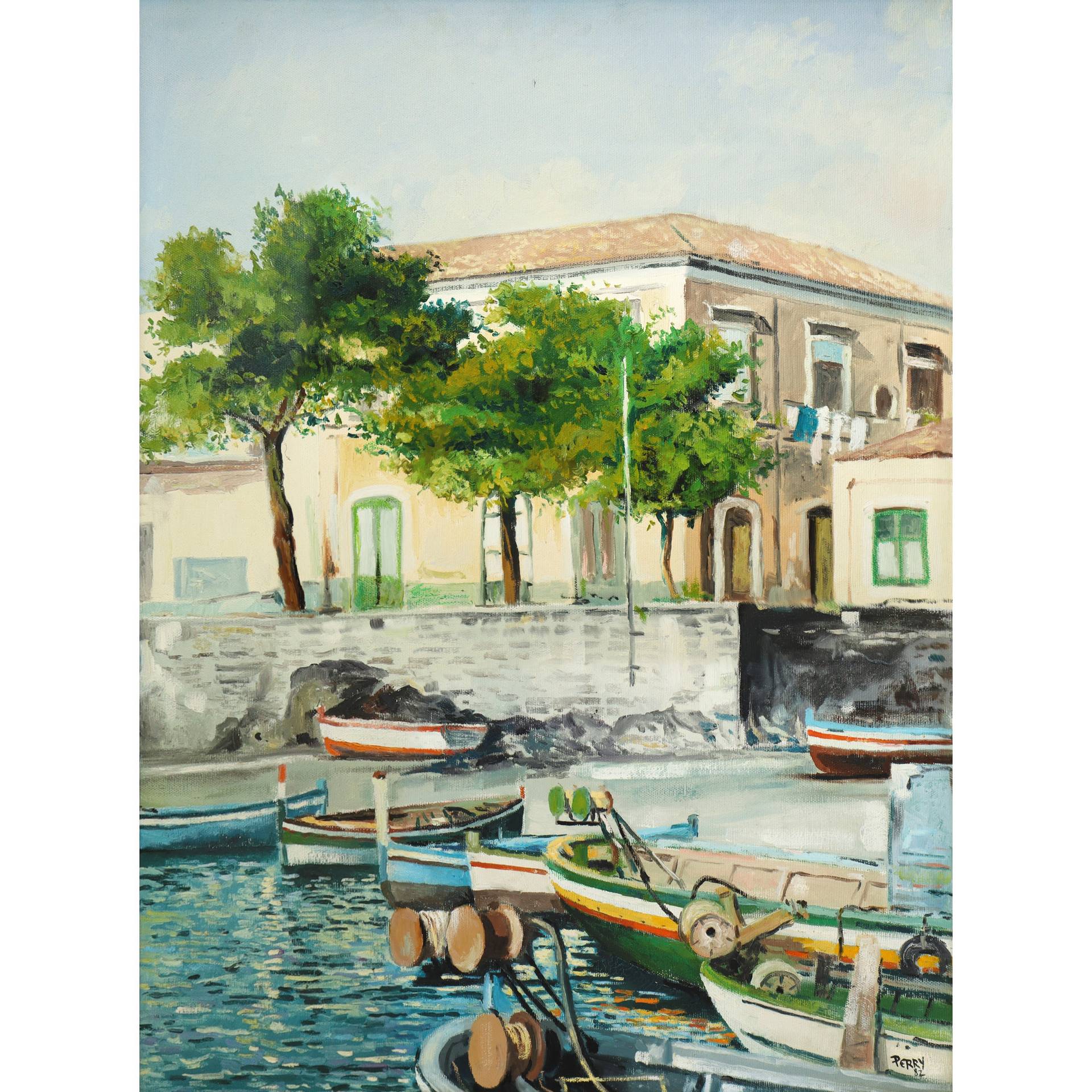 Marina con barche e case, 1982 H cm 73x53 Firmata Perry in basso a destra. Al retro firmato e datato 82.Firmata Perry in basso a destra. Al retro firmato e datato 82.