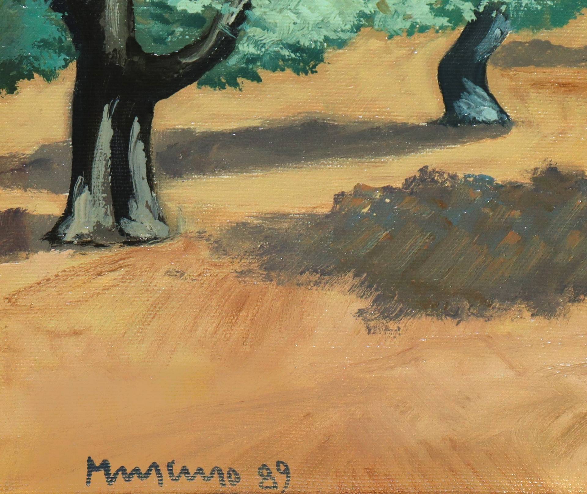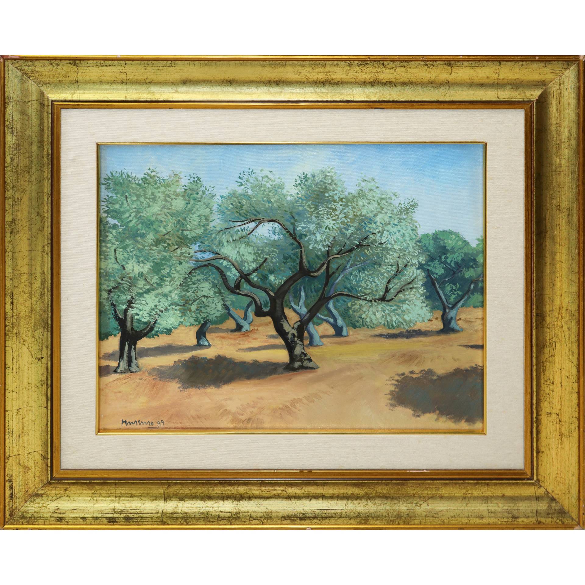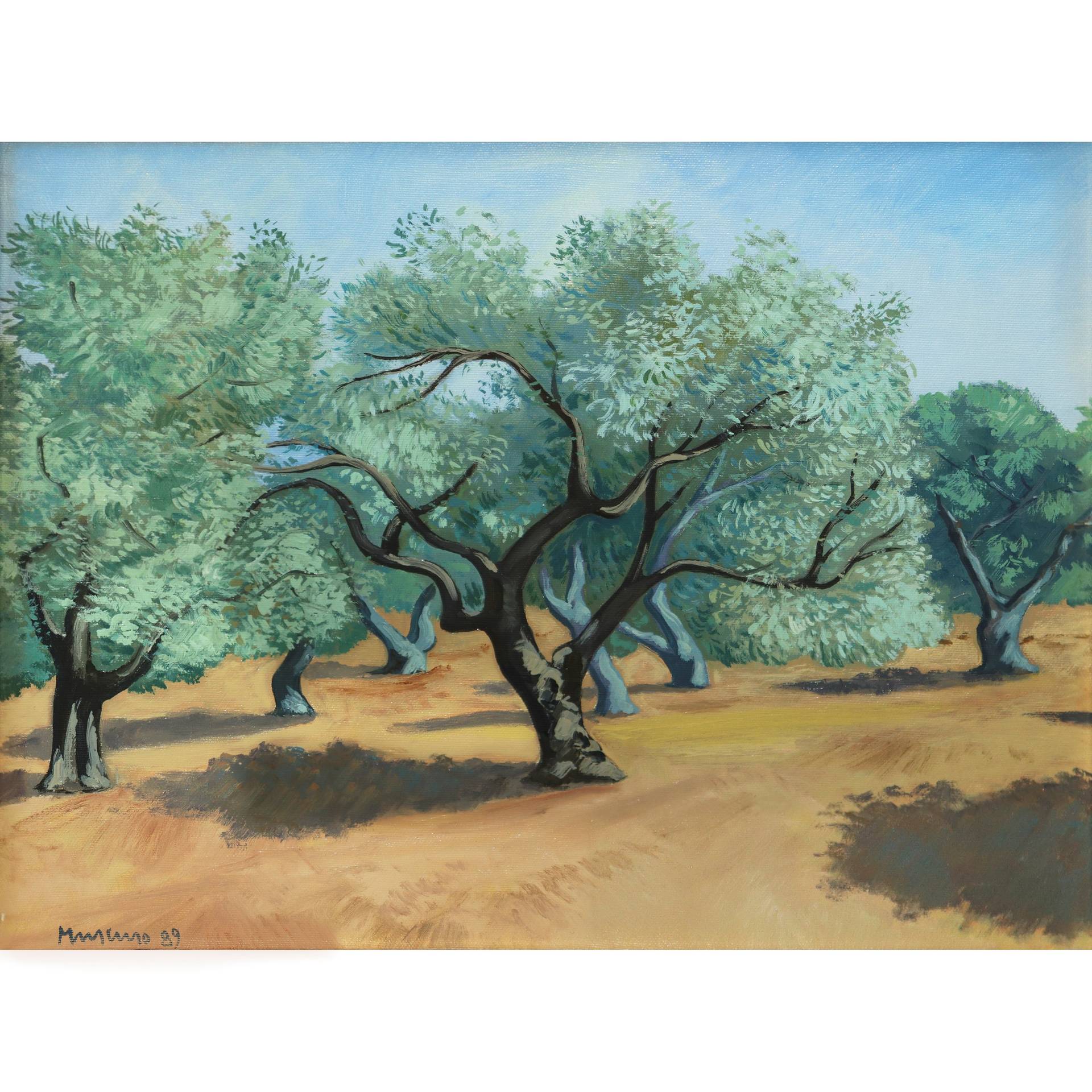 Carmelo Muscuso (Catania 1910-Catania 2003) - Alberi di ulivo, 1989 H cm 30x40 - in cornice H cm 62x72 Olio su tela. Firma e data in basso a sinistra. Firma al retro