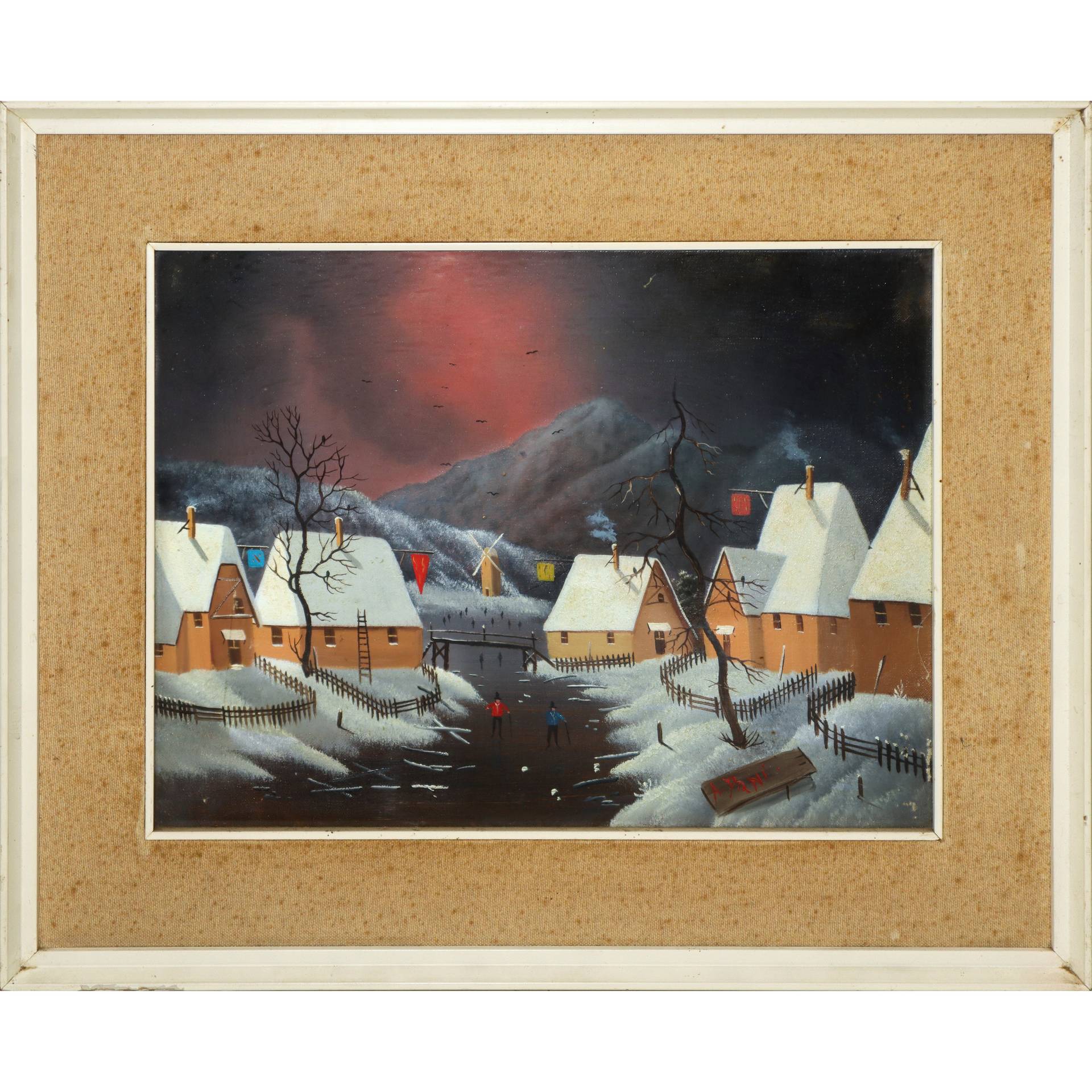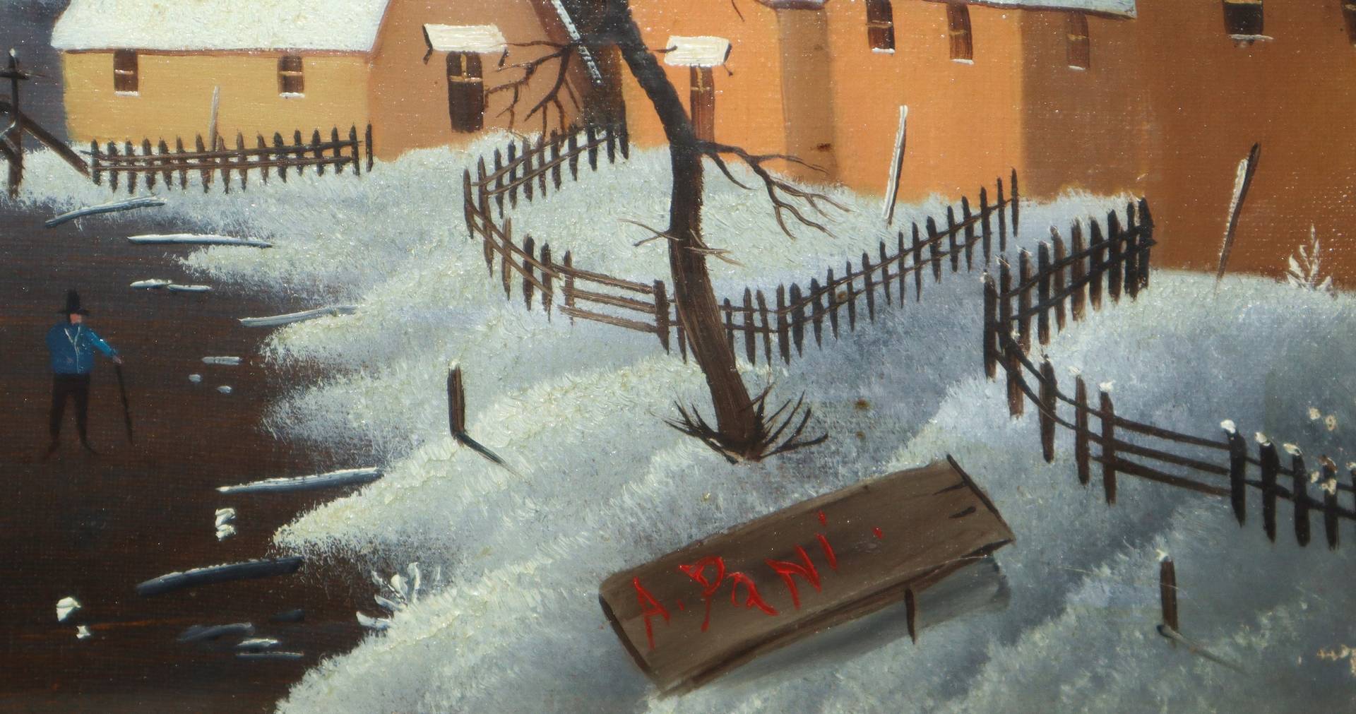 Paesaggio montano innevato con personaggi H cm 30x40 - in cornice H cm 44x54 Tecnica mista su tela Firmato in basso a destra A. Pani