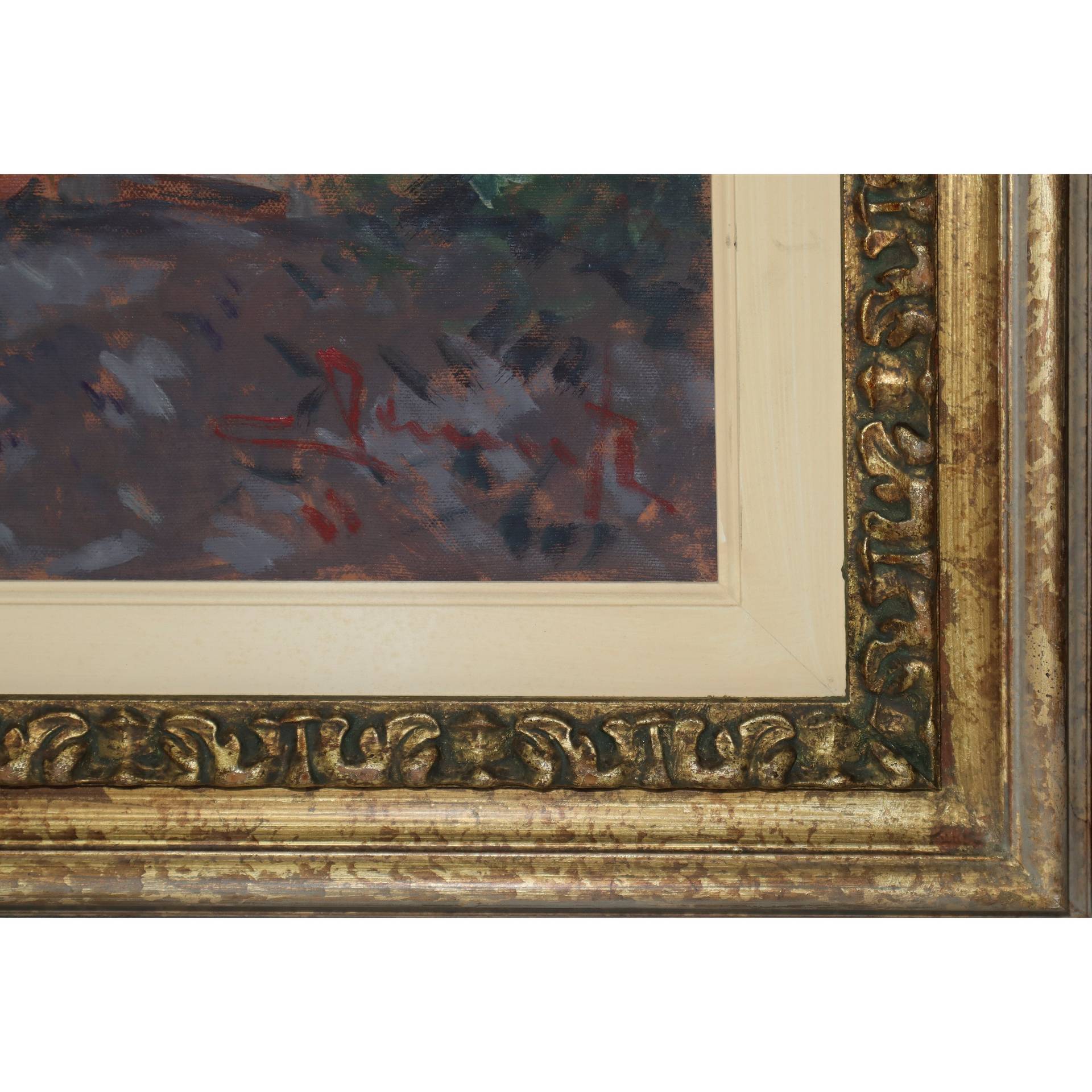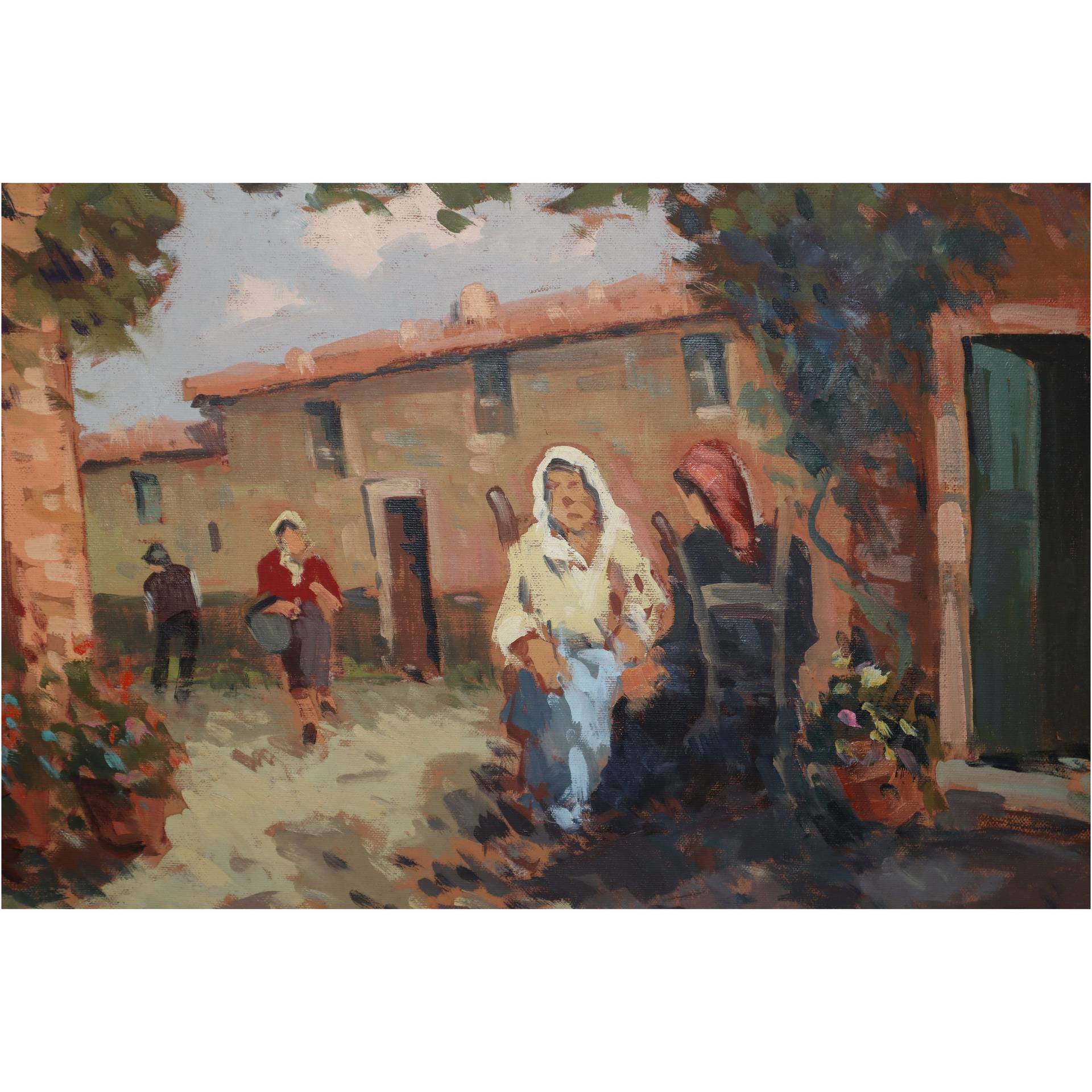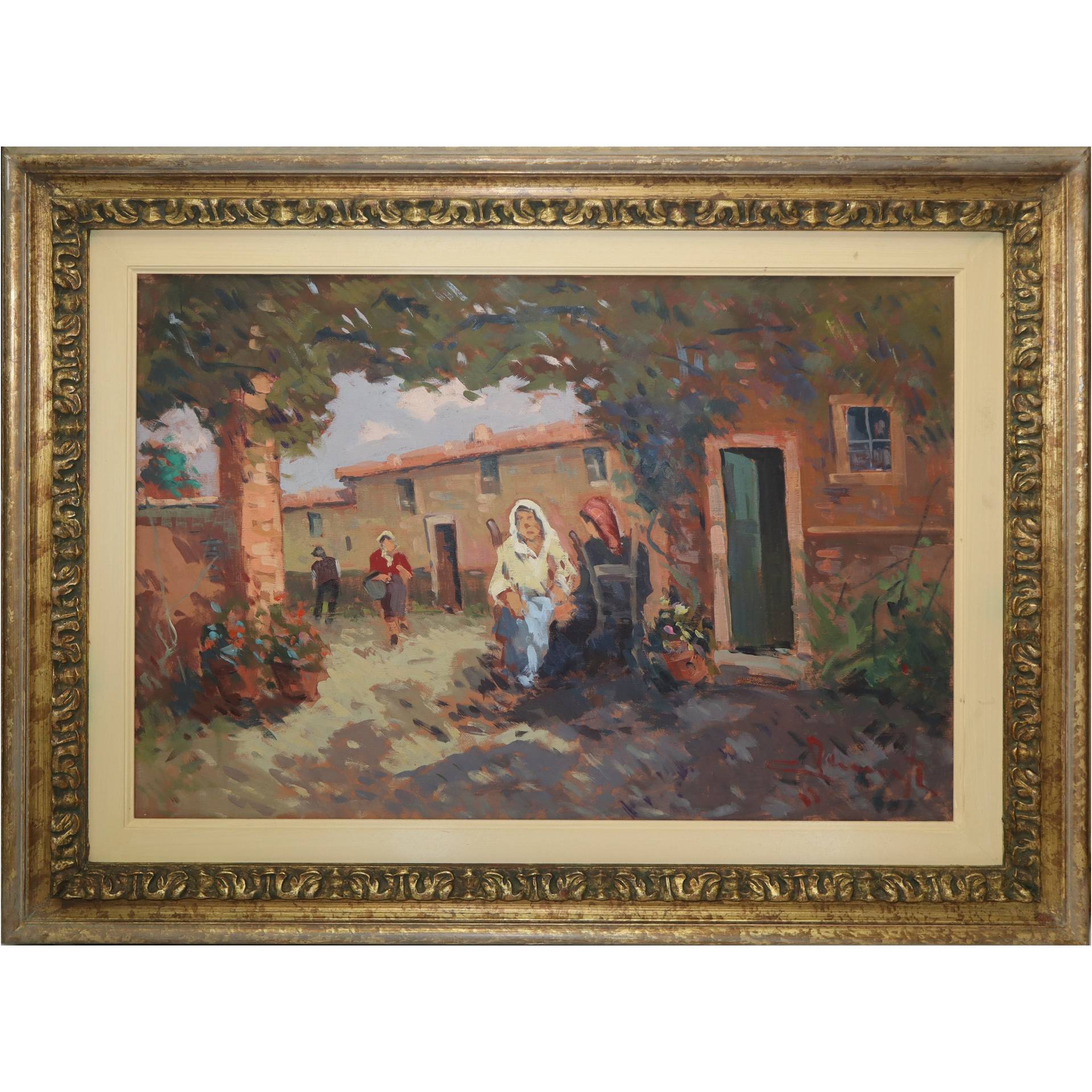 Willy Clemente (1923-1999) - Pergolato cm 50 x 70, in cornice 74 x 94 Olio su tela Paesaggio campestre con personaggi. Firmato in basso a destra e sul retro Clemente