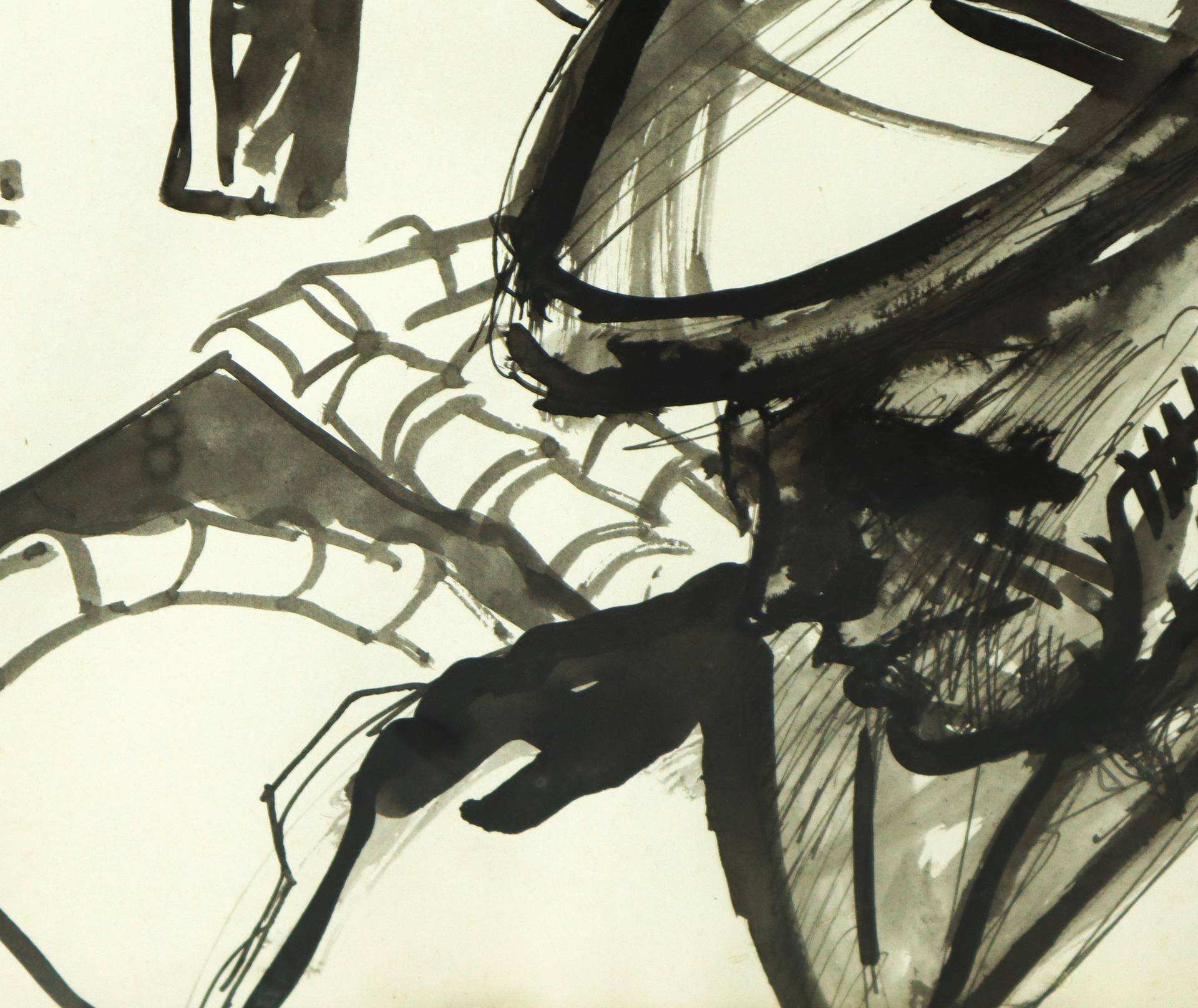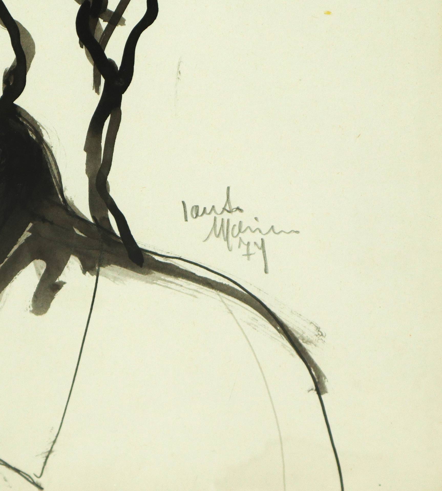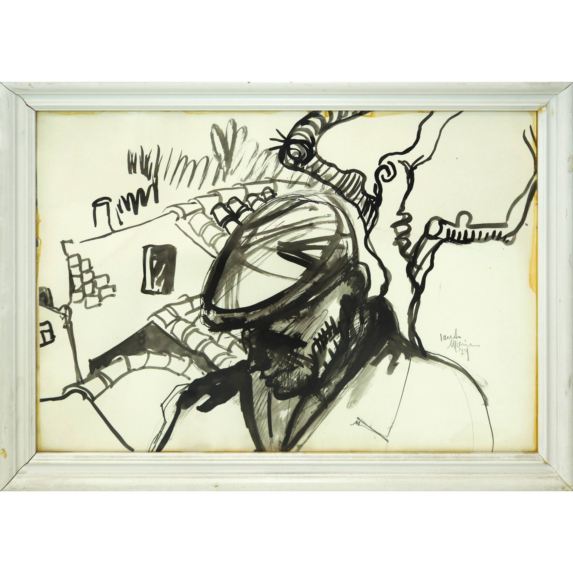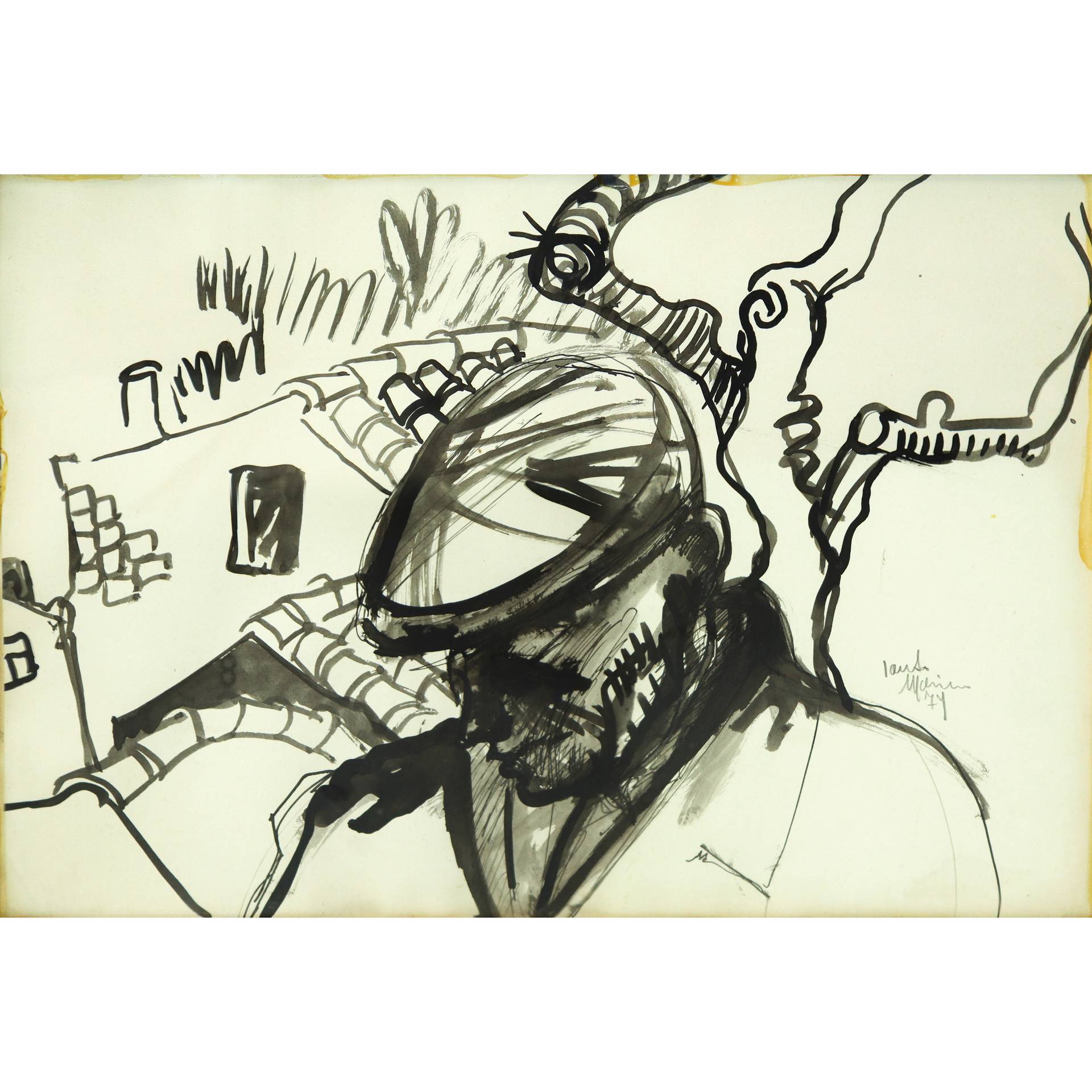 Santo Marino (Militello val di Catania 1924-1991) - Uomo con coppola fra tetti di case, 1979 H cm 42x57 Inchiostro nero su cartoncino Firmato sul lato destro