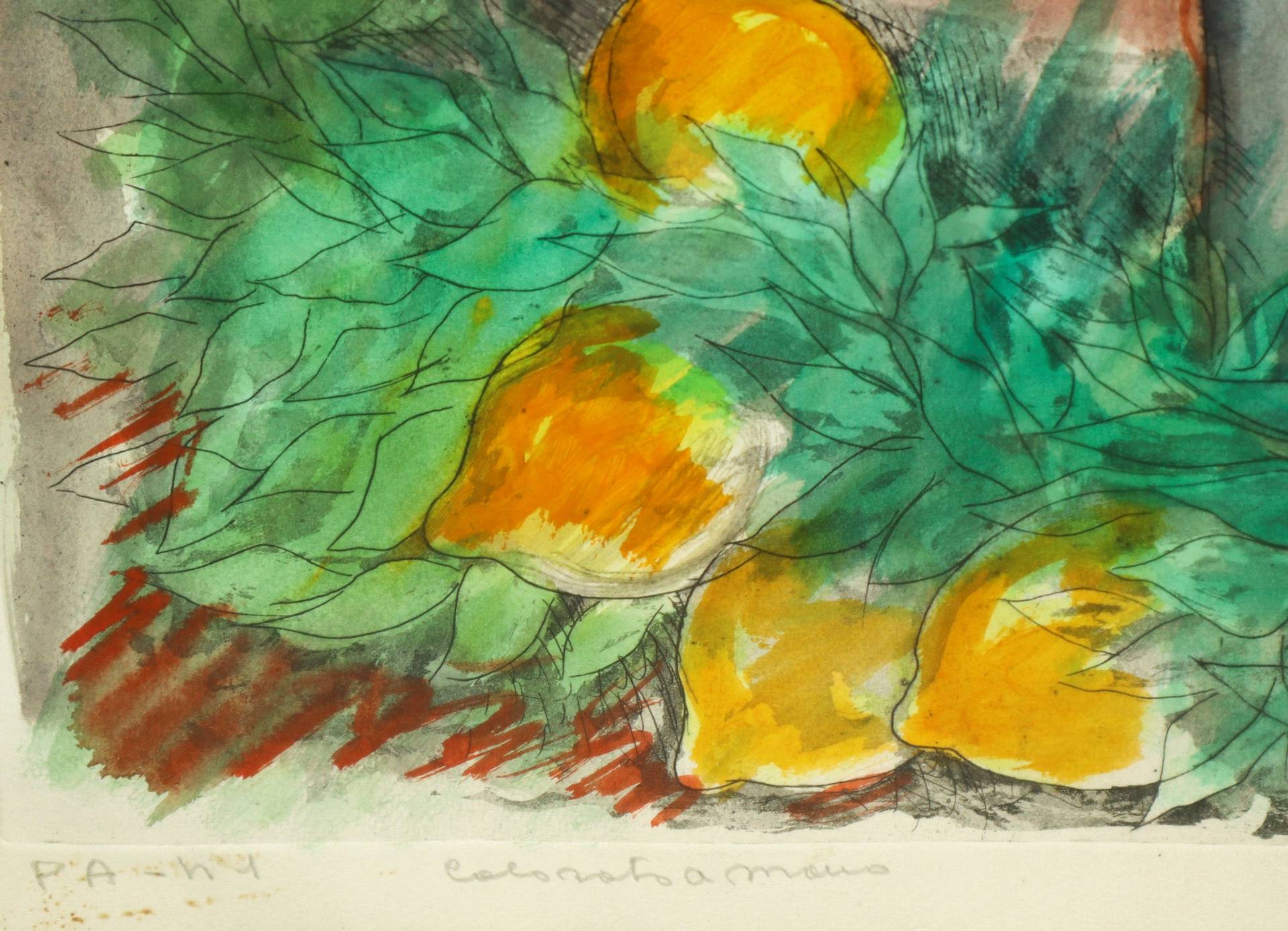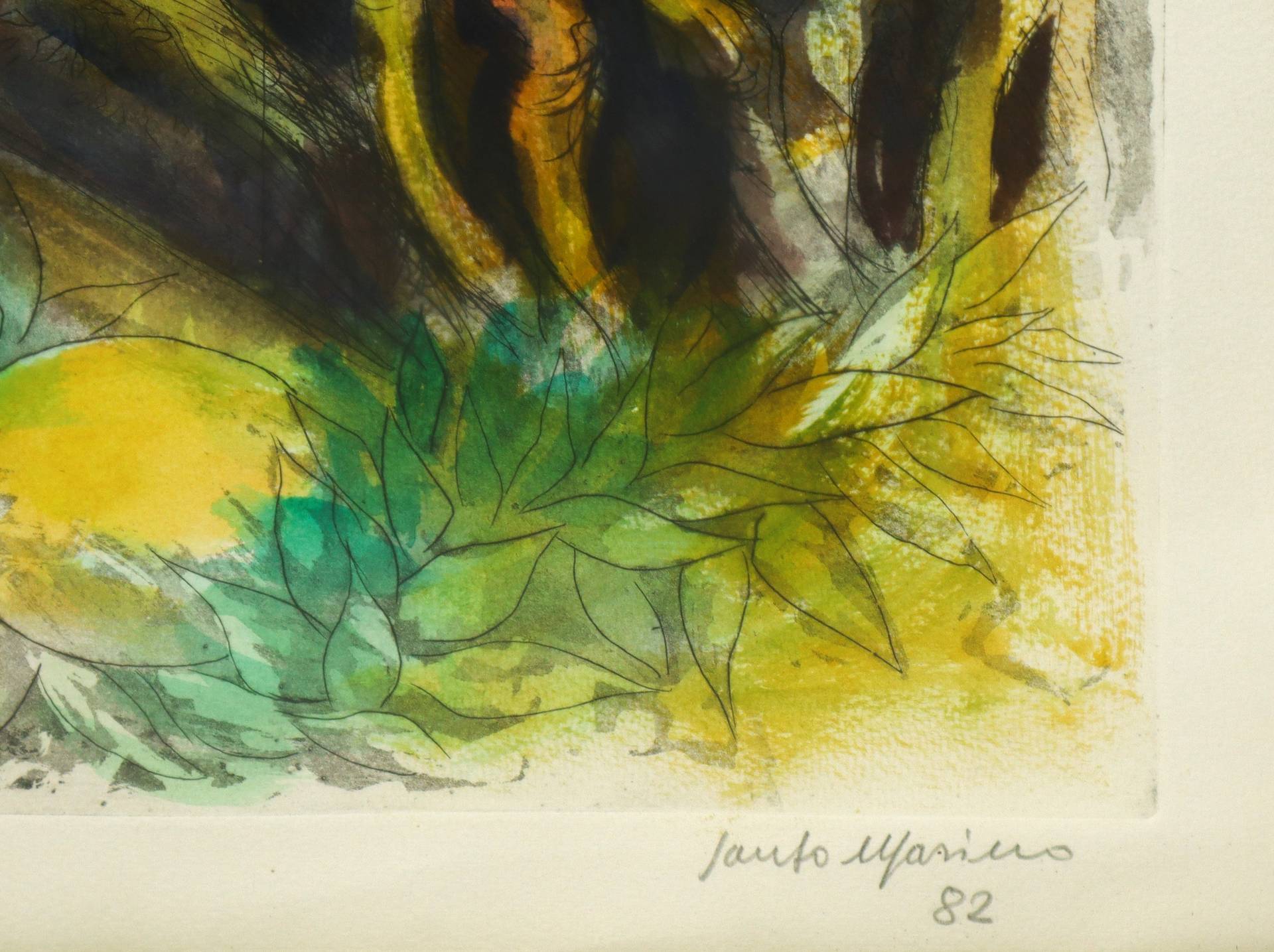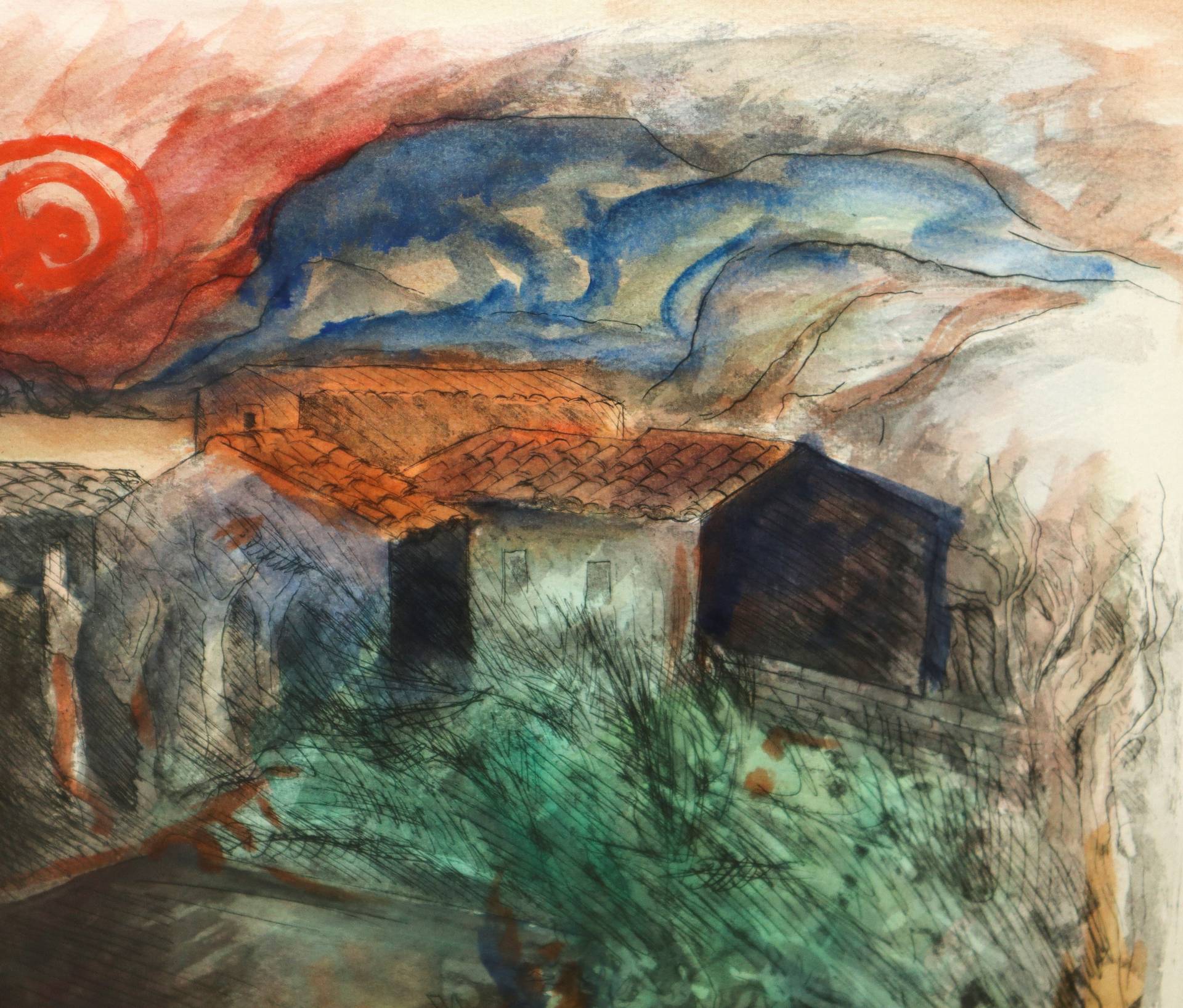 Santo Marino (Militello val di Catania 1924-1991) - Paesaggio con case, alberi e limoni, 1982 H cm 56x76 litografia Prova d'Autore colorata a mano, firmata a destra e datata