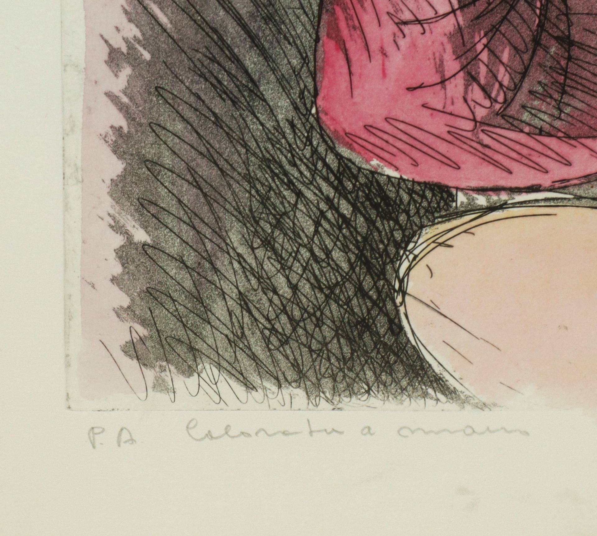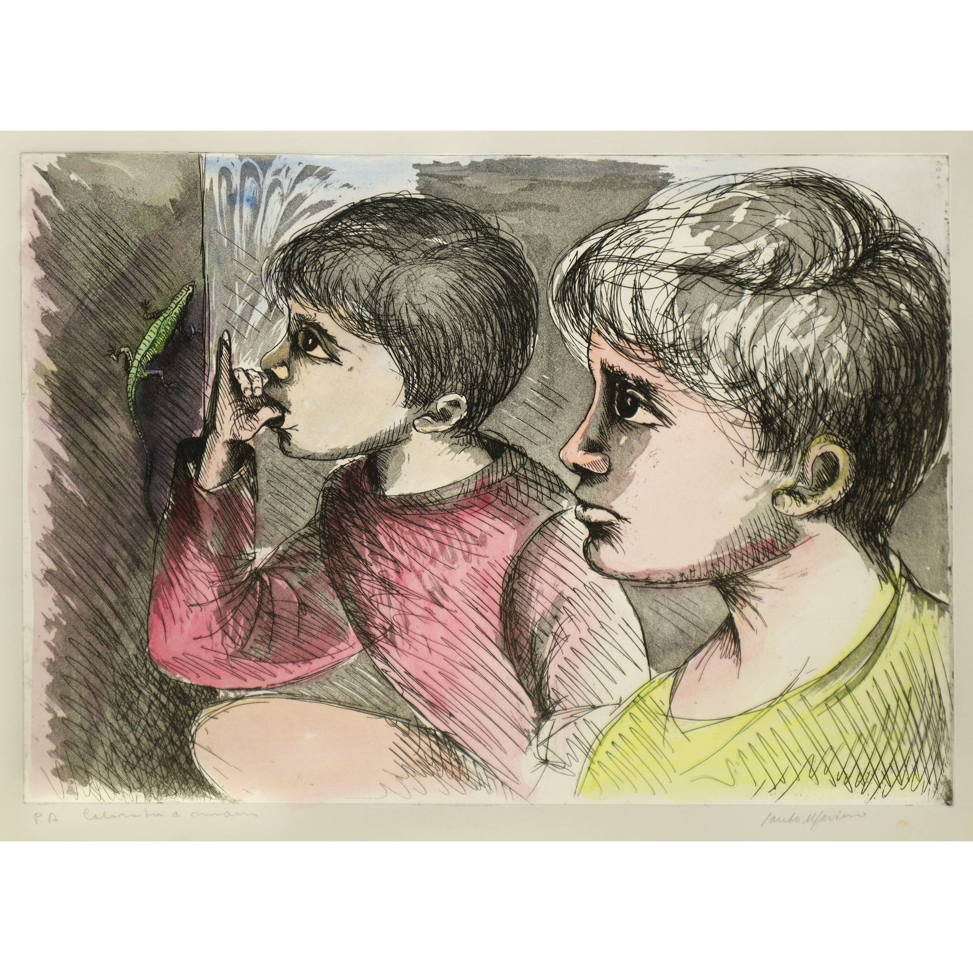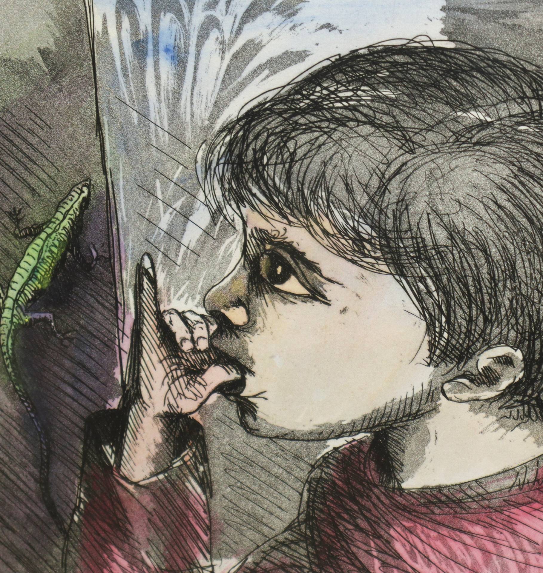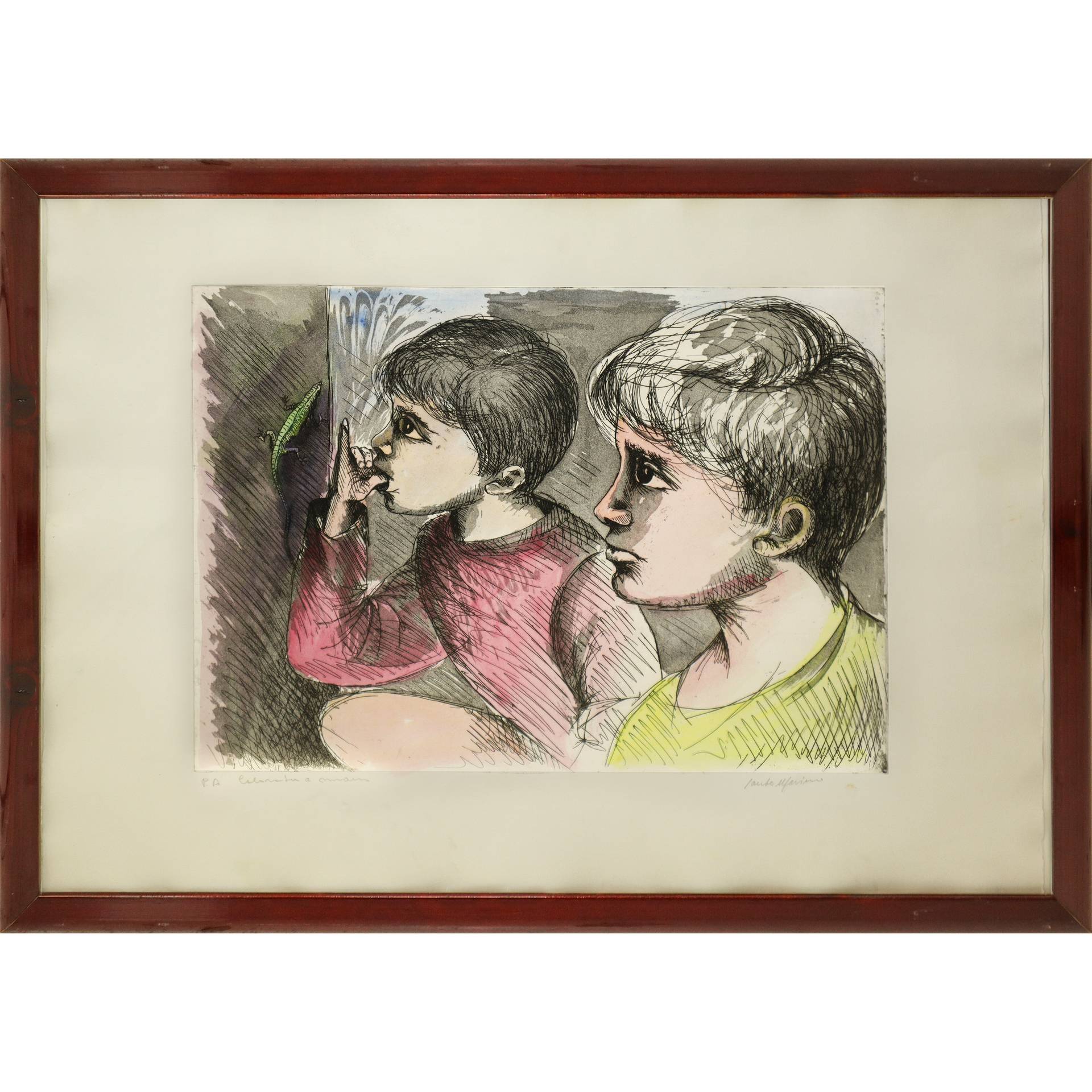 Santo Marino (Militello val di Catania 1924-1991) - Bambino con dito in bocca e lucertola H cm 55x75 litografia Prova d'Autore, firmato Santo Marino, colorato a mano