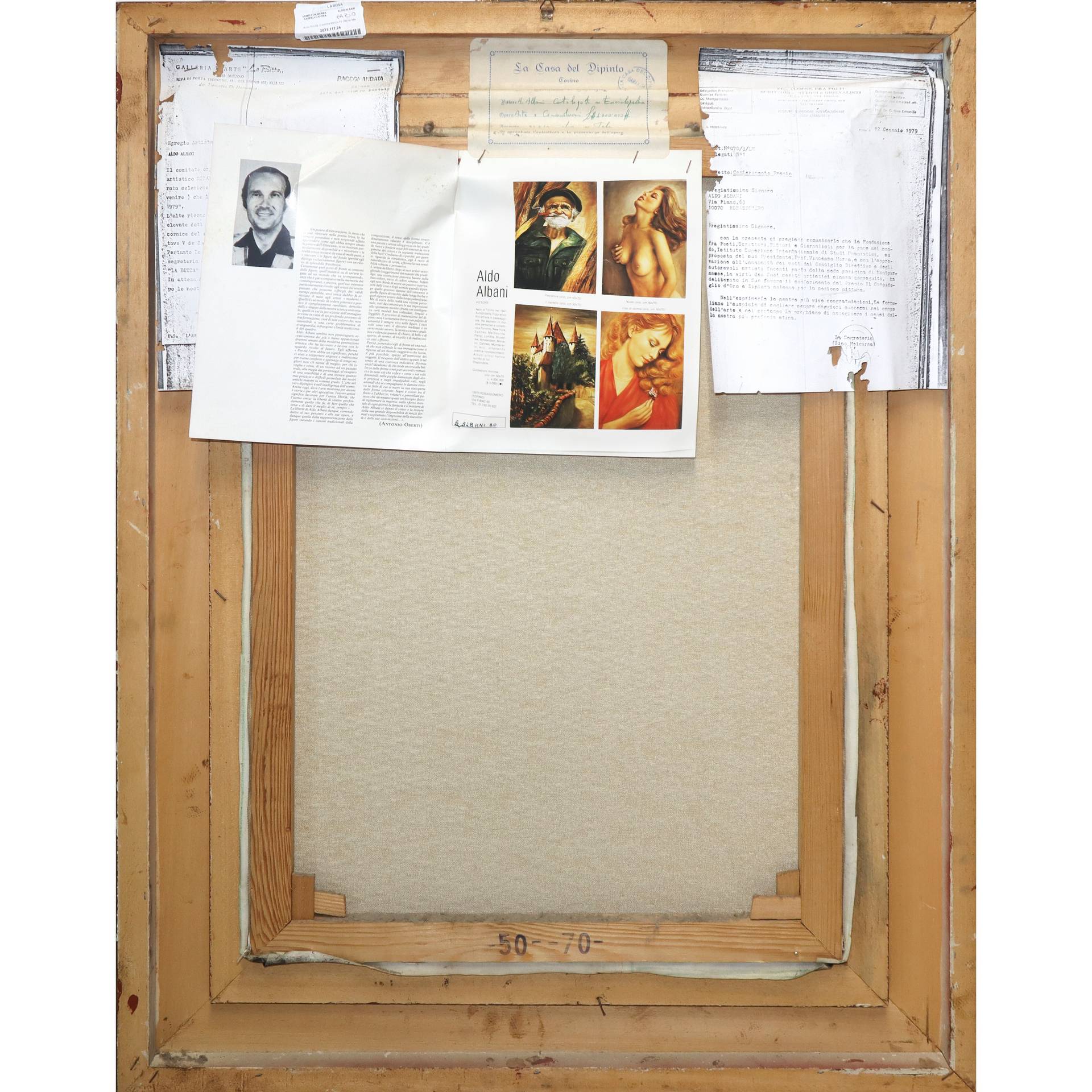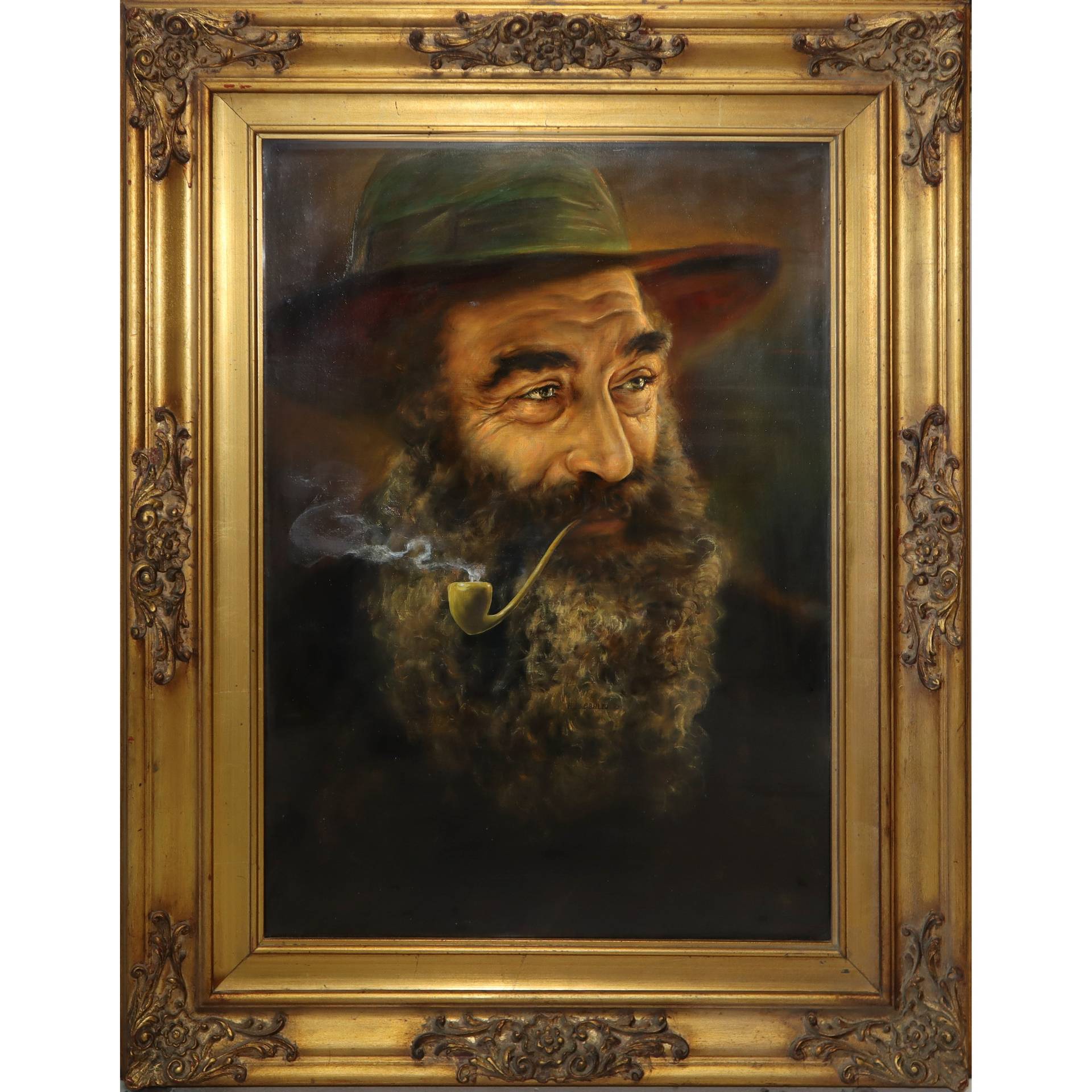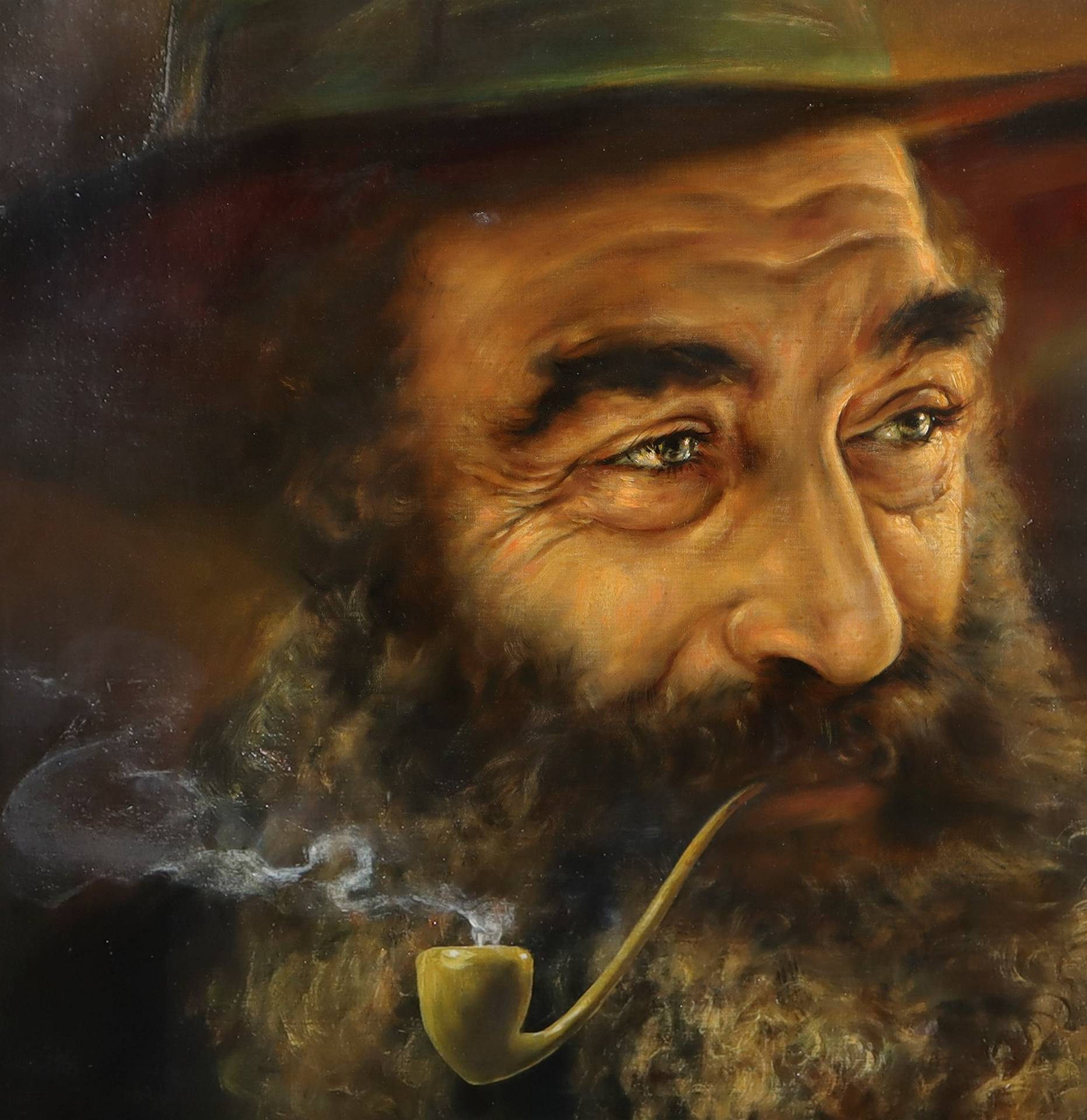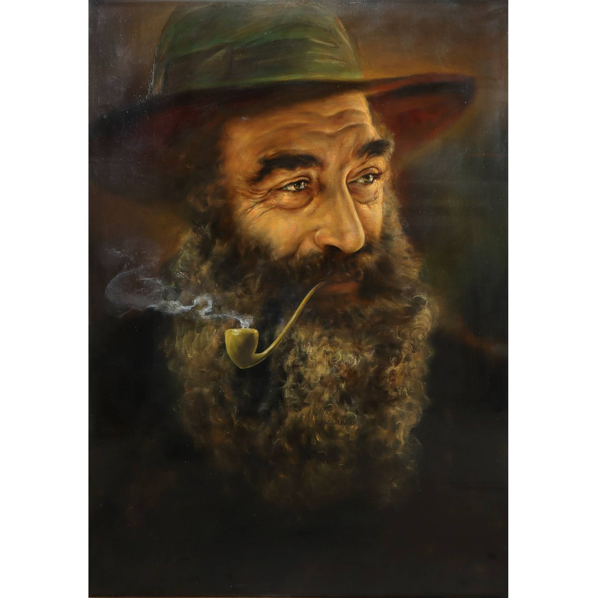 Aldo Albani (1941) - Uomo con barba cappello e pipa H cm 70 x 52, in cornice 93(h) x 73 Olio su tela Sul retro etichetta della galleria la casa del dipinto Torino, certificato di garanzia indicante pittore Aldo Albani