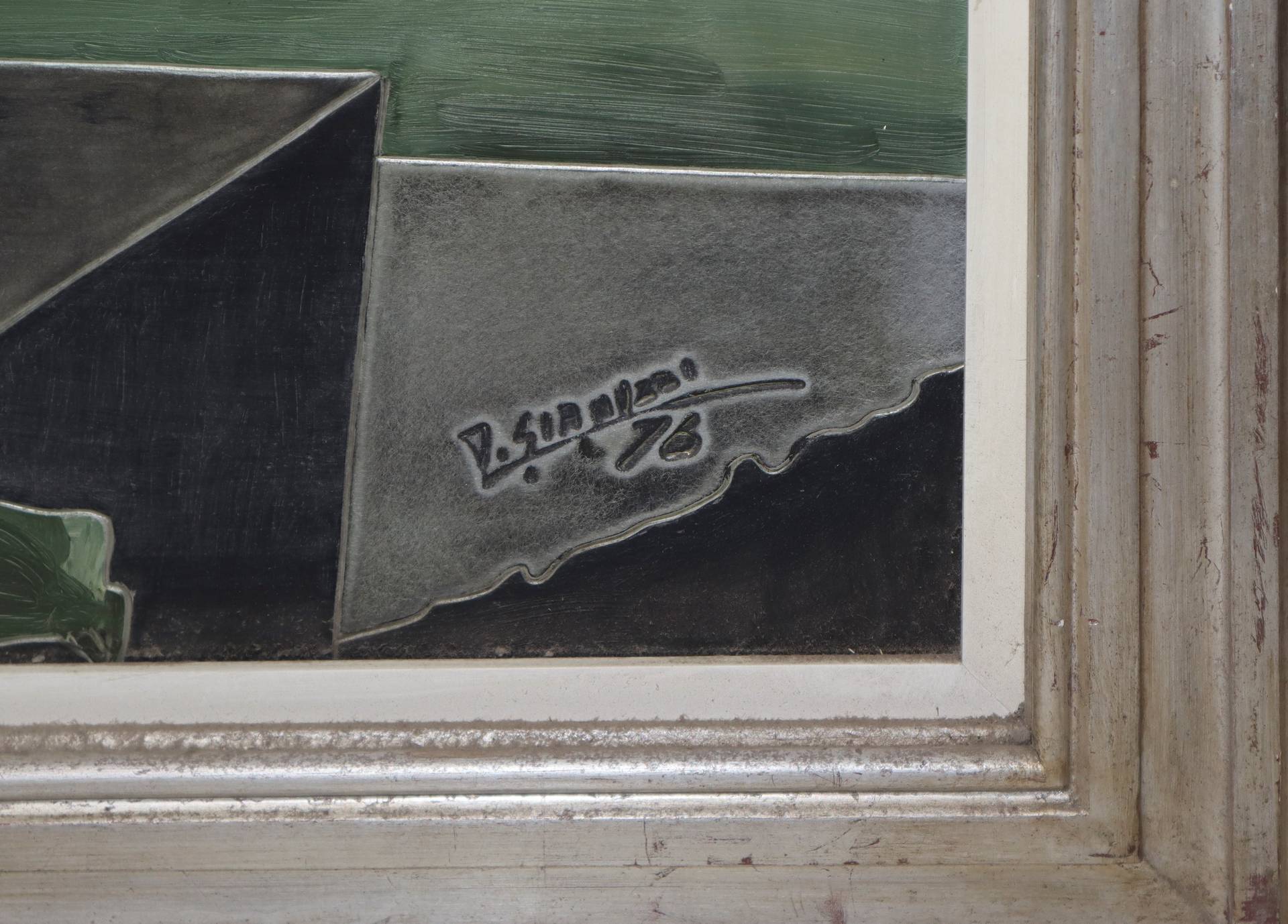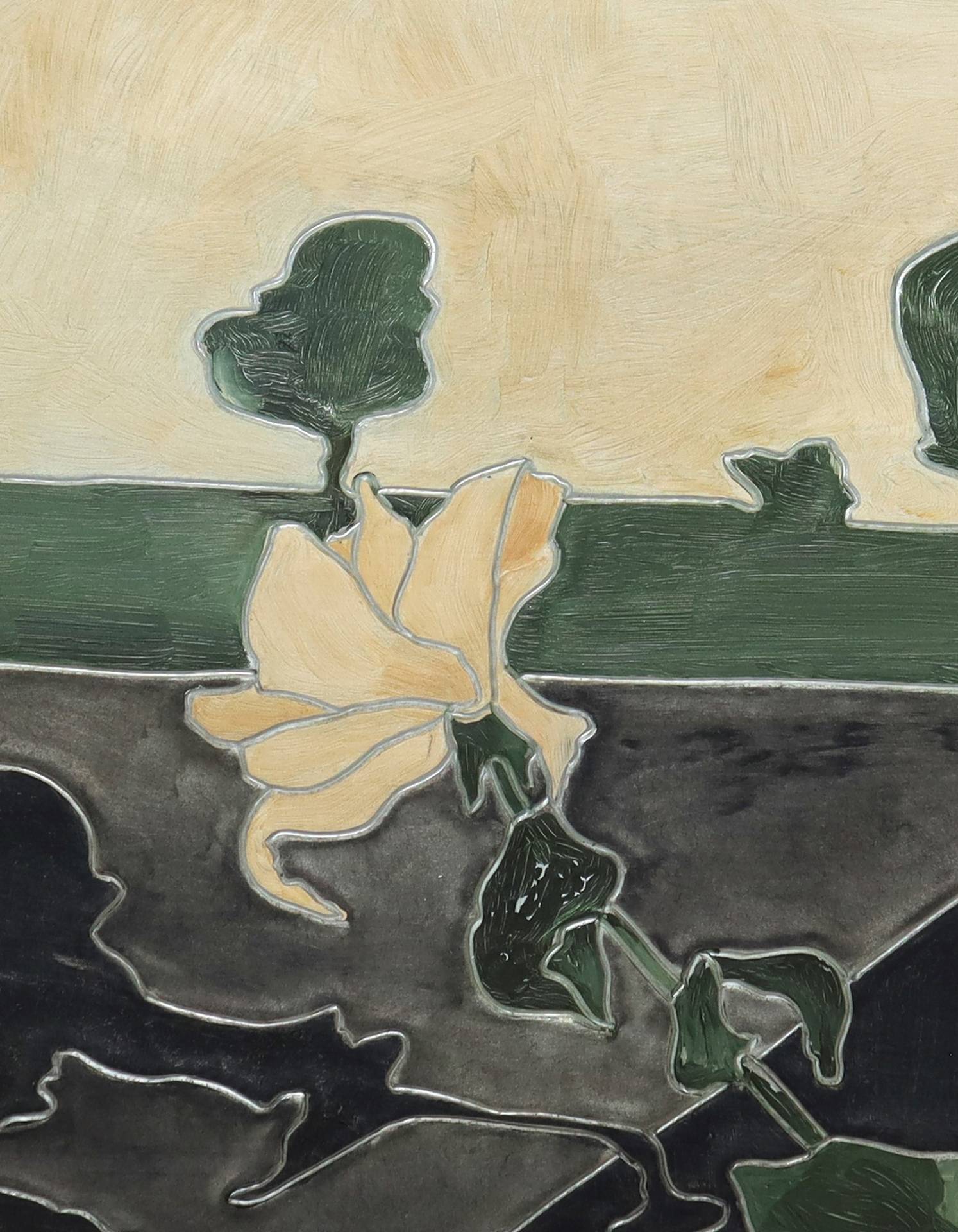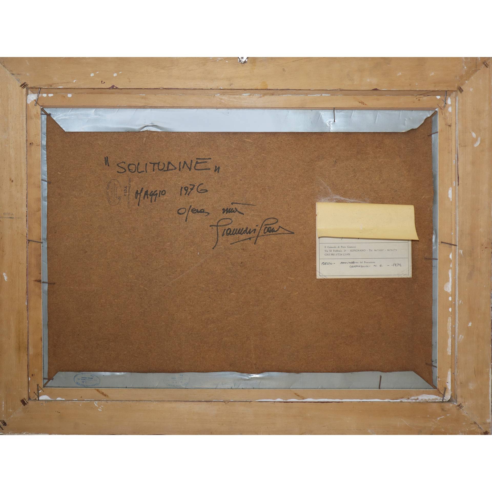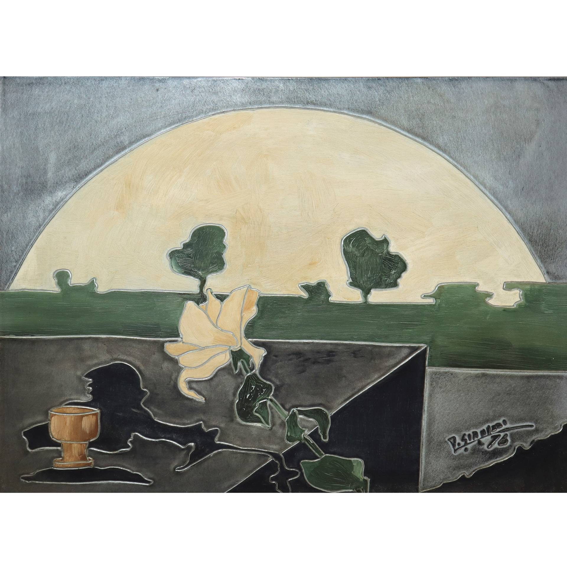 Piero Gianuzzi (1937-1996) - Paesaggio con alberi e natura morta con fiore, 1976 Cm 52(h) x 70 in cornice cm 69(h) x 79 Olio su zinco Firmato in basso a sinistra e datato 1976, sul retro titolato "Solitudine" e datato maggio 1976. Etichetta con certificato di autenticità