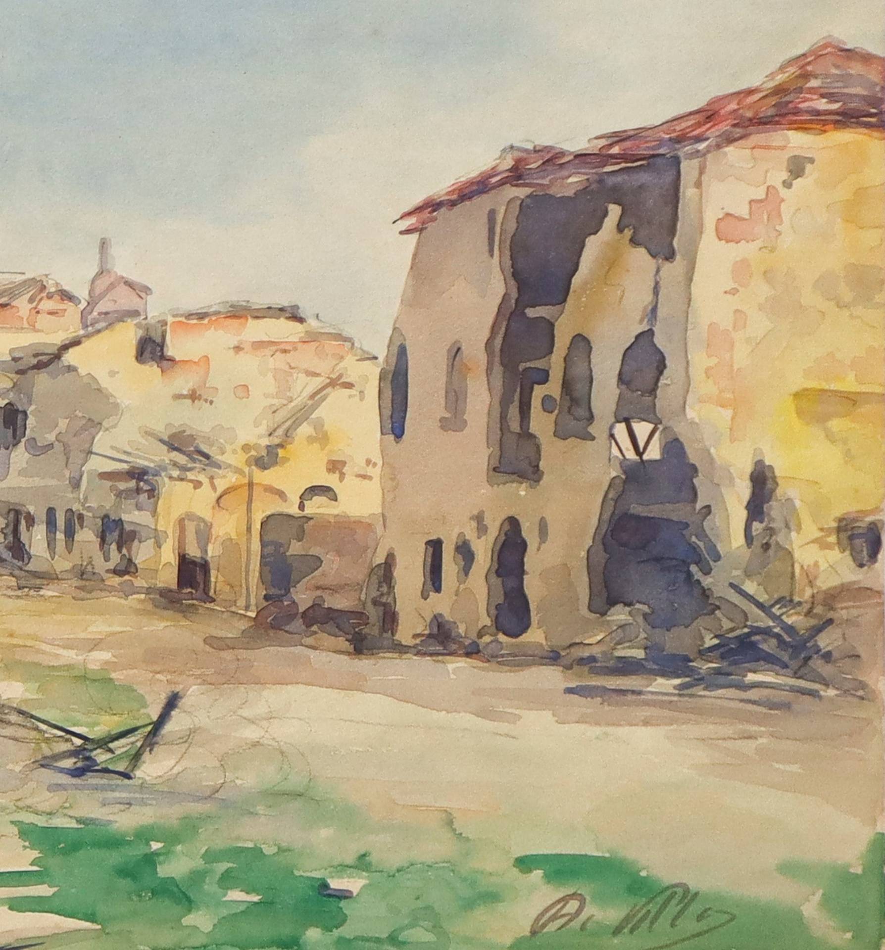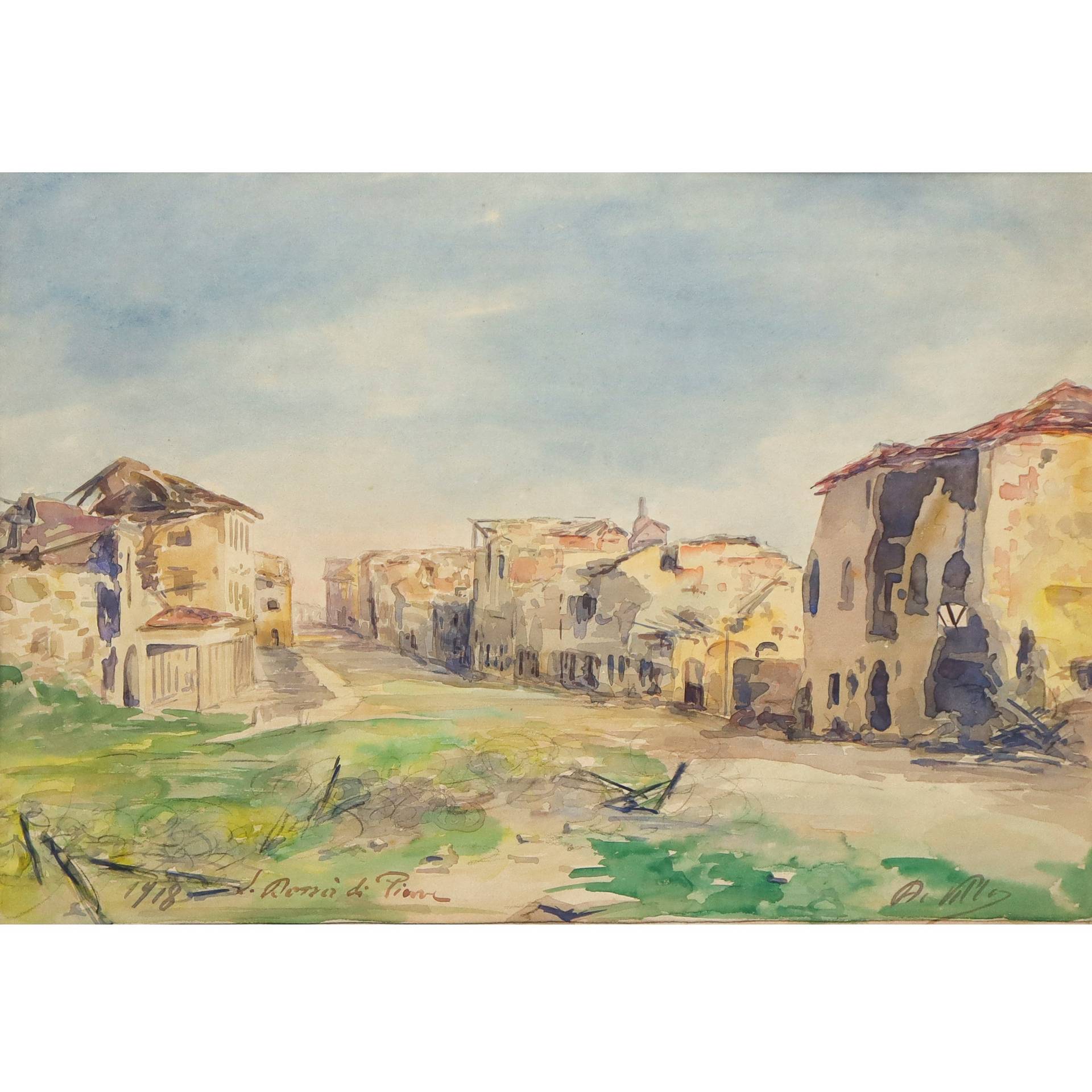 Paesaggio con case San Donà di Piave, 1918 Acquerello su cartoncino Firmato in basso a destra "A.Villa", sulla sinistra datato 1918 e descritto San Donà di Piave