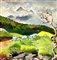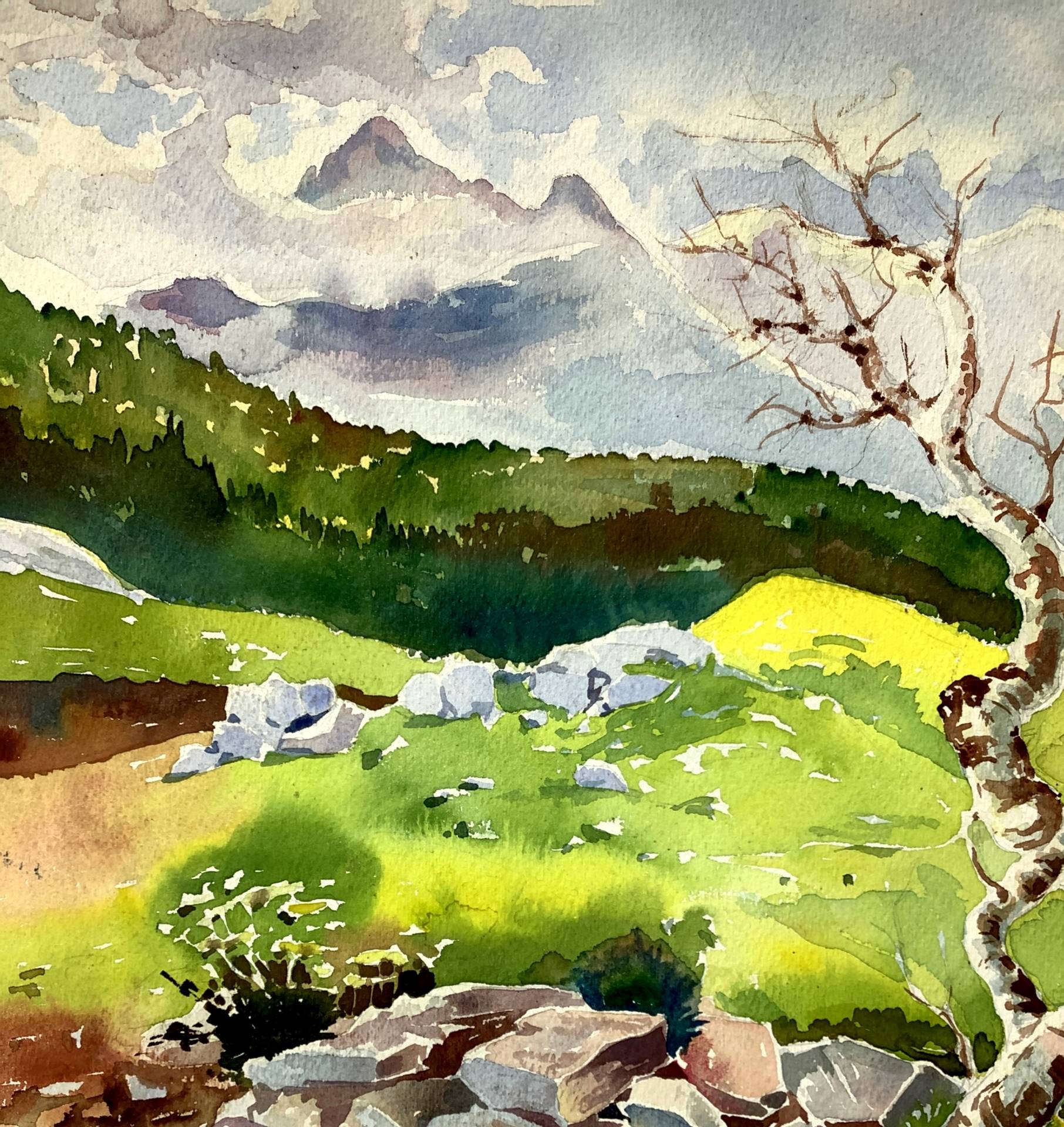 Paesaggio di montagna con alberi e rocce Mm 324x400 acquarello su carta Firmato in basso a sinistra. Privo di cornice.