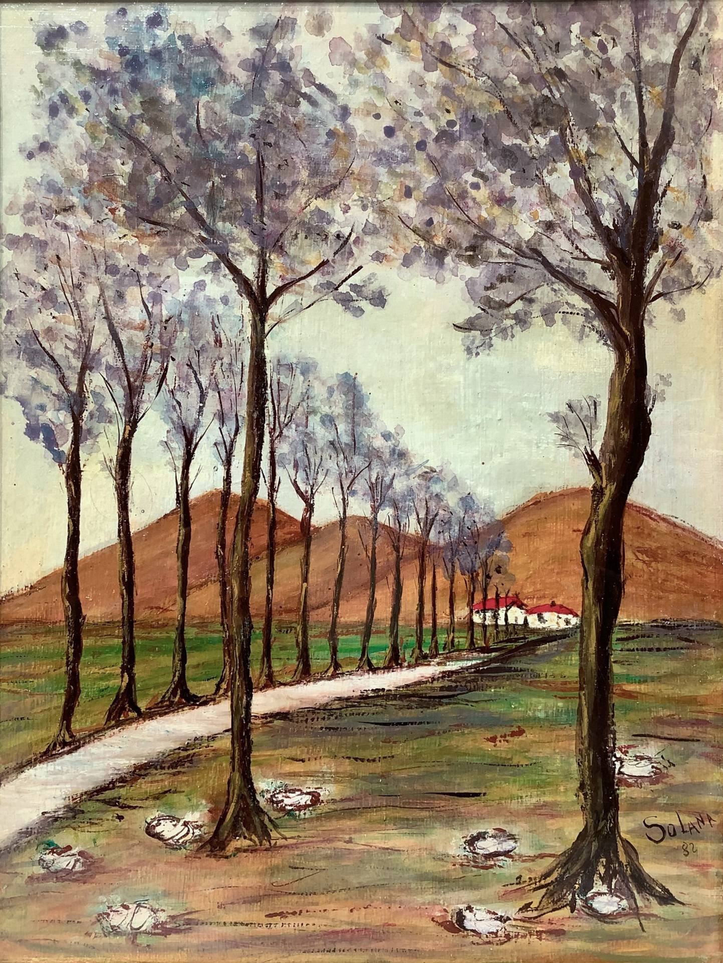 Via con alberi e colline Cm 39x29, in cornice cm 56x46 Olio su tela Firmato e datato in basso a destra Solana ‘82.