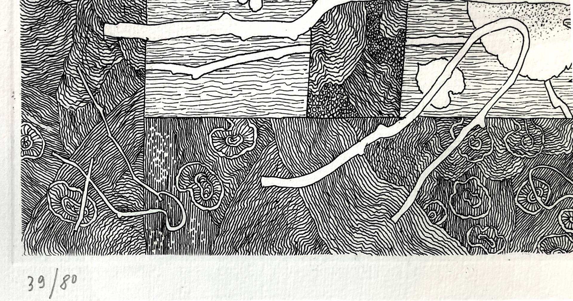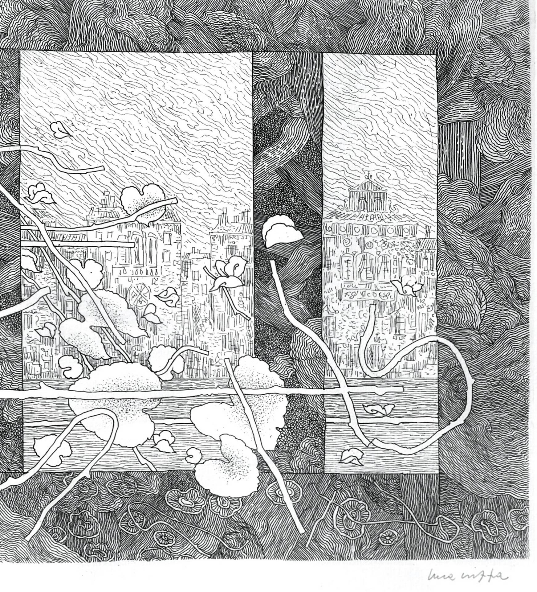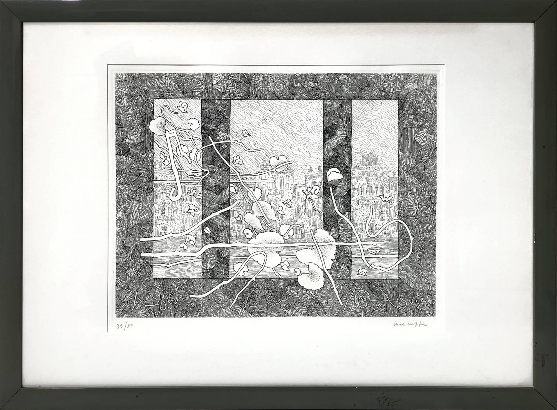Scorci di città all’interno di figure geometriche Mm 255x325, in cornice cm 40x53 Incisione ad acquaforte Firmato in basso a destra Luca M., tiratura 39/80