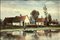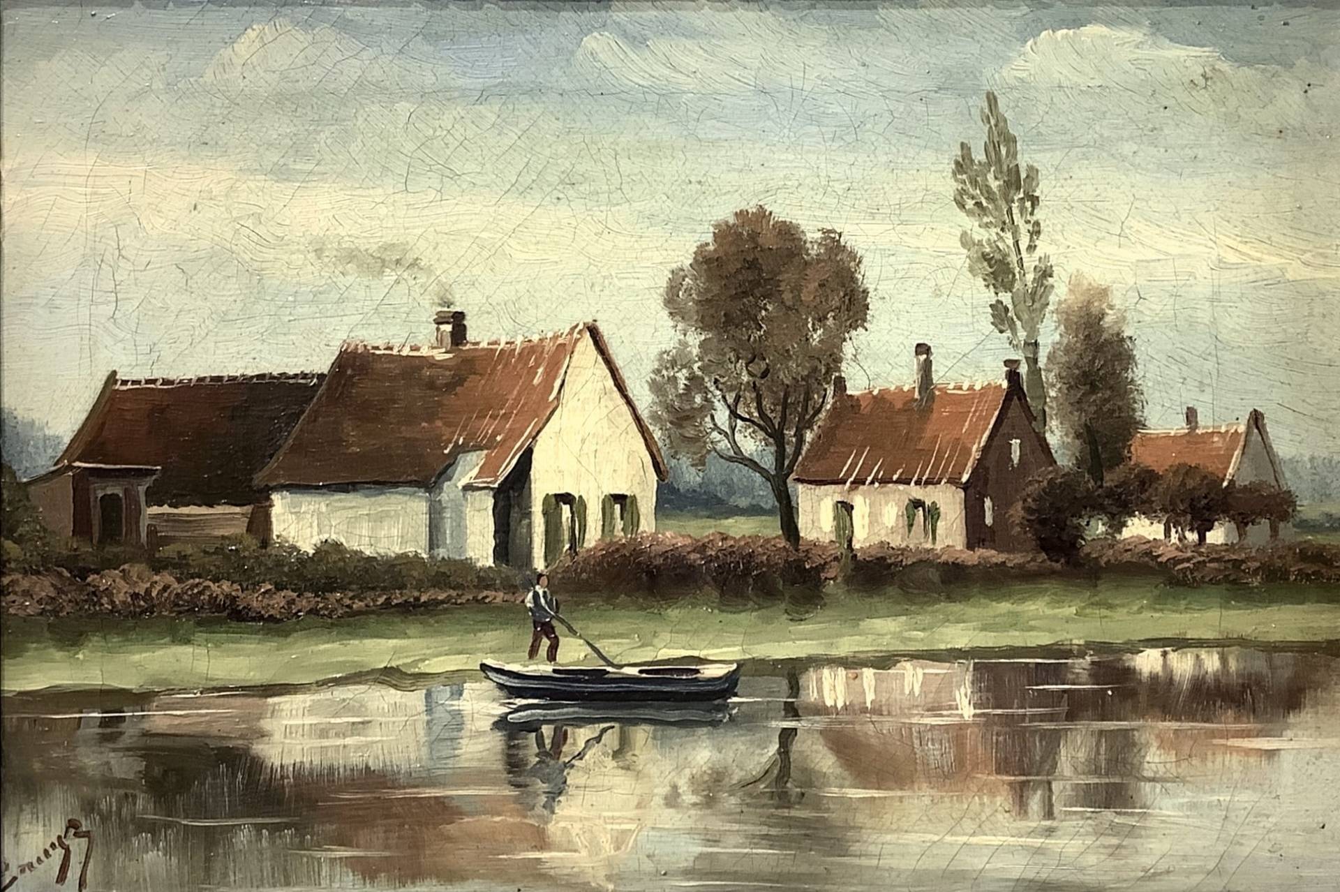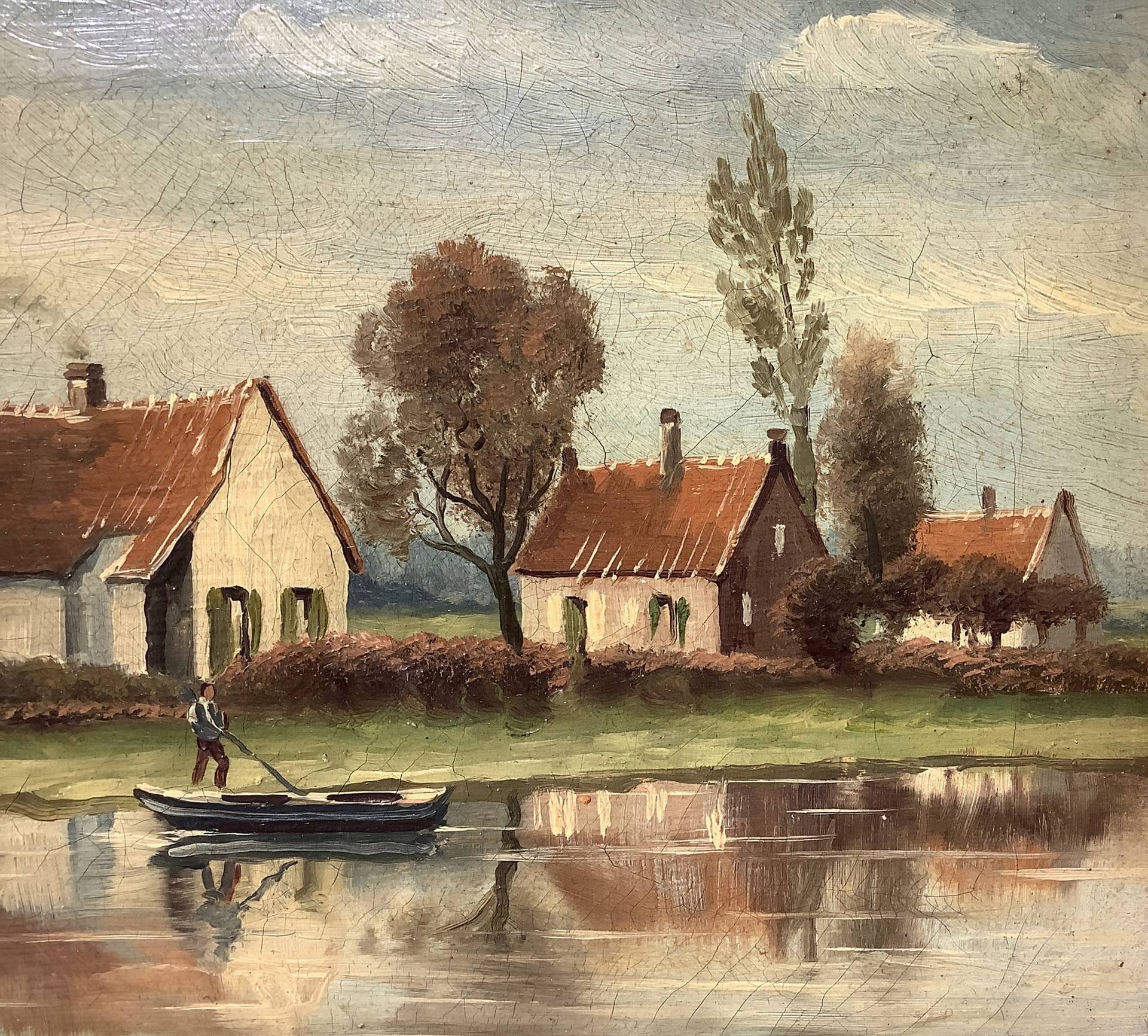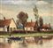 Paesaggio case sul lago Cm 18x26, in cornice cm 24x32 olio su tela Firma illeggibile in basso a sinistra.