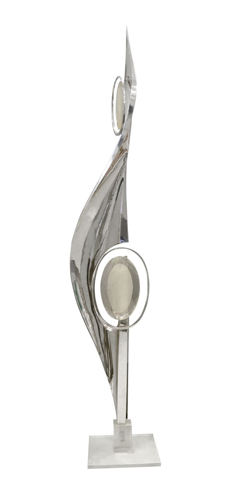 scultura in metallo cromato e applicazioni ovali in Plexiglass (un'ovale presenta una scheggiatura in basso) altezza cm. 290, pezzo unico, opera non firmata.