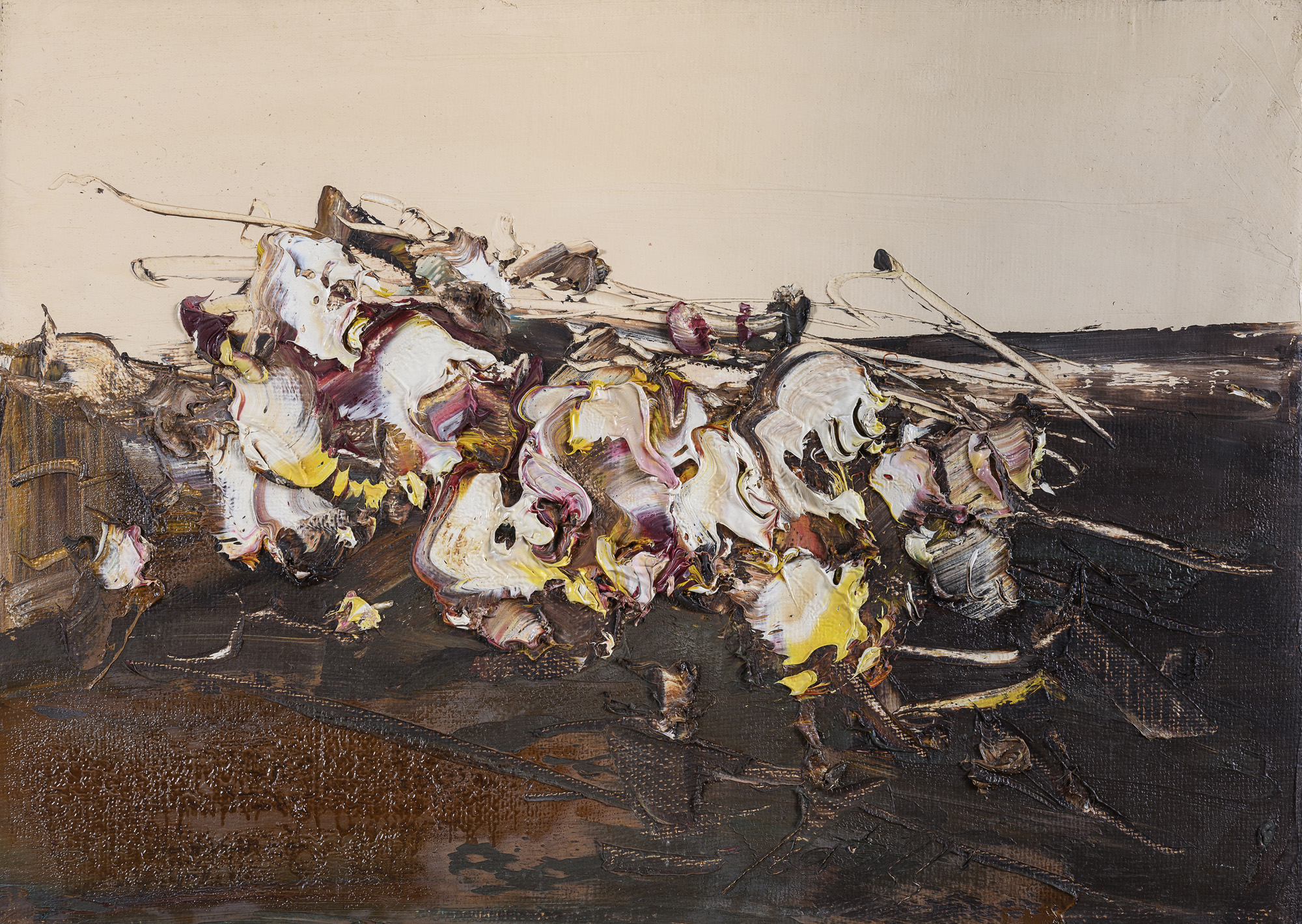 Coppia di dipinti ad olio materico su tela, cm. 50 x 70