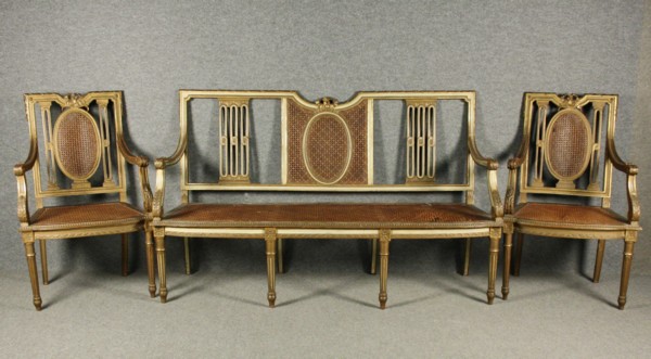 Salotto in legno laccato e dorato in stile Luigi XVI composto da un divanetto e due poltrone. Fine XIX secolo. Difetti.