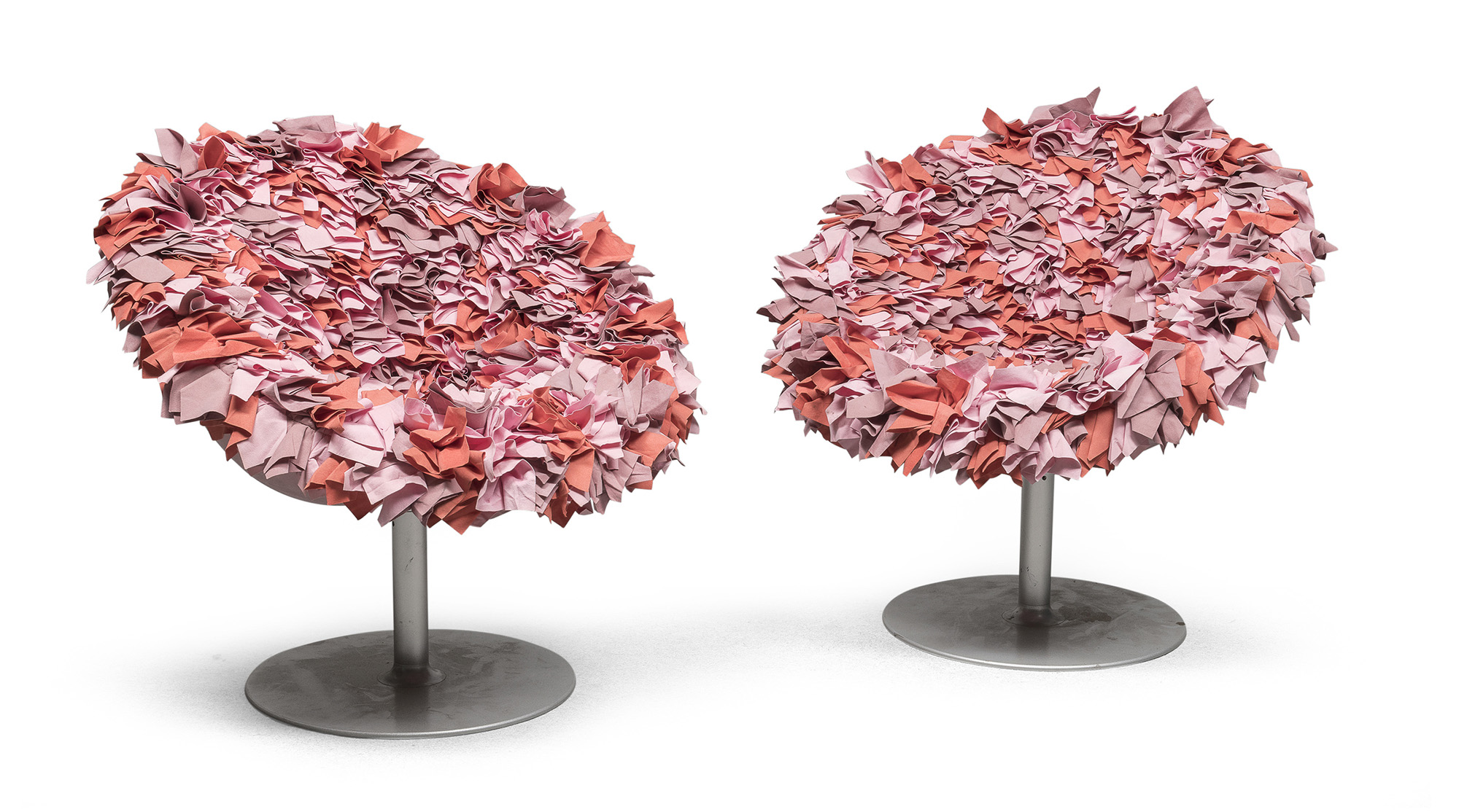 con struttura in metallo cromato, sedile formato da un bouquet di petali formati da quadrati di tessuto piegati manualmente e cuciti. La scocca è a sagoma d’uovo.