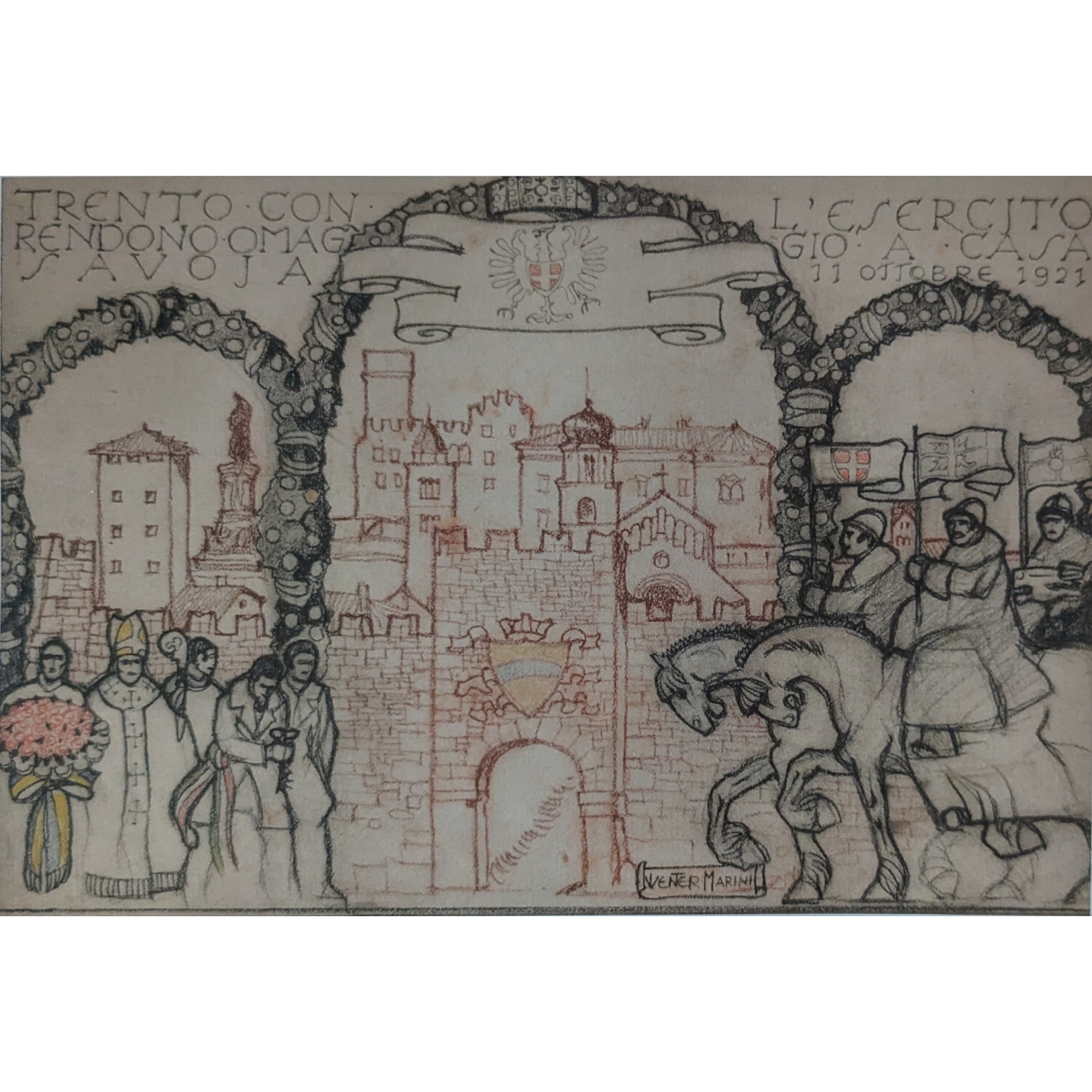 G. Wenter Marini, Trento con l'esercito rendono omaggio a Casa Savoia 11 Ottobre 1921, bozzetto per cartolina commemorativa, carboncino e sanguigna su carta, cm 43x62. Pubblicato sul volume "Giorgio Wenter Marini - Pittura, Architettura, Grafica", 1991, a cura di Maurizio Scudiero