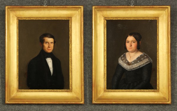 Coppia di dipinti olio su tela raff. ''RITRATTO MASCHILE E FEMMINILE''. Firmati JUIM-0-N e datati 1844. In cornice dorata. Mis. Lung. cm. 27,5 Alt. cm. 35,5 ca.
