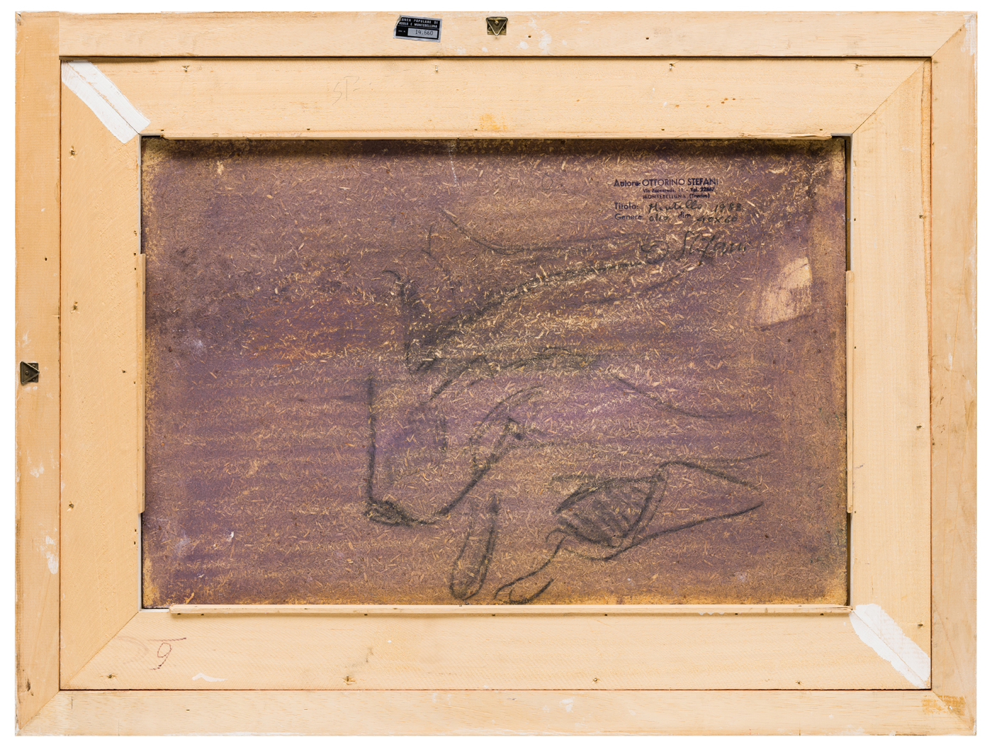 Elementi distintivi: sul verso, timbro dell’artista con titolo, data, tecnica e misure dell’opera scritte a mano; etichetta della Banca Popolare di Asolo e Montebelluna con riferimenti inventariali