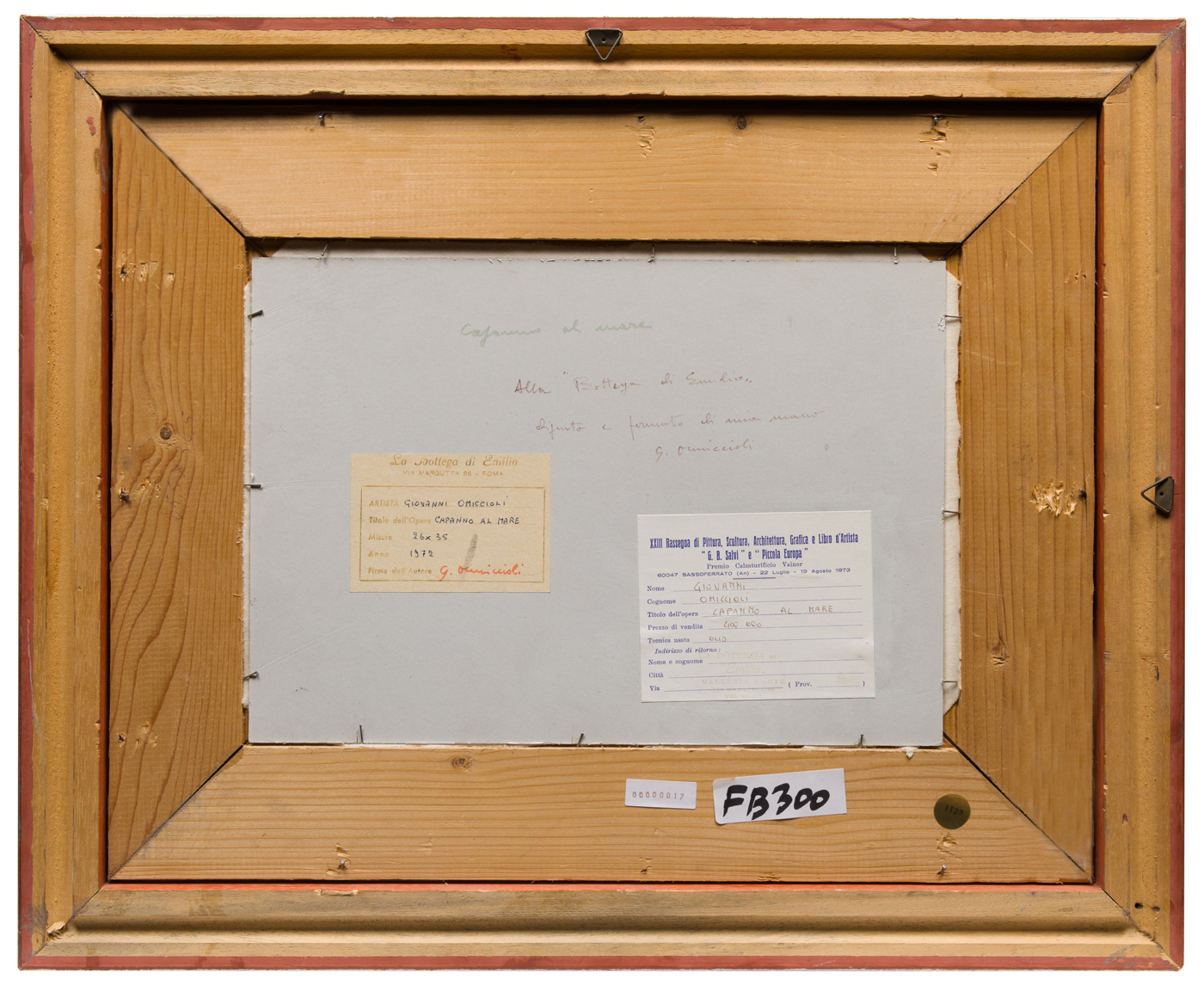 Altre iscrizioni: sul verso, “Capanno al mare alla ‘Bottega di Emilio’ dipinto e firmato di mia mano"