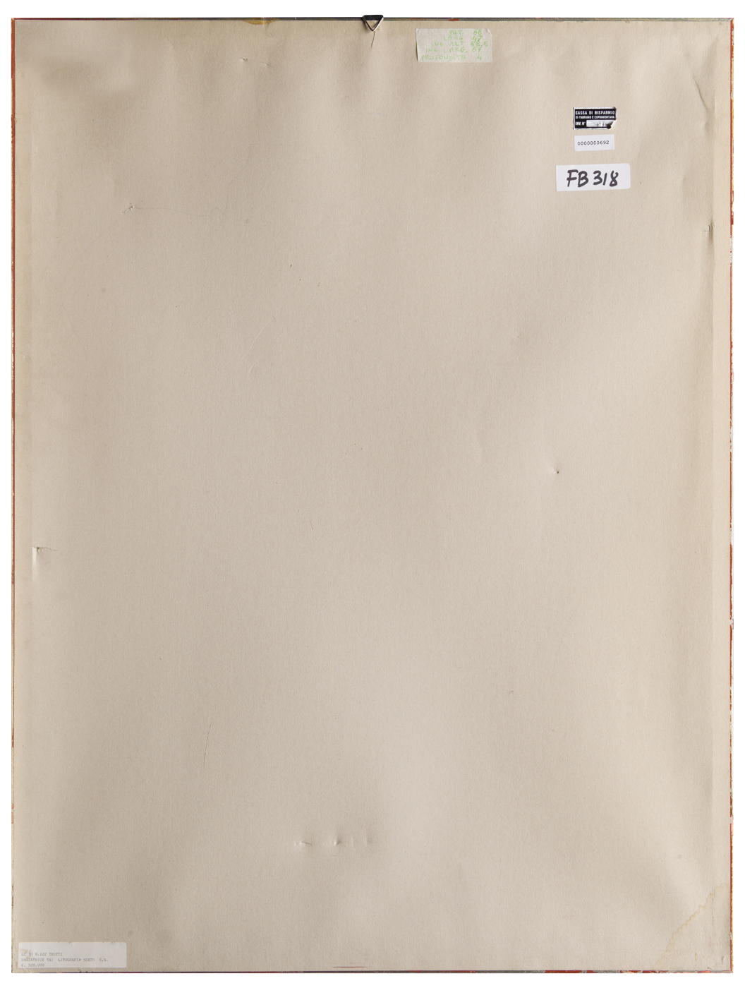 Elementi distintivi: sul verso, etichetta anonima con dati dell'opera; etichetta Cassa di Risparmio di Fabriano e Cupramontana con riferimenti di inventario