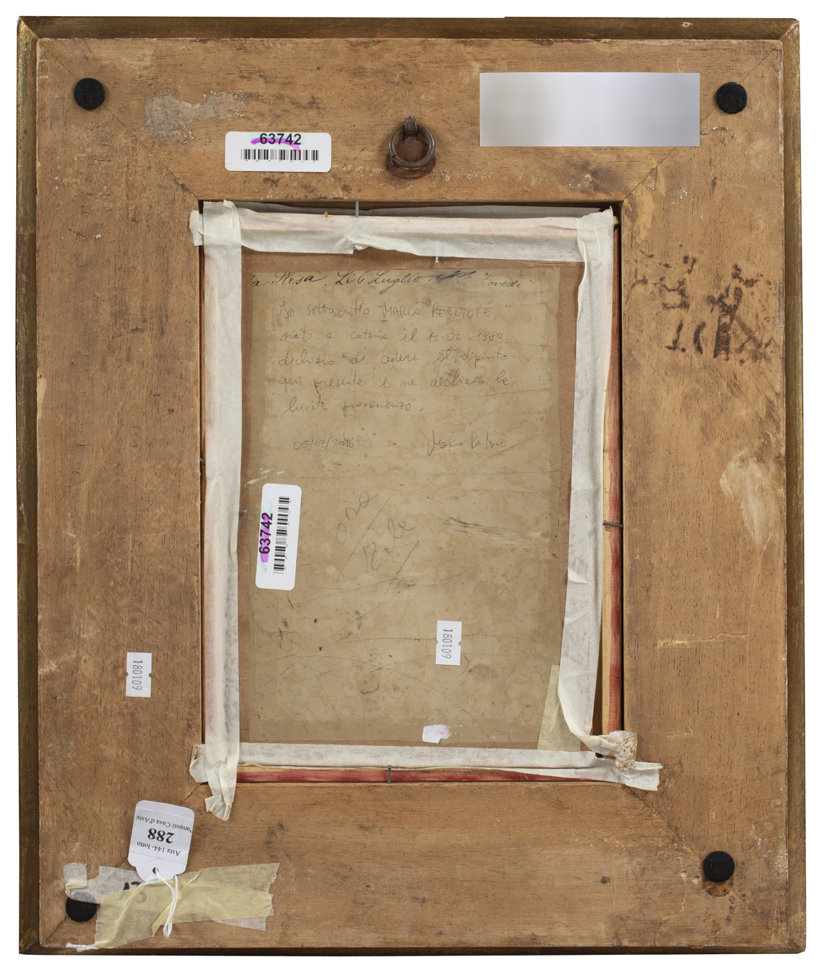 Altre iscrizioni: al verso, annotazione di inizio novecento, forse in relazione al soggetto dell'opera; annotazione per la cessione dell'opera datata "05/07/2016" da parte di "Marco Peritore"