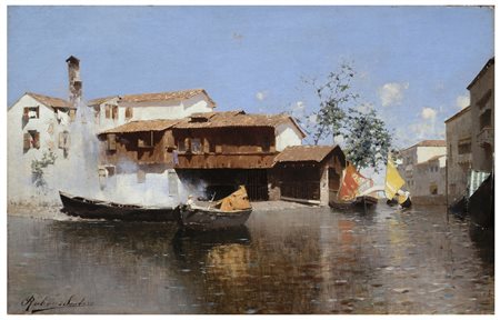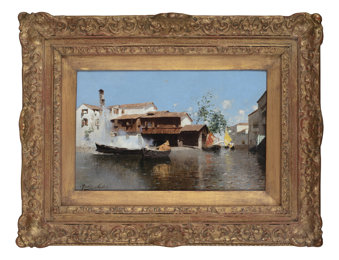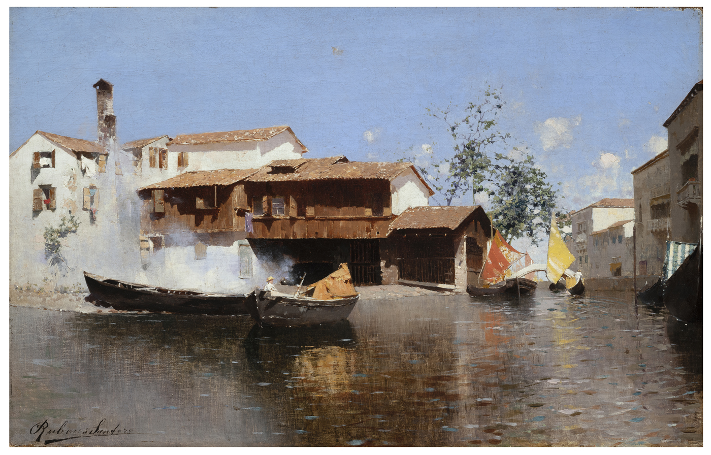 Calabrese di nascita, Rubens Santoro si forma all’Istituto di belle arti di Napoli sotto la guida di Domenico Morelli, assimilando la lezione di Filippo Palizzi, ma anche di Mariano Fortuny presente nel 1874 nella città partenopea. Dopo aver venduto alcuni dipinti nel 1873 all’influente mercante parigino Frédéric Reitlinger, dal 1875 è legato ad Adolphe Goupil, che a Napoli faceva incetta di vedute e temi di genere particolarmente apprezzati dal mercato internazionale, come attestano le sue opere conservate in pubbliche istituzioni italiane ed estere (Baltimora, Art Museum; Manchester, Art Gallery; Torino, Museo Civico, Reggio Calabria, Museo Nazionale). Torre Annunziata, Castellammare di Stabia, Procida, Amalfi, Capri e Resina sono i soggetti di questi anni realizzati con una pennellata veloce e un tocco virtuoso di matrice fortuniana. Risalgono agli anni Ottanta dell’Ottocento i primi soggetti veneziani, replicati con grande successo per oltre un ventennio e inviati a importanti esposizioni e alle gallerie parigine Goupil e Chaine & Simonson. Come notato da Isabella Valente, l’artista si concentra sulla Venezia minore dei Ciardi, di Favretto e di Nono. La laguna gli permette, così come il Golfo di Napoli, «incantevoli giochi di luce, di forti chiaroscuri, di atmosfere brillanti» (Isabella Valente, “’Dove il sole è così intenso da far male agli occhi’, Rubens Santoro e le scelte della luce”, in Tonino Sicoli, Isabella Valente, a cura di, “Rubens Santoro e i pittori della Provincia di Cosenza tra Otto e Novecento”, catalogo della mostra, Catanzaro, 2003, pp. 23-38, p. 28). Tra i luoghi più caratteristici ritratti in questi anni figura lo Squero di San Trovaso, uno dei più antichi e famosi “squeri”, i cantieri navali, che prendono il nome dalla squara utilizzata per costruire le imbarcazioni. Posto sull’omonimo rio de San Trovaso questo squero, risalente al Seicento, è uno dei pochi ancora oggi in funzione e viene utilizzato esclusivamente per le gondole. Le facciate delle case in legno, secondo uno stile più alpino che lagunare, sono dovute all’estro degli squerarioli molti originari del Cadore. In questo dipinto Santoro sostituisce con un cielo azzurro la chiesa dei Santi Gervasio e Protasio, che con il suo campanile nella realtà si erge alle spalle degli edifici in legno delle officine.