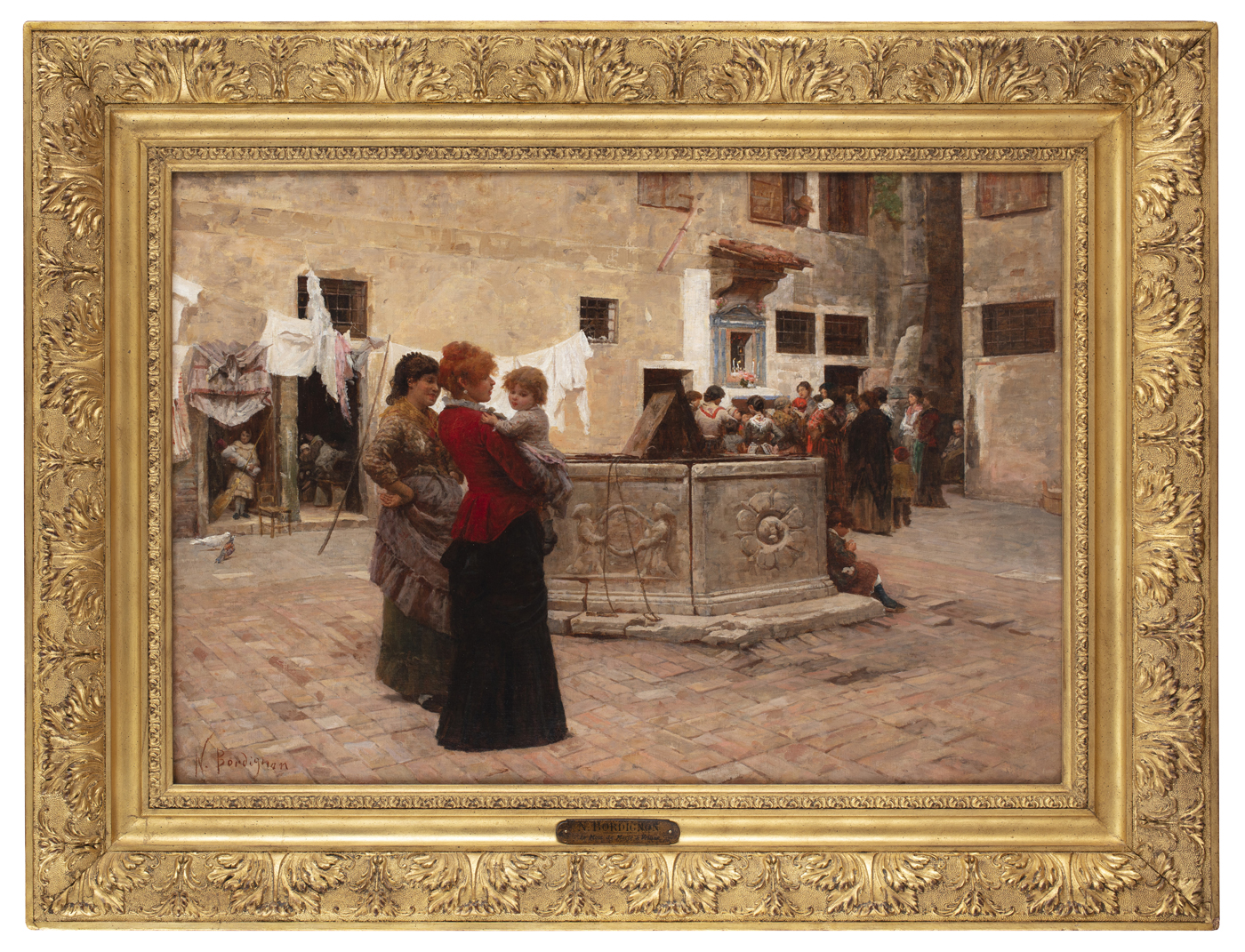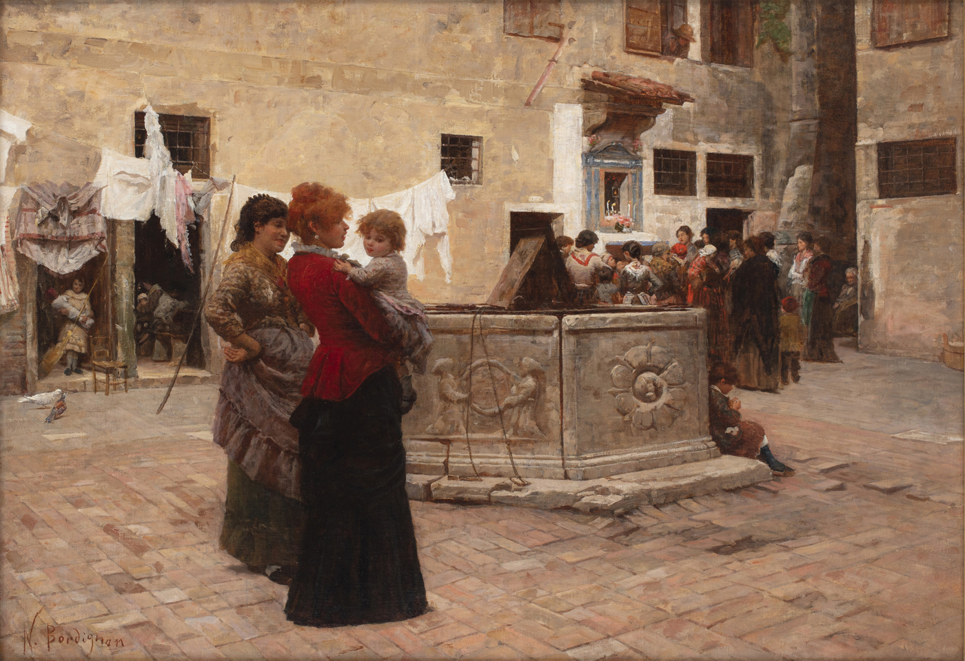 Tra le opere qui ambientate figura “Il mese di Maria a Venezia”, presentato all’Esposizione dell’Accademia di belle arti di Milano del 1884 e poi l’anno successivo esposto all’Accademia di Venezia. Nel 1883 era stato presentato all’Esposizione di Milano “Le pettegole”, la cui struttura compositiva anticipa quella del dipinto in esame. In questa seconda opera Bordignon accentua l’aspetto intimistico della sua pittura, raggiungendo una qualità nettamente superiore attraverso la rappresentazione assai più raffinata dei sentimenti. Al gruppo di quattro donne intente in chiacchiere intorno al pozzo della Corte San Marco si sostituiscono le più sobrie figure di due donne con un bambino. L’immagine si anima di dettagli. All’interno delle porte compaiono scene di intimità domestica e sulla destra si radunano le devote con i loro bambini intorno all’edicola della Vergine, che nella prima opera appariva trascurata e abbandonata, mentre ora è decorata con fiori e candele. Una bambina, che si è staccata dal gruppo, prega con le mani giunte seduta sulla base del pozzo.