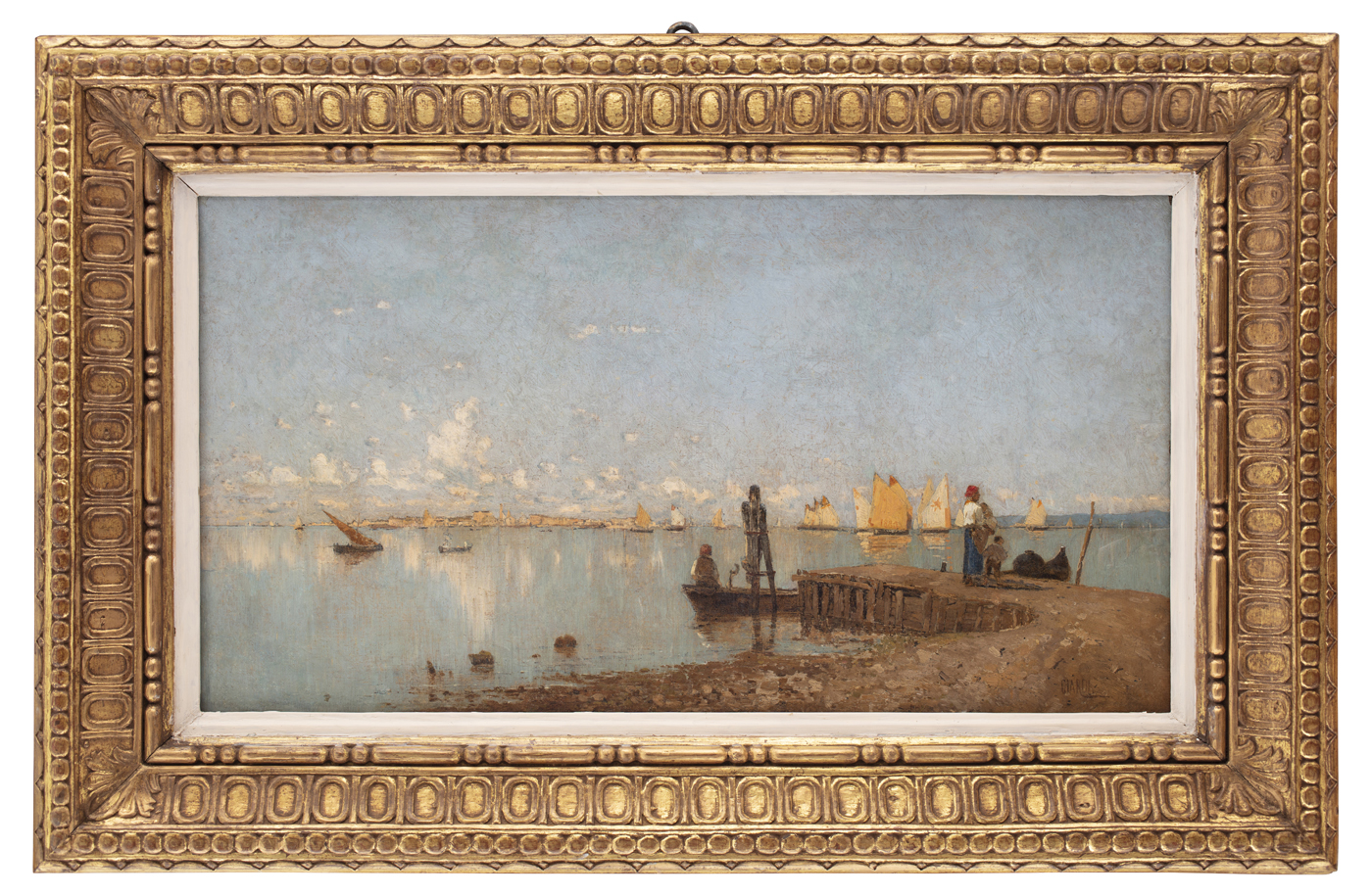 A partire dal 1873 Guglielmo Ciardi si afferma come cantore della laguna veneta, erede predestinato di Canaletto, Guardi e Bellotto (Stefano Bosi, “Il cantore della laguna veneta: I cicli delle ‘basse maree’ e dei ‘pescatori in laguna’”, in Enzo Savoia, Francesco Luigi Maspes, a cura di, "Guglielmo Ciardi protagonista del vedutismo veneto dell'Ottocento", Crocetta del Montello, 2013, pp. 92-95). Allievo della scuola di paesaggio istituita da Domenico Bresolin presso l’Accademia di belle arti di Venezia, l’artista aveva saputo creare un felice connubio tra la tradizione veneta, di cui riprende atmosfere e tavolozza, con le ricerche più innovative del suo tempo tra “macchia” e “vero”. Il peculiare punto di vista della terra vista dal mare o da uno degli isolotti della laguna gli aveva permesso di operare tale sintesi e di lavorare sul motivo cogliendo le infinite variazioni degli effetti di luce sulla superficie dell’acqua. Il mare è sempre calmo e le rare figure umane sono operose, in un’armoniosa compenetrazione tra uomo e natura, che si trasfigura una dimensione serena e atemporale. Si tratta di veri e propri cicli, in cui viene nel corso degli anni preso nota di ogni dettaglio atmosferico e di ogni attività umana attraverso dipinti tutti diversi l’uno dall’altro. Dopo un soggiorno a Parigi per visitare l’Esposizione universale del 1878 la pittura di Ciardi si fa matura e internazionale, come attestato dall’opera in esame proveniente dal mercato americano e datata 1880 sulla vela color avorio della sesta imbarcazione da sinistra. La pennellata diviene più liscia e il contrasto cromatico tra le zolle di terreno e l’acqua più evidente. Una donna con due bambini osserva da un piccolo molo, che chiude la composizione, le vele delle barche da pesca che si dispiegano sulla laguna. Il cielo appena corrusco di nubi si riflette placido sulla superficie del mare, che segna tutto il contorno del dipinto. L’artista orchestra con sapienza le variazioni cromatiche, passando in basso dal marrone all’azzurro, lungo la linea dell’orizzonte dall’azzurro all’avorio degli edifici, tratteggiati con fare miniaturistico, e a destra dall’azzurro al cobalto dei colli in lontananza.