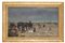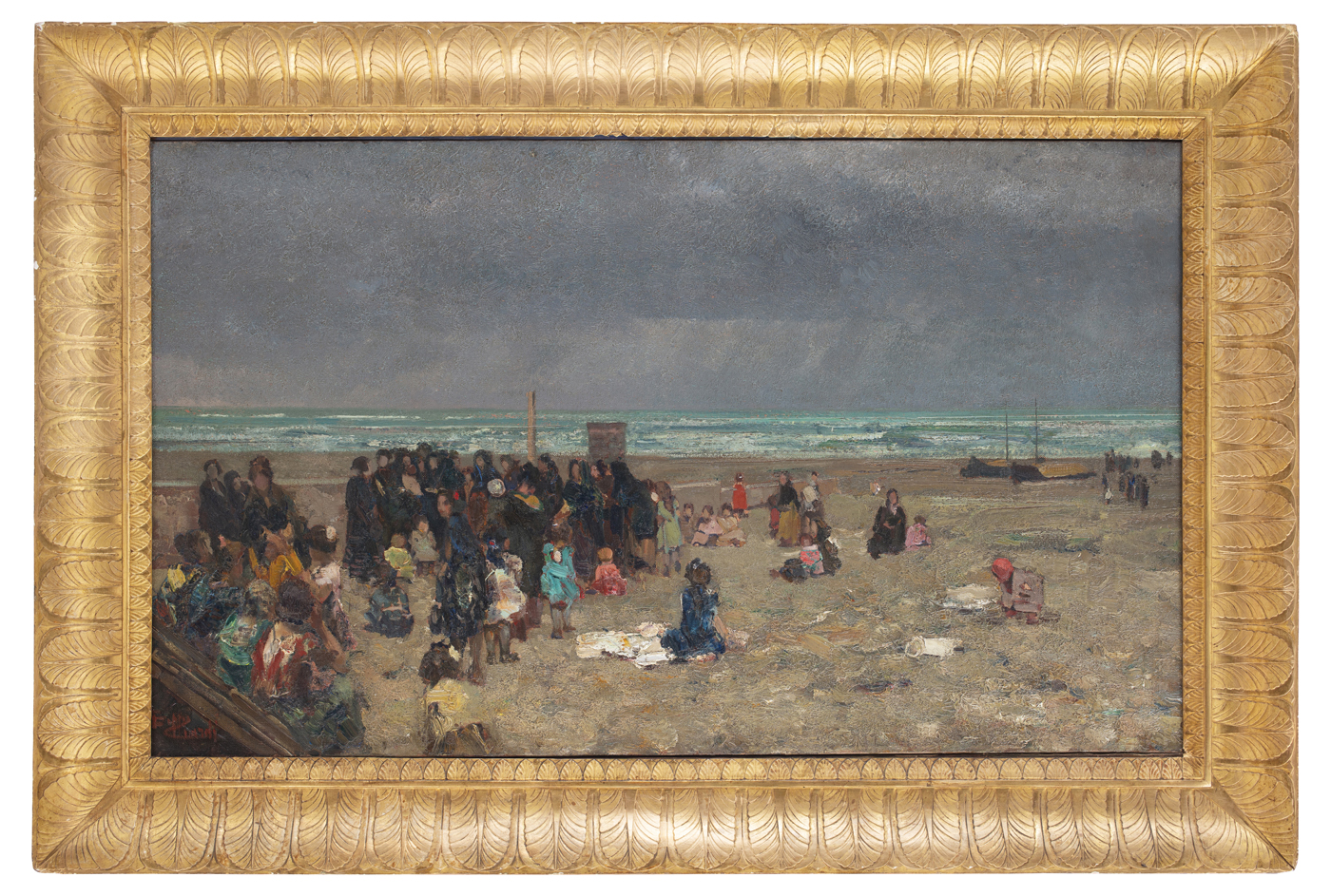 Il tema della partenza e del rientro di marinai e pescatori ricorre negli anni Venti del Novecento nella produzione di Beppe Ciardi (Venezia 1875 – Quinto di Treviso 1932), che tornato a Venezia dopo la pausa della Grande Guerra, indugia su visioni dall’afflato lirico. Figlio del notissimo Guglielmo e fratello di Emma, l’artista dopo una prima formazione sotto la guida paterna per il paesaggio e di Ettore Tito per la figura, attraverso l’amicizia con Vittore Grubicy si era accostato alle innovazioni del luminismo divisionista. In sintonia con le ricerche segantiniane, la natura era divenuta protagonista delle sue opere. Il dipinto, intitolato sul telaio “Spiaggia marina”, fa parte di una serie di opere con pescatori e donne sulla spiaggia (Antonio Parronchi, “Beppe Ciardi. Catalogo generale”, cit., p. 243 nn. 817-821). In un reciproco rapporto in quest’opera lo stato d’animo di attesa delle donne e dei bambini e l’atmosfera tempestosa del paesaggio costituiscono una sorta di unità emotiva. Mentre ancora non compaiono le prime imbarcazioni all’orizzonte, il cielo si fa cupo, le nuvole si gonfiano di pioggia e il mare è scosso da raffiche di vento. Con la consueta perizia l’artista rende attraverso diversi toni di grigio l’incedere del temporale con il cielo scuro in primo piano e la pioggia che si scarica sulla linea dell’orizzonte. Le figure in attesa costituisco un gruppo compatto, appena ravvivato da pochi toni di rosso e azzurro, da cui si staccano i personaggi isolati sulla destra e quelli seduti sull’asse di legno, che chiude obliquamente lo spazio all’estrema sinistra. Segno del rientro sono alcune barche già tirate a riva, circondate da figure tanto piccole e tanto distanti da confondersi con la sabbia. Spettatore esterno e nel contempo partecipe della scena, l’artista sceglie un punto di vista leggermente rialzato che permette di inquadrare con taglio fotografico quanto più persone e quanto più scenario naturale possibile.
