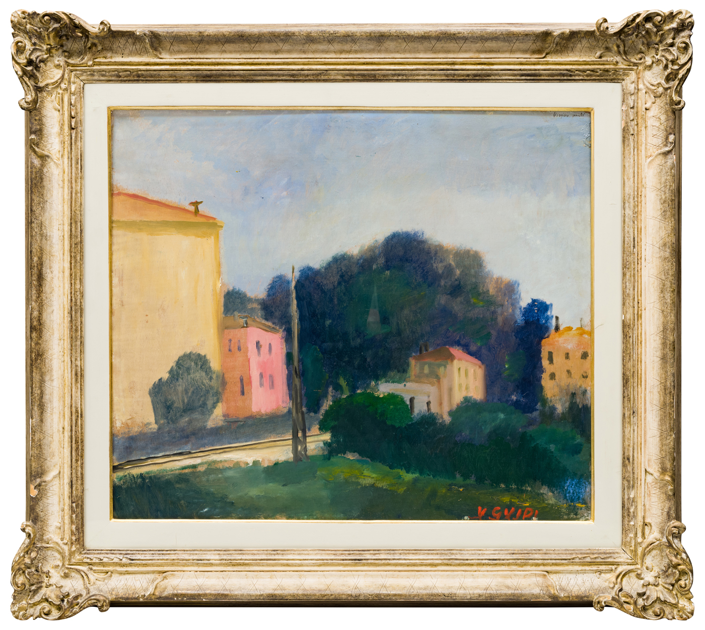 Rispetto ai paesaggi romani, caratterizzati da una volumetria semplice e solida, i paesaggi veneti – sia quelli lagunari, sia quelli dell'entroterra – complice certamente il contatto con la luce locale, rarefatta e trasparente, sono caratterizzati da una pennellata più mossa che tende a sfaldare la consistenza formale per far emergere la vibrazione luminosa. Una luce che, come in quest'opera, appare tutta intrinseca alla materia pittorica, alleggerendo i semplici volumi delle case e conferendo una consistenza soffice al cielo e alle fronde degli alberi. Un'esperienza, quella della luce veneta, che condurrà Guidi negli anni verso una progressiva sintesi astrattiva in cui il paesaggio tenderà sempre più a divenire lirica apparizione.