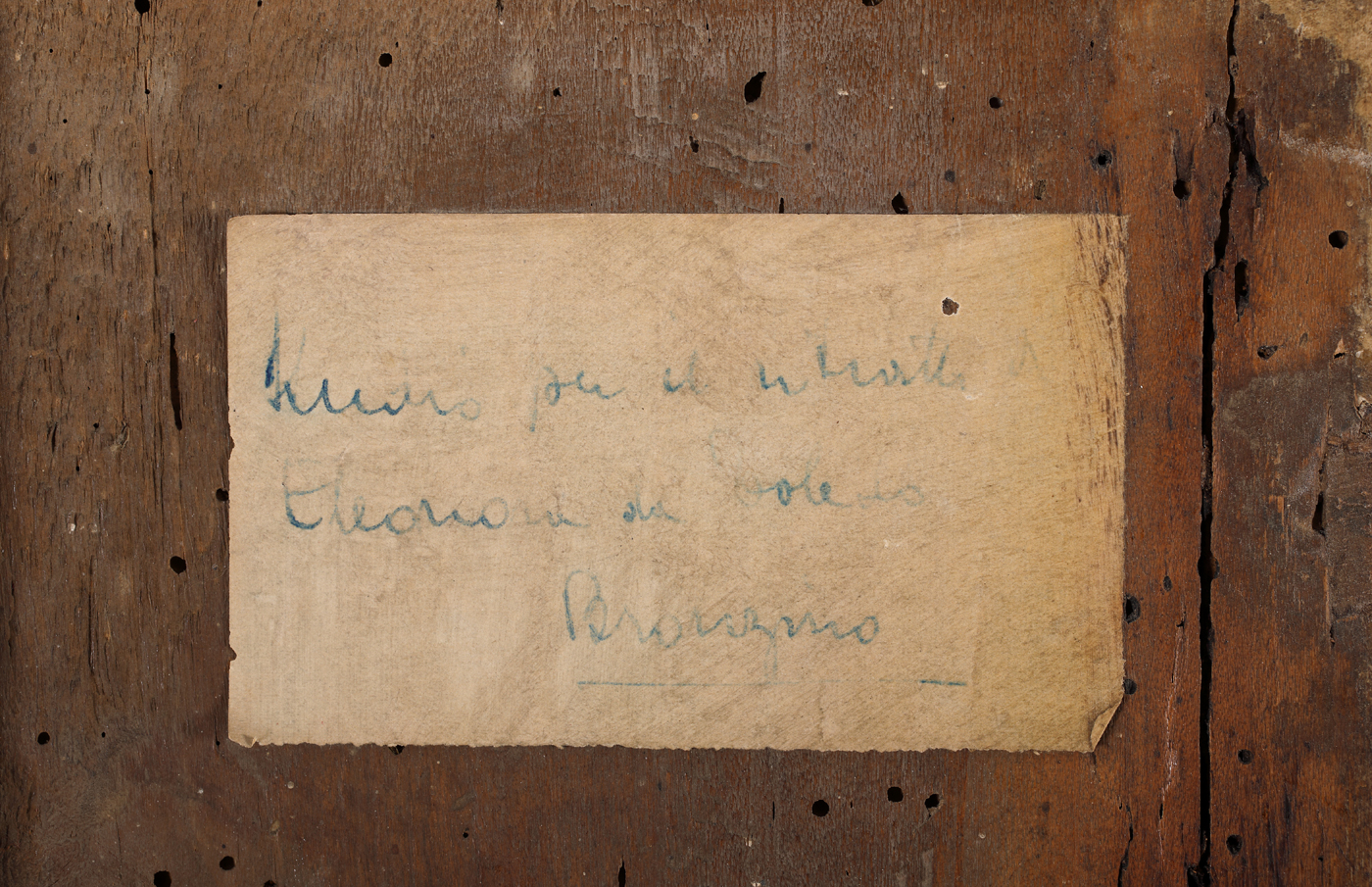 Elementi distintivi: due sigilli in ceralacca al verso con stemmi Medici - Toledo; una etichetta recente al verso con riferimento a "ritratto di Eleonora di Toledo", Bronzino