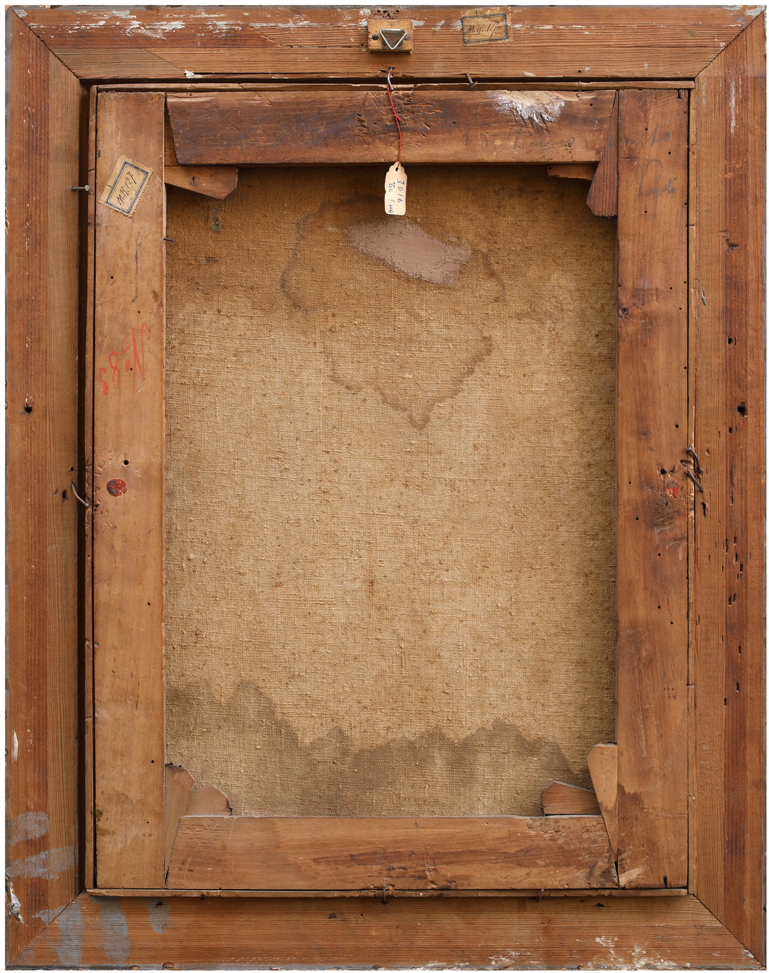Elementi distintivi: sul telaio, due etichette con indicazioni inventariali manoscritte "M.R.127" e "N. 83" manoscritto sul legno in colore rosso. Residui di un timbro in ceralacca