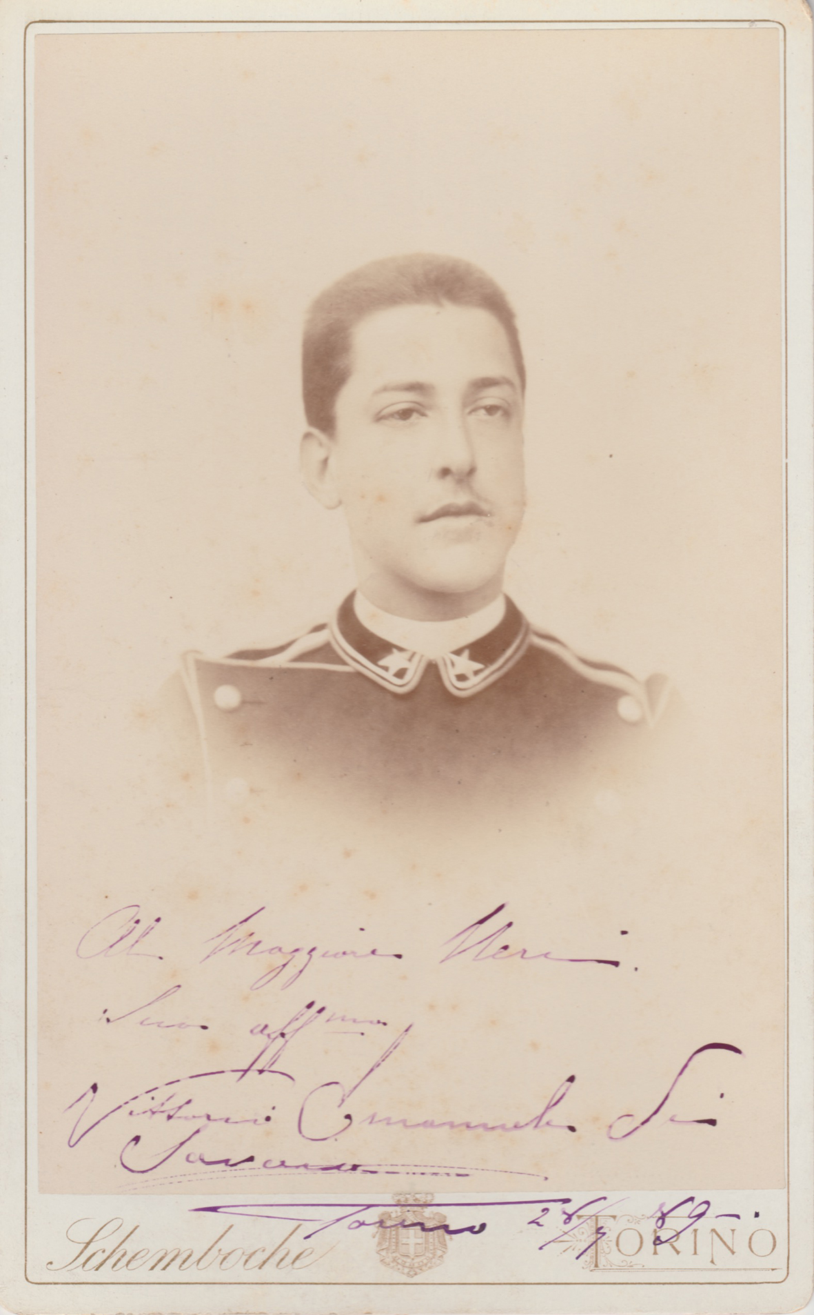 Dedica autografa, su ritratto fotografico, firmata dal Principe di Napoli e di Piemonte, immortalato in divisa militare. Datata 'Torino, 28/7 1889'. Fotografia Schemboche - Torino. Vittorio Emanuele III di Savoia è stato Re d'Italia (dal 1900 al 1946), Imperatore d'Etiopia (dal 1936 al 1943), Primo Maresciallo dell'Impero (dal 4 aprile 1938) e Re d'Albania (dal 1939 al 1943). Il suo lungo regno (46 anni) vide, oltre alle due guerre mondiali, l'introduzione del suffragio universale maschile (1912) e femminile (1945), delle prime importanti forme di protezione sociale, il declino e il crollo dello Stato liberale (1900-1922), la nascita e il crollo dello Stato fascista (1925-1943), la composizione della questione romana (1929), il raggiungimento dei massimi confini territoriali dell'Italia unita e le maggiori conquiste in ambito coloniale (Libia ed Etiopia). Vittorio Emanuele non ebbe un'infanzia molto felice, perché l'educazione di Casa Savoia, severa e di stampo militaresco, non favoriva l’espansività e gli slanci affettivi e perché nessuno dei suoi genitori si occupò mai di lui. Come suo precettore fu scelto il colonnello di Stato Maggiore Egidio Osio, che era stato militare all'ambasciata italiana a Berlino. Alcuni dicono che la severità di Osio ebbe effetti deleteri sul carattere del futuro sovrano, rendendolo ancora più insicuro e introverso; tuttavia questo fatto viene smentito anche dal rapporto di amicizia che il principe continuò a serbare con il suo precettore, intrattenendo una corrispondenza quasi giornaliera e difendendolo dalle accuse rivoltegli. Elevato al rango regio, frequentò le sedute d'inaugurazione dell'Accademia Nazionale dei Lincei, così come di altre associazioni di stampo scientifico, alle quali si avvicinava per i suoi interessi. Tra tutte le sue passioni, in ambito culturale, svettavano forse la numismatica, la storia e la geografia. Estimatore di William Shakespeare, parlava quattro lingue, tra cui il piemontese e il napoletano, ma non amava né il teatro, né i concerti. Al compimento dei vent'anni, Vittorio Emanuele essendo ormai diventato maggiorenne, fu assegnato al 1º Reggimento fanteria "Re" a Napoli, dove rimase per ben cinque anni. A Napoli strinse amicizia con il principe Nicola Brancaccio, instradandolo alla vita notturna napoletana. Per il giovane Principe il periodo napoletano fu forse il più felice della sua vita: imparò a parlare fluentemente il napoletano ed ebbe anche diverse amanti, tra cui la baronessa Maria Barracco. Un fatto poco noto è che durante il suo periodo a Napoli entrò in conflitto con il colonnello Luigi Cadorna e tra i due nacque una feroce antipatia che durò tutta la vita e che ebbe evidenti conseguenze vent'anni dopo, durante la Grande Guerra. La questione del matrimonio del giovane principe divenne oggetto di estrema preoccupazione per Umberto I di Savoia e Margherita, venne, dunque, combinato il matrimonio tra il Principe di Napoli e una Principessa montenegrina, Elena. Il fidanzamento tra Vittorio ed Elena fu una vera e propria "congiura", alla quale parteciparono praticamente tutte le case regnanti europee, e l'unico a esserne all'oscuro fu proprio il Principe. Il primo incontro tra i due avvenne a Venezia nel 1895: per sicurezza Elena era stata fatta accompagnare dalla sorella Anna, nell'eventualità che Vittorio preferisse l'una all'altra. Tuttavia la preferenza del Principe andò proprio a Elena, che era riuscita a colpirlo con la sua bellezza. Morì ad Alessandria il 28 dicembre 1947, il giorno dopo la firma della Costituzione italiana.