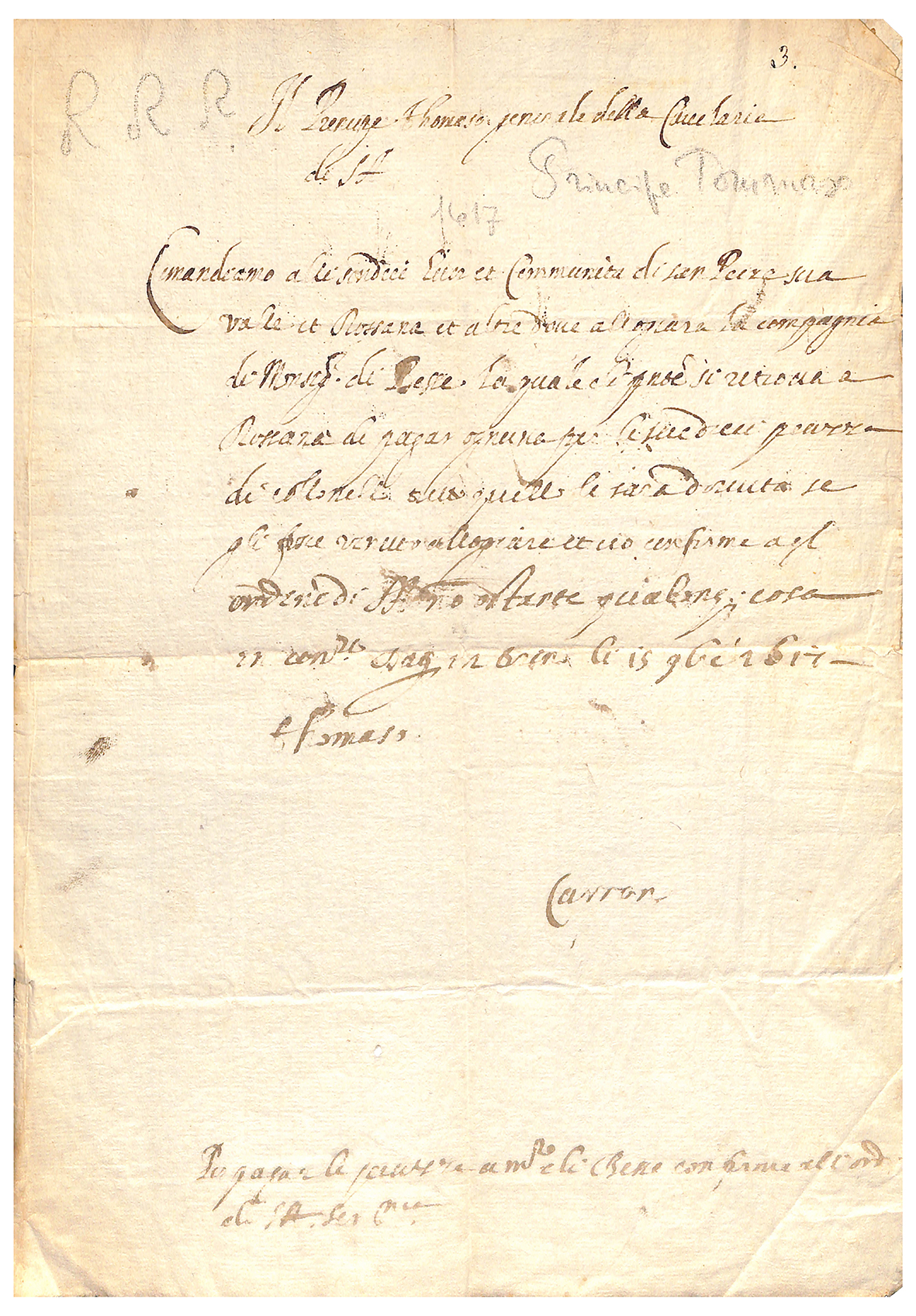 Interessante lettera manoscritta intestata "Il Prencipe Thomaso generale della Cavaleria di Sua Altezza" a firma "Thomaso" datata 'li 15 novembre 1617'. Tommaso Francesco di Savoia, più spesso citato semplicemente come Tomaso di Savoia era figlio di Carlo Emanuele I e di Caterina Michela d'Asburgo ed è stato il capostipite del ramo Savoia-Carignano. Nel 1620 divenne infatti, per disposizione del padre, Principe di Carignano dando origine alla linea dei Savoia-Carignano, dalla quale discenderanno i futuri Re d'Italia di Casa Savoia. Nella missiva: "Comandano... communità di San Peire sua valle et Rossana et altre dove allogiarà la compagnia di Monsignor di Besse" di pagare il tributo dovuto per sostentare l'esercito. L'episodio si colloca nella fase finale della prima guerra del Monferrato, durata dal 1613 a 1617, scoppiata a causa di una crisi nella successione del Monferrato, che vede scontrarsi gli opposti interessi del Piemonte, della Francia, degli Asburgo e di Venezia. Nel settembre del 1616, nell'ultima fase di guerra, Carlo Emanuele I mandò un nuovo esercito supportato da forze francesi. Le forze sabaude sconfissero inizialmente gli Spagnoli e presero Alba. Le truppe di don Pedro però attaccarono Vercelli, conquistandola dopo 2 mesi d'assedio. A questo punto, la situazione politica si era ribaltata: Francia e Spagna volevano ristabilire gli equilibri internazionali, mentre i Veneziani non volevano un eccessivo potenziamento sabaudo. Fu quindi stabilito un capitolato di pace a Parigi il 6 settembre 1617, e poi di nuovo a Madrid il 26 settembre, in base al quale i Savoia dovevano accettare che il Monferrato andasse a Ferdinando Gonzaga (1587 –1626), VI duca di Mantova e dunque Duca del Monferrato. Soluzione che fu ratificata con la pace di Pavia del 9 ottobre 1617.
