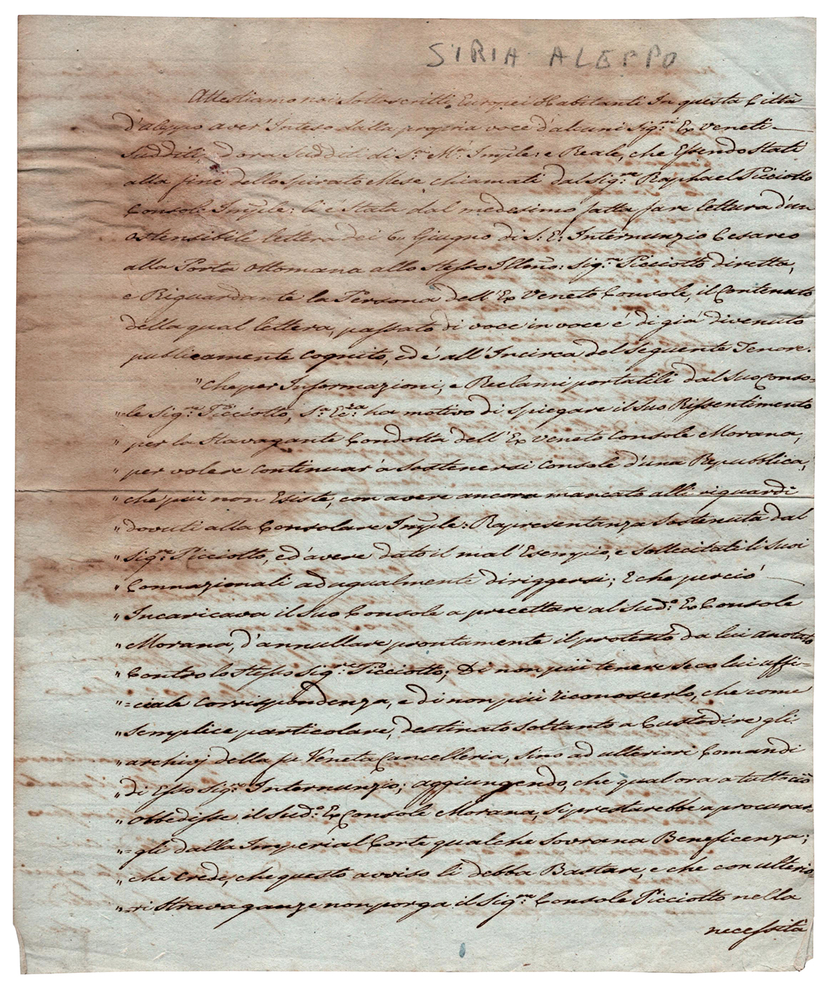 Lettera autografa firmata, Aleppo 9 agosto 1798 del mercante della Compagnia delle Indie ed Agente Generale in Aleppo per S.M. il Re della Gran Bretagna, nella quale viene riportato il testo di una missiva dell'Internunzio Cesareo alla Porta alla Porta Ottomana "riguardante la persona dell'ex veneto Console"" nella città siriana di Aleppo, per la stravagante condotta" di quest'ultimo (il console Morana) "per voler continuare a sostenersi Console d'una Repubblica che più non esiste, con aver ancora mancato alli riguardi dovuti alla Consolare Imperiale Rappresentanza sostenuta dal Sig.re Picciotto...". Due pagine in-8. Macchia di umidità non compromette la lettura del testo. La Repubblica di Venezia era scomparsa l'anno precedente, con il celebre Trattato di Campoformio del 18 ottobre 1797.