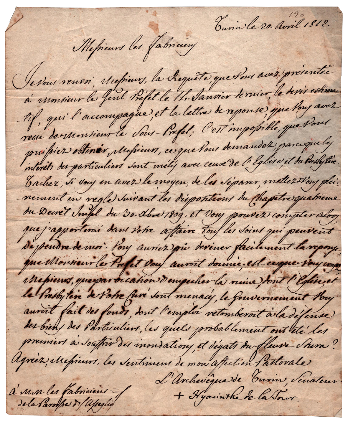Lettera autografa firmata datata "Turin le 20 Avril 1812" dell’ecclesiastico agostiniano - arcivescovo di Sassari, e in seguito di Torino, nominato Conte dell’Impero da Napoleone nel 1808 - diretta a 'Les Fabriciens de la Paroisse de Usseglio' ai quali comunica di non potere soddisfare alcune loro richieste di tipo economico per alcuni lavori agli edifici della chiesa. "C’est impossible que vous puissiez obtenir, Messieurs, ce que vous demandez, parce que les interêts des particuliers sont mélés avec ceux de l’eglise et du Presbytère...". Una pagina in-8. Indirizzo autografo e traccia di sigillo alla quarta.