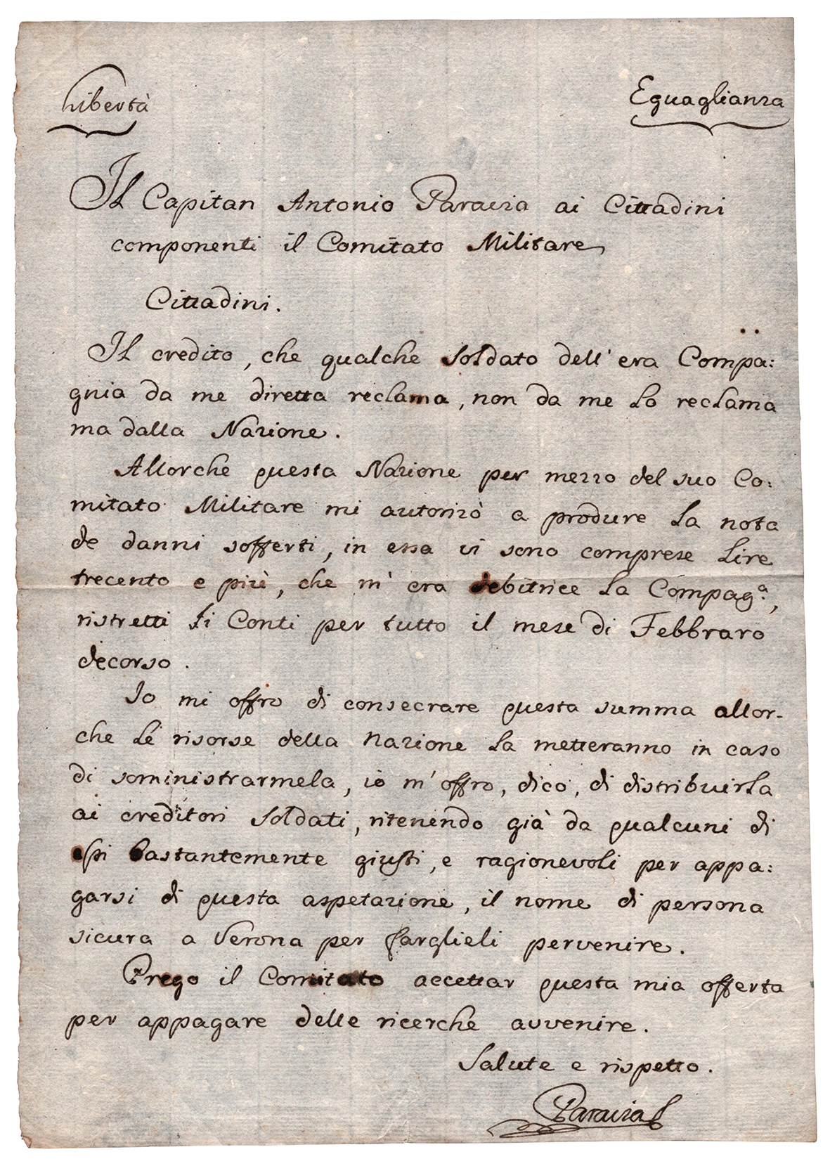 Documento autografo (senza data) dell'ufficiale della Repubblica di Venezia Antonio Paravia, nel quale si impegna all'elargizione di lire trecento alla sua compagnia di soldati, coinvolgendo il Comitato Militare istituito nella Repubblica di Venezia durante l'occupazione francese (12 mag.-18 ott. 1797) e governi democratici (1797-1798). Si noti il bel richiamo alle parole chiave della rivoluzione francese, "Libertà" e "Eguaglianza". Le difficoltà finanziarie avevano infatti ridotto la cassa destinata alle paghe dei soldati, facendo divampare le diserzioni. Analoghi documenti sono stati nominati da altri comandanti veneziani. "Allorché questa nazione per mezzo del suo Comitato mi autorizzò a produrre la nota de' danni sofferti...". "Io m'offro, dico, di distribuirla ai creditori soldati, ritenendo già da qualcuni di voi bastantemente giusti e ragionevole per appagarsi di questa aspettazione, il nome di persona sicura a Verona per farglieli pervenire...". Il capitano Antonio Paravia fu ufficiale di fanteria della Serenissima iniziando la sua carriera militare come cadetto alla scuola militare di Corfù. Fu imbarcato su vascelli della marina da guerra veneta e per tale motivo visitò gran parte del Mediterraneo orientale e centrale partecipando successivamente alla spedizione del Capitano da Mar Angelo Emo contro il Sultanato di Tunisi (1785/6). Negli anni che vanno dal suo arruolamento del 1754 fino al 1797 compliò un monumentale "Mio portafogli di viaggi, osservazioni e memorie e frammenti historici del mio tempo", ora custodito nella Biblioteca del Museo Correr di Venezia. In centinaia di pagine divise in sei corposi volumi si trovano testi, immagini e curiosità: storia antica, commerci, oggetti, usi e costumi, arte, zoologia e geografia. Le sue immagini a china e acquerello rappresentano luoghi, avvenimenti e cartografie, urbane e militari.