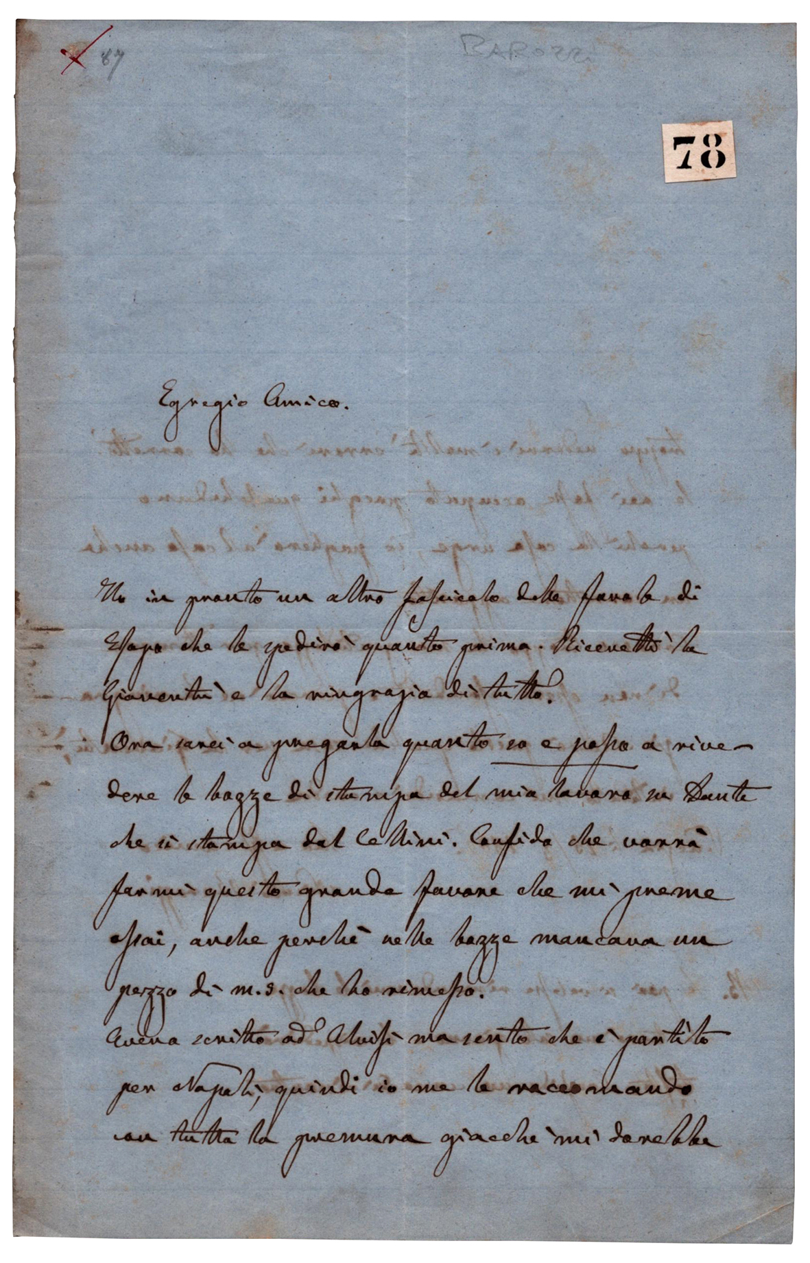 Lettera autografa firmata datata (Venezia il 15 marzo 1866) dello storico e patriota veneziano, conservatore del Museo Correr e direttore delle Gallerie di Palazzo Ducale, nella quale prega un amico di occuparsi della correzione delle bozze di un'opera che il Barozzi sta per pubblicare. "Ho in pronto un altro fascicolo delle favole di Esopo che le spedirò quanto prima. Ricevetti la Gioventù e la ringrazio di tutto. Ora son' a pregarla quanto so e posso a rivedere le bozze di stampa del mio lavoro su Dante che si stampa dal Cellini. Confido che vorrà farmi questo favore che mi preme assai, anche perché nelle bozze mancava un pezzo di m.s. che ho rimesso. Avevo scritto ad Alvisi ma sento che è partito per Napoli, quindi io me lo raccomando con tutta la premura...". Due pagine in-8, su carta azzurrina.