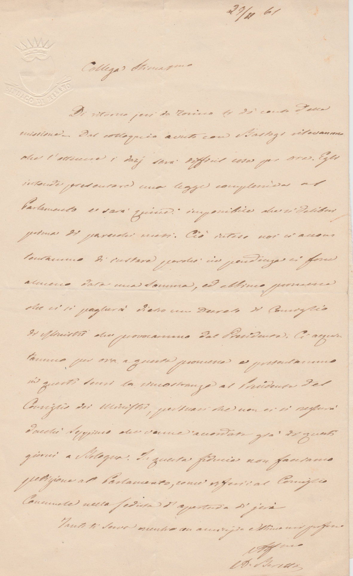 In gioventù si occupò dell'azienda agricola familiare; si diede poi, dal 1848, alla vita politica e fece parte del governo provvisorio di Milano. Emigrato in Piemonte, gli furono confiscati i beni. Dal 1860 al 1867 fu sindaco di Milano. Fu nominato senatore (1862) e conte (1871). Lettera autografa firmata, dat. 29.11.1861, relativa ad una questione amministrativa della quale rende edotto il corrispondente. "Di ritorno jeri da Torino ti dò conto della missione. Dal colloquio avuto con Bastogi rilevammo che l'ottenere i dazi sarà difficil cosa per ora. Egli intende presentare una legge complessiva al Parlamento e sarà quindi impossibile che si deliberi prima di parecchi mesi...". Una pagina in-8, su carta intestata.