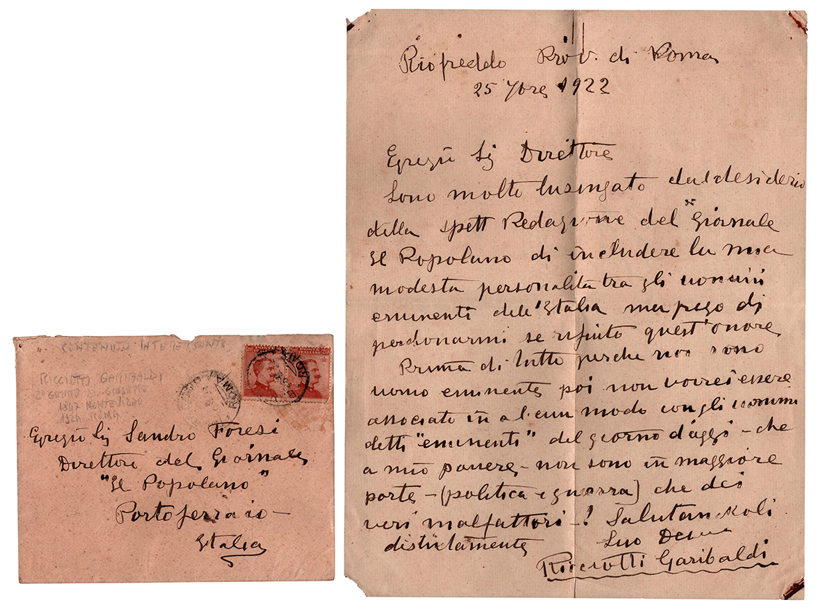 Lettera autografa firmata, datata Riofreddo Prov. di Roma 25 7bre 1922 del quarto figlio dell'Eroe dei due mondi, indirizzata a Sandro Foresi, direttore del Giornale 'Il Popolano' di Portoferraio, nella quale gli comunica che non intende essere incluso fra "gli uomini eminenti dell'Italia" presentati nel suddetto foglio. "Prima di tutto perché non sono uomo eminente, poi non vorrei essere associato in alcun modo con gli uomini detti "eminenti" del giorno d'oggi - che a mio parere - non sono in maggiore parte - (politica e guerra) che dei veri malfattori!...". Una pagina in-4, acclusa busta viaggiata con indirizzo autografo.