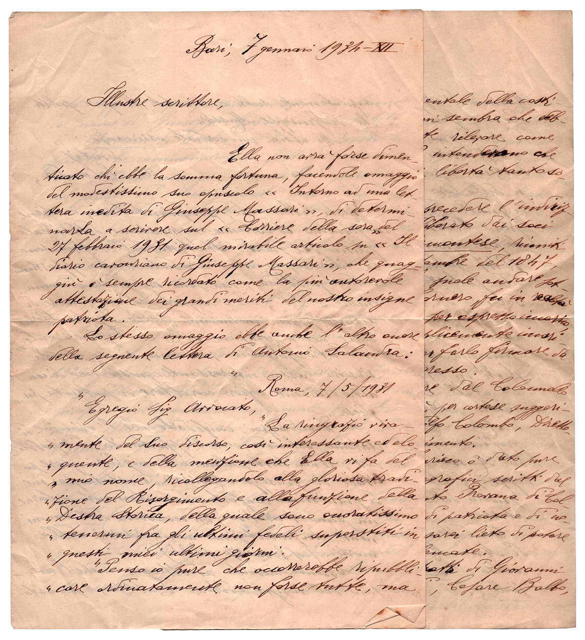 Lettera autografa firmata, Bari 7 gennaio 1934 - XII dell’avvocato e scrittore autore di opere sul Risorgimento ("Giuseppe Massari, Uomini di Destra", Bari, G. Laterza, 1934) nella quale scrive al corrispondente su alcune opere dedicate al patriota e uomo politico pugliese Giuseppe Massari (1821 - 1884) trascrivendo una lettera di encomio che ricevette alcuni anni prima da Antonio Salandra sulla sua attività di storico. "Ella non avrà forse dimenticato ch’ebbe la somma fortuna, facendole omaggio del modestissimo suo opuscolo 'Intorno ad una lettera inedita di Giuseppe Massari'di determinarla a scrivere sul 'Corriere della Sera' del 27 febbraio 1931 quel mirabile articolo "Il diario (…) di Giuseppe Massari…". Infante copia in calce una lettera che gli venne spedita da Salandra: "Lo stesso omaggio ebbe anche l’altro onore della seguente lettera di Antonio Salandra: "Roma, 7/5/1931, Egregio Sig. Avvocato, La ringrazio vivamente del suo discorso, così interessante ed eloquente, e della menzione ch'ella vi fa del mio nome, ricollocandolo alla gloriosa tradizione del Risorgimento e alla funzione della Destra Storica…". Sei pagine in-4.
