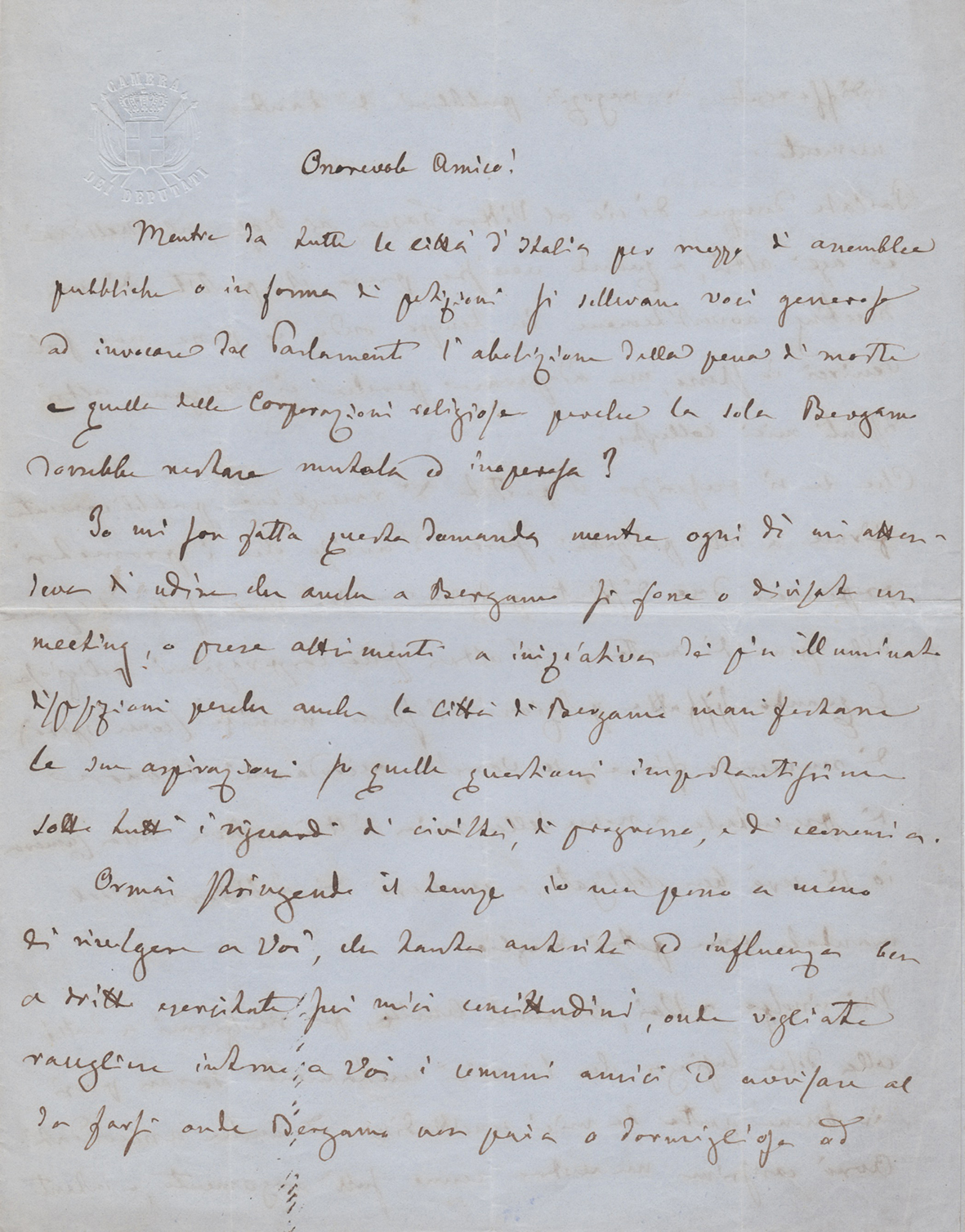 Lettera autografa firmata, datata "Torino li 11 Gennaio 1865" dell'uomo politico bergamasco, deputato al Parlamento d'Italia, diretta ad un collega, circa alcune iniziative politiche che intende proporre. "Mentre in tutte le città d'Italia per mezzo di assemblee pubbliche o in forma di petizioni si sollevan voci generose ad invocare dal Parlamento l'abolizione della pena di morte e quella delle Corporazioni religiose perché la sola Bergamo dovrebbe restare mutola ed inoperosa?...". Tre pagine in-8, su bifolio, carta intestata azzurrina.