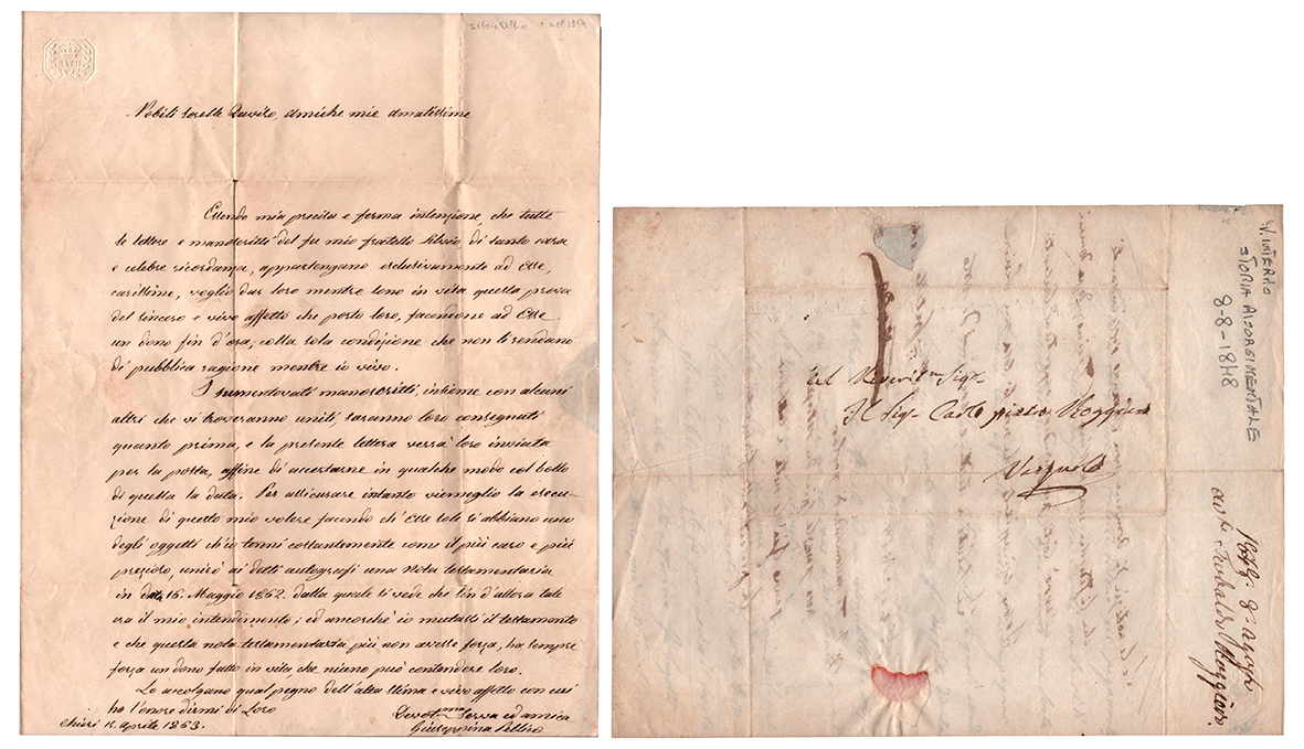 Lettera autografa firmata di Giuseppina Pellico (sorella del celebre patriota), datata "Chieri 15 aprile 1863" diretta a "Donna Luigia Cima" alla quale comunica di voler donare "tutte le lettere e manoscritti del fu mio fratello Silvio (...) colla sola condizione che non li rendano di pubblica ragione mentre io vivo". "Unirò ai detti autografi una nota testamentaria in data 16 maggio 1862, dalla quale si vede che fin d'allora tale era il mio intendimento...". Una pagina in-8, su bifolio, indirizzo autografo, timbri postali alla quarta. E' unita lettera autografa firmata del patriota Teobaldo Roggiero datata 8 agosto 1848 al fratello Carlo Pietro, relativa alle concitate fasi successive alla sconfitta di Custoza dell'esercito sabaudo contro gli Austro-Ungarici. "La causa d'Italia è perduta. La capitolazione fatta da Radetzky col nostro Re...". Tre pagine in-8, su bifolio.