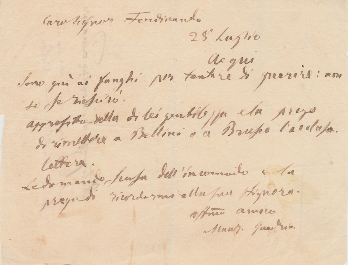 Lettera autografa firmata, senza anno, 'datata 25 Luglio Acqui' di Maurizio Quadrio, patriota, segretario del triumvirato Mazzini-Saffi-Armellini della Repubblica Romana (1849) e direttore del foglio repubblicano 'L'Unità italiana' (1859-1871). Quadrio nasce a Chiavenna nella famiglia che vantava una lunga e gloriosa storia, annoverando tra i propri avi Stefano Quadrio, condottiero del XV secolo. Maurizio Quadrio frequenta l'Università di Pavia e durante gli studi inizia ad avere i primi contatti con l'associazione segreta carbonara dei 'Federati'. Nel 1820 viene imprigionato per la prima volta per aver manifestato a favore dei moti nel Napoletano. Il 16 marzo 1821 si arruola nel 'Battaglione della Minerva' e accorre in Piemonte dove nel frattempo erano scoppiati i moti liberali. A seguito del fallimento delle sollevazioni, è costretto all'esilio e si trasferisce a Genova dove incontra Giuseppe Mazzini. Da Genova passa alla Spagna, poi alla Francia e infine alla Svizzera. Torna in Lombardia per poi fuggire nuovamente grazie ad un passaporto falso. La sua vita lo porta quindi ad Odessa in Russia, attuale Ucraina, dove lavora dando lezioni private e come precettore di nobili. Dopo un breve soggiorno in Svizzera rientra in Italia per consegnarsi agli austriaci e viene condannato a morte, ma la pena viene commutata in sei mesi di carcere dalle autorità austriache. Scontata la pena e ancora sotto la sorveglianza austriaca si sposta a Chiuro, il paese dei suoi avi, dove nel 1836 si rende utile assistendo i colpiti dal colera che infieriva in Valtellina. Quando nel marzo 1848 la notizia dello scoppio delle Cinque giornate di Milano giunge in Valtellina, si reca immediatamente a Milano, dove il governo provvisorio lo elegge commissario per la Valtellina. Dopo questa esperienza polita fugge a Lugano, in Svizzera, dove incontra nuovamente Mazzini e collabora alla preparazione della insurrezione della Val d'Intelvi dell'ottobre 1848. Nel gennaio del 1849 a Roma viene nominato segretario privato del triumvirato (Mazzini, Armellini e Saffi). Nel 1859 divenne direttore del giornale repubblicano-mazziniano 'L'unità italiana' fino al 1871 e l'anno seguente dirigere il giornale 'L'emancipazione', altro storico giornale mazziniano. La missiva scritta durante un periodo di guarigione, probabilmente alle terme di Acqui Terme, è diretta ad un "Caro Signor Ferdinando". Quadrio, oltre a spiegare le sue condizioni di salute chiede al destinatario se può mandare ad un certo Bellini e/o a Vincenzo Brusco Onnis, giornalista e patriota italiano. Brusco Onnis durante il periodo da pubblicista presso il giornale 'La Democrazia', inercalò l'attività con viaggi in Svizzera durante i quali ebbe modo di conoscere Quadrio: "Sono qui ai fanghi per tentare di guarire: non so se riuscirò. Approfitto della di lei gentilezza e la prego di rimettere a Bellini e/o? a Brusco l'acclusa lettera...". Brusco Onnis lavorò con Quadria come condirettore del giornale 'L'unità Italiana'. Una pagina in-16 obl. Nota di altra mano al verso.
